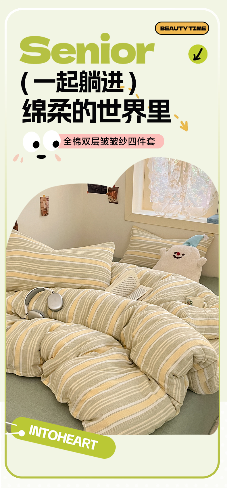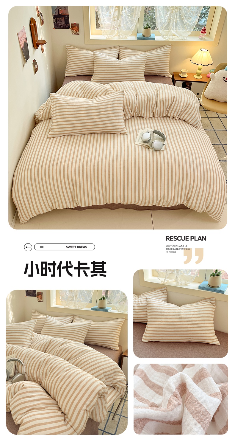 艾咪-Amy ntmy 2025新款条纹款全棉双层皱皱纱四件套 时予黄绿