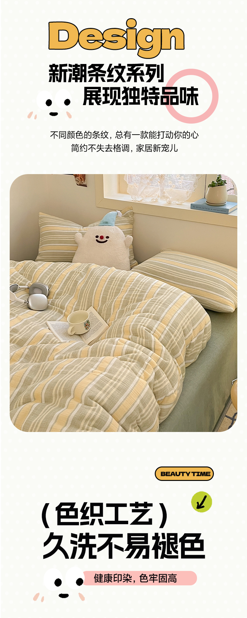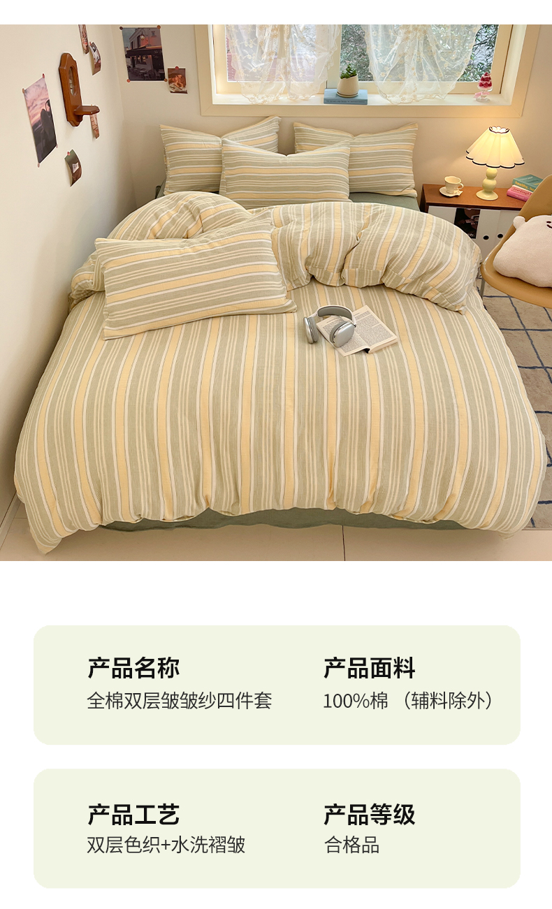 商品名称:艾咪-Amy ntmy 2025新款条纹款全棉双层皱皱纱四件套 时予黄绿