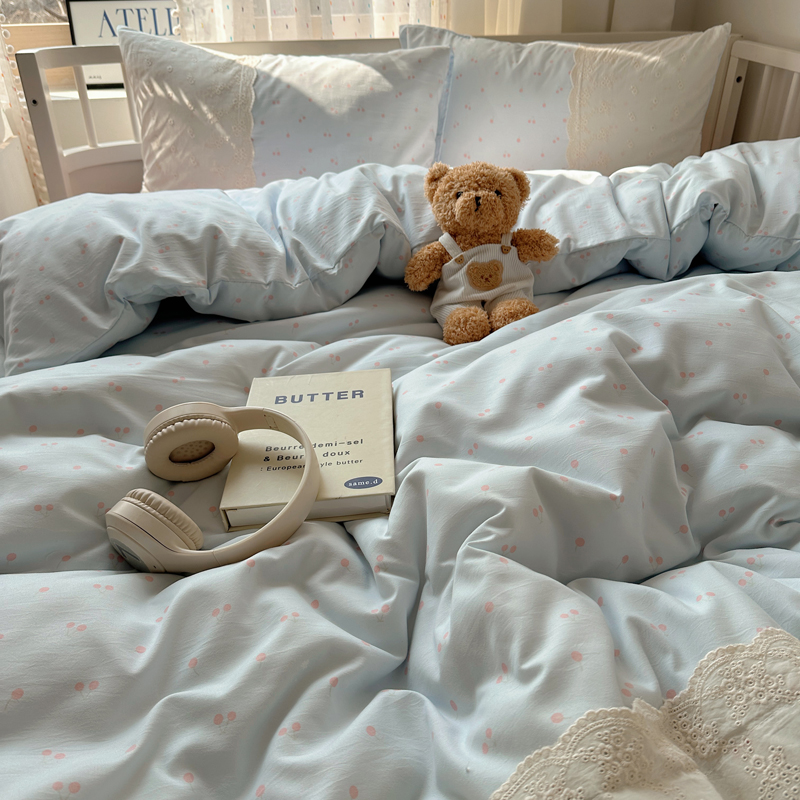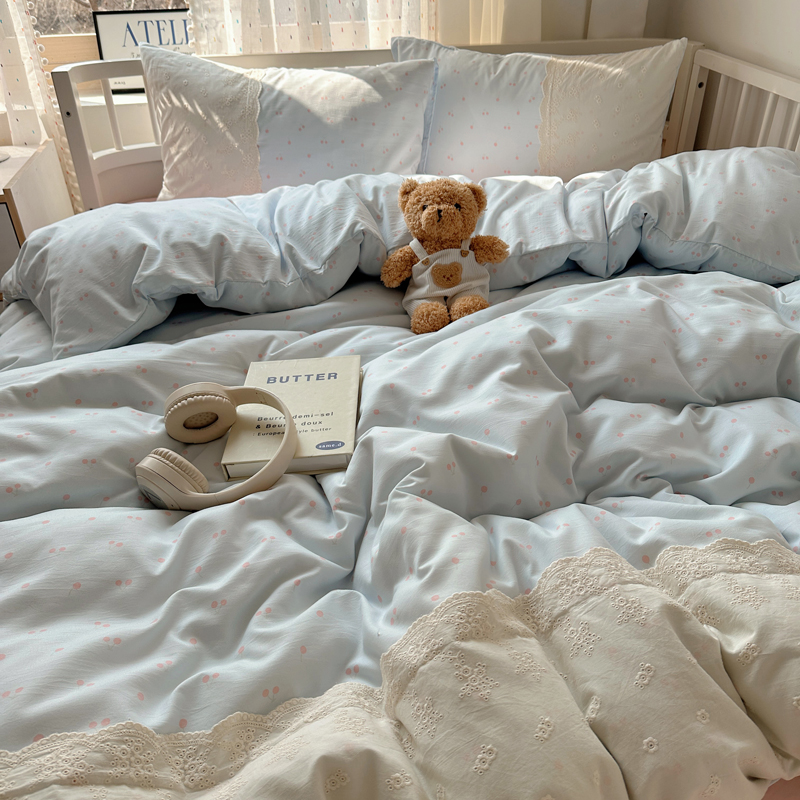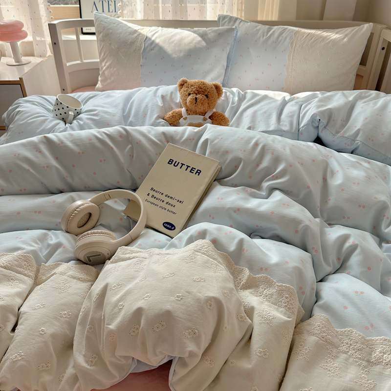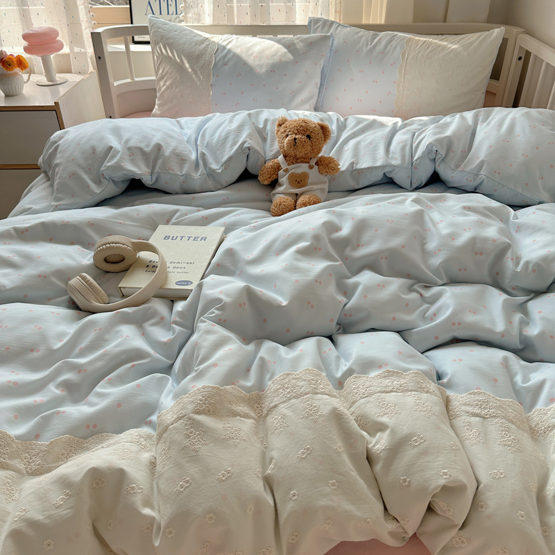 商品名称:顾里家纺 2025新款简约小资系列云感双层纱四件套 蓝粉樱桃