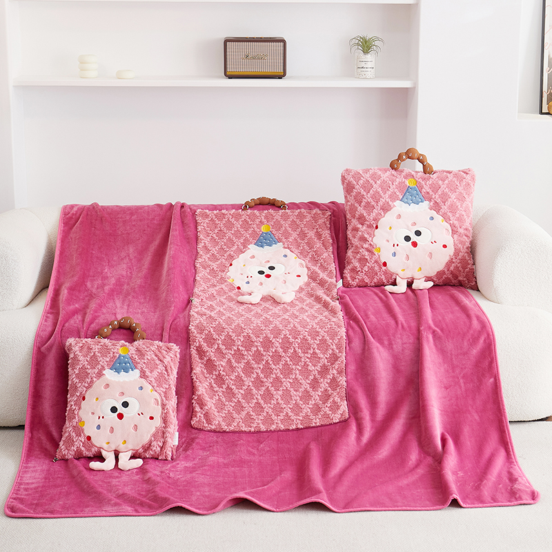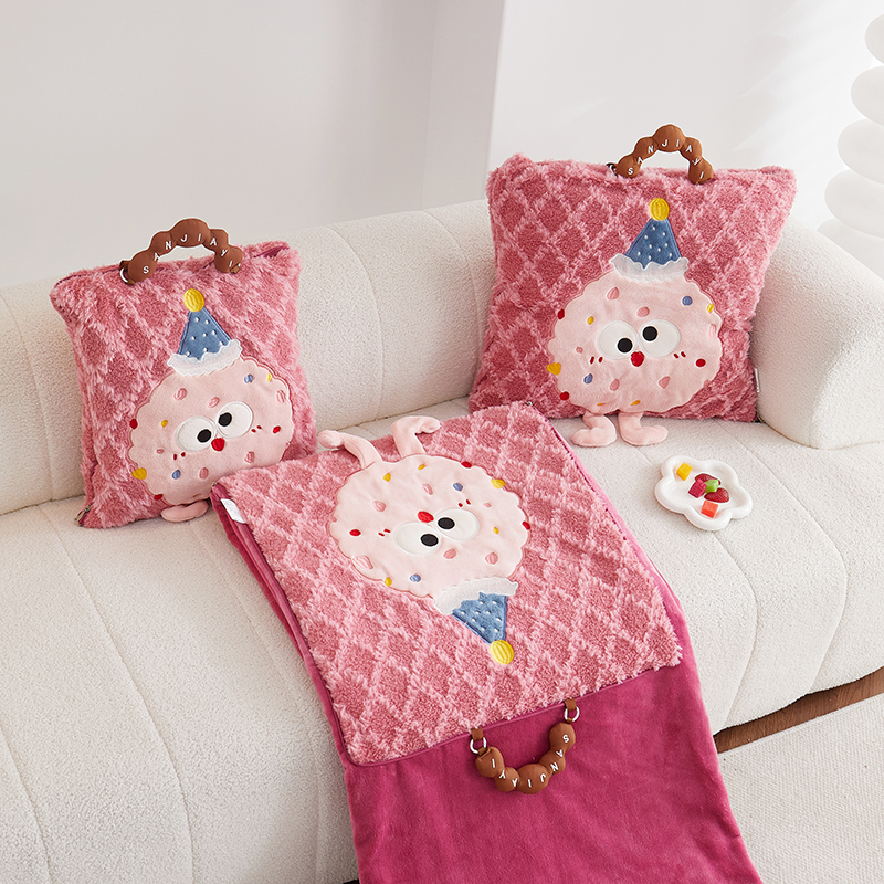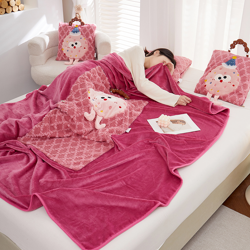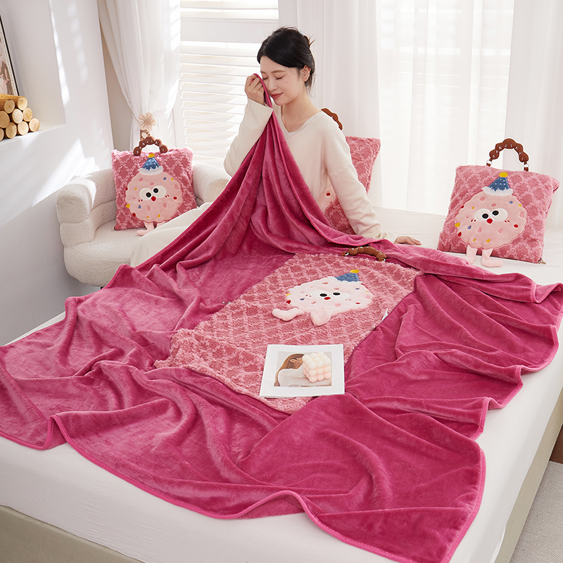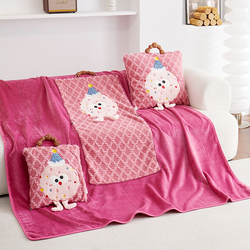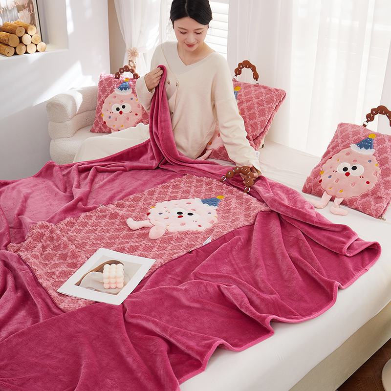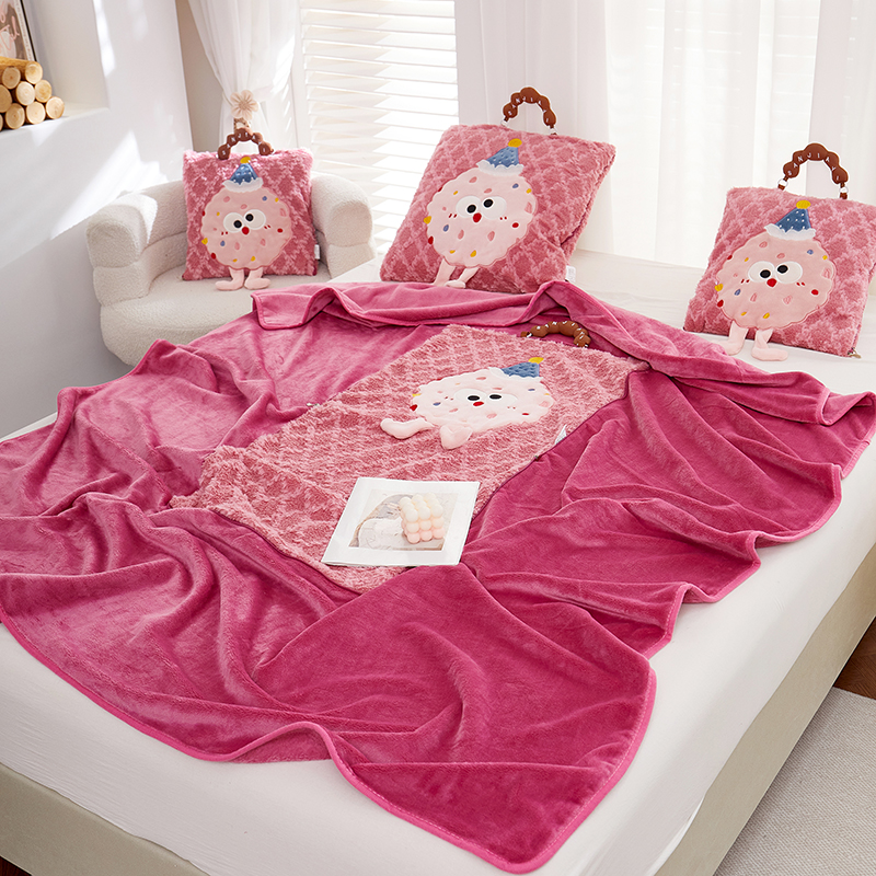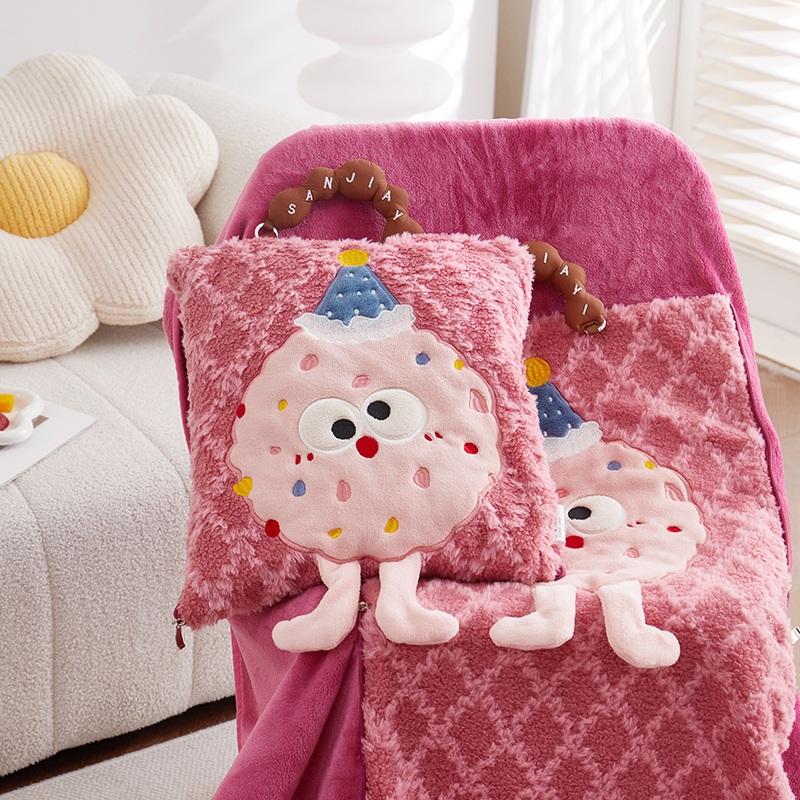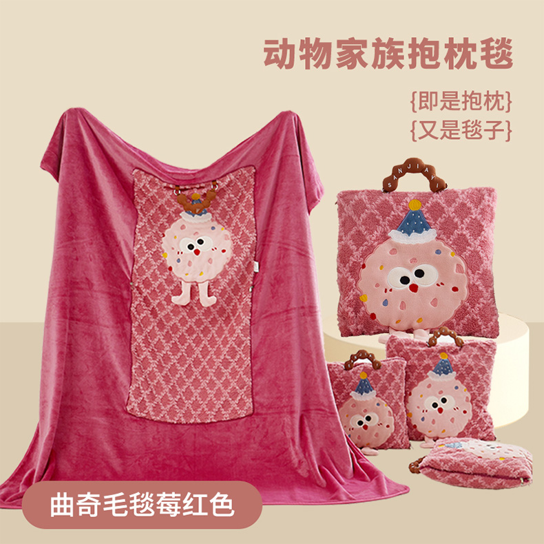 商品名称:古本家居 2025新款贴布立体卡通刺绣曲奇抱枕毯抱枕被 曲奇毛毯-莓红色
