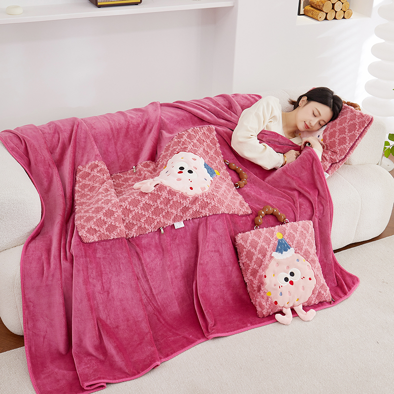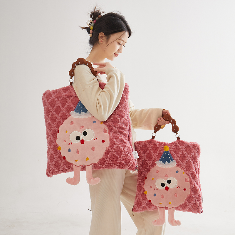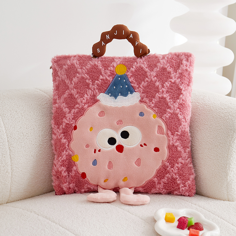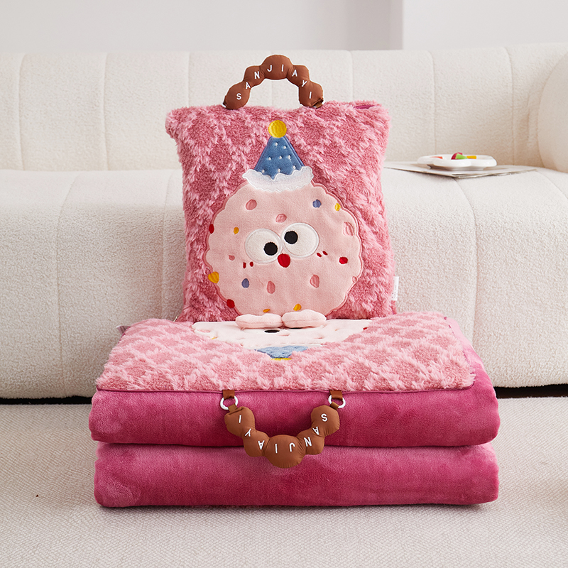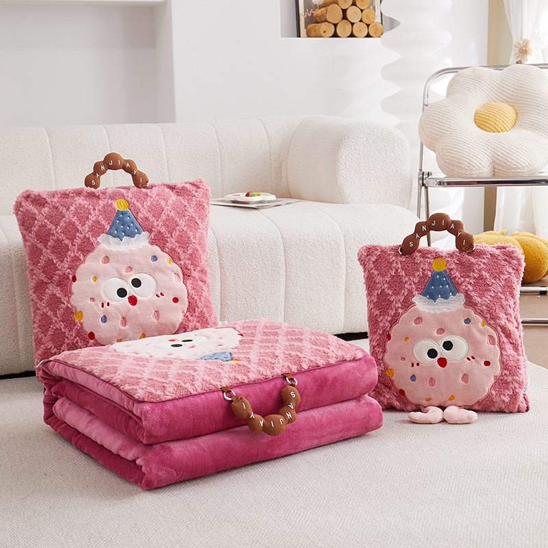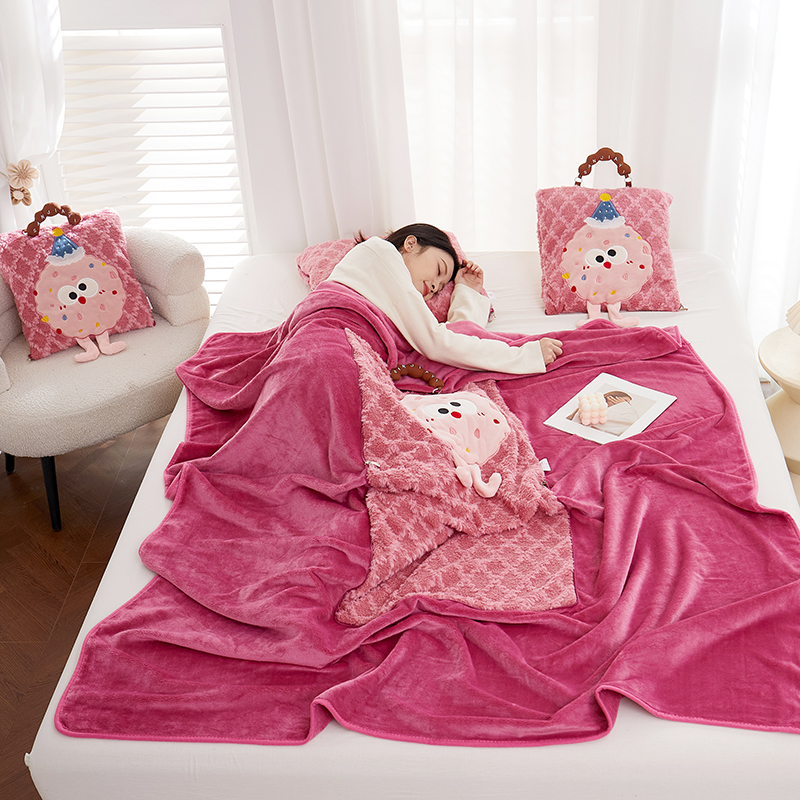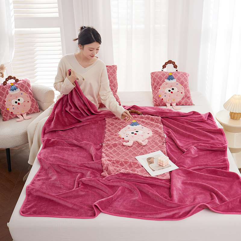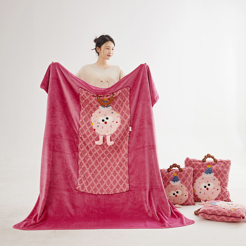 商品名称:古本家居 2025新款贴布立体卡通刺绣曲奇抱枕毯抱枕被 曲奇毛毯-莓红色