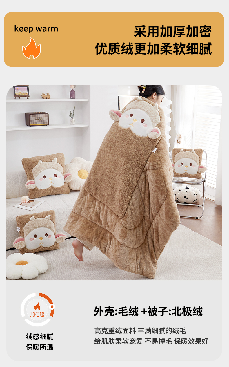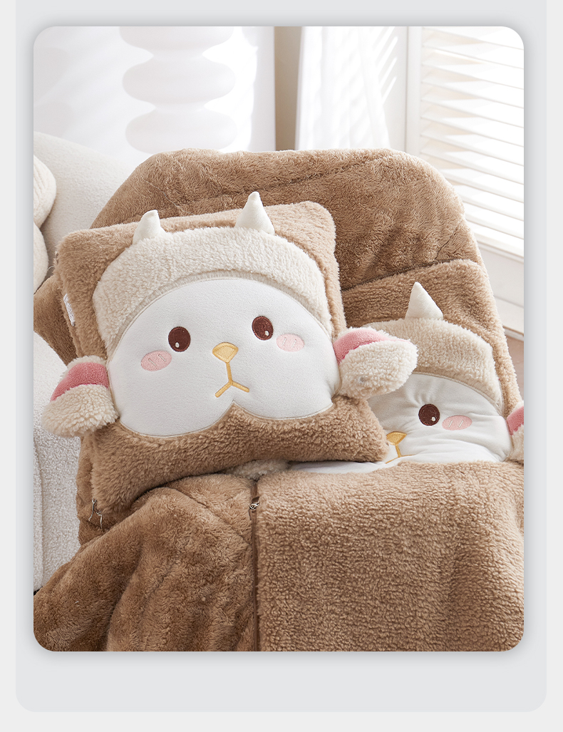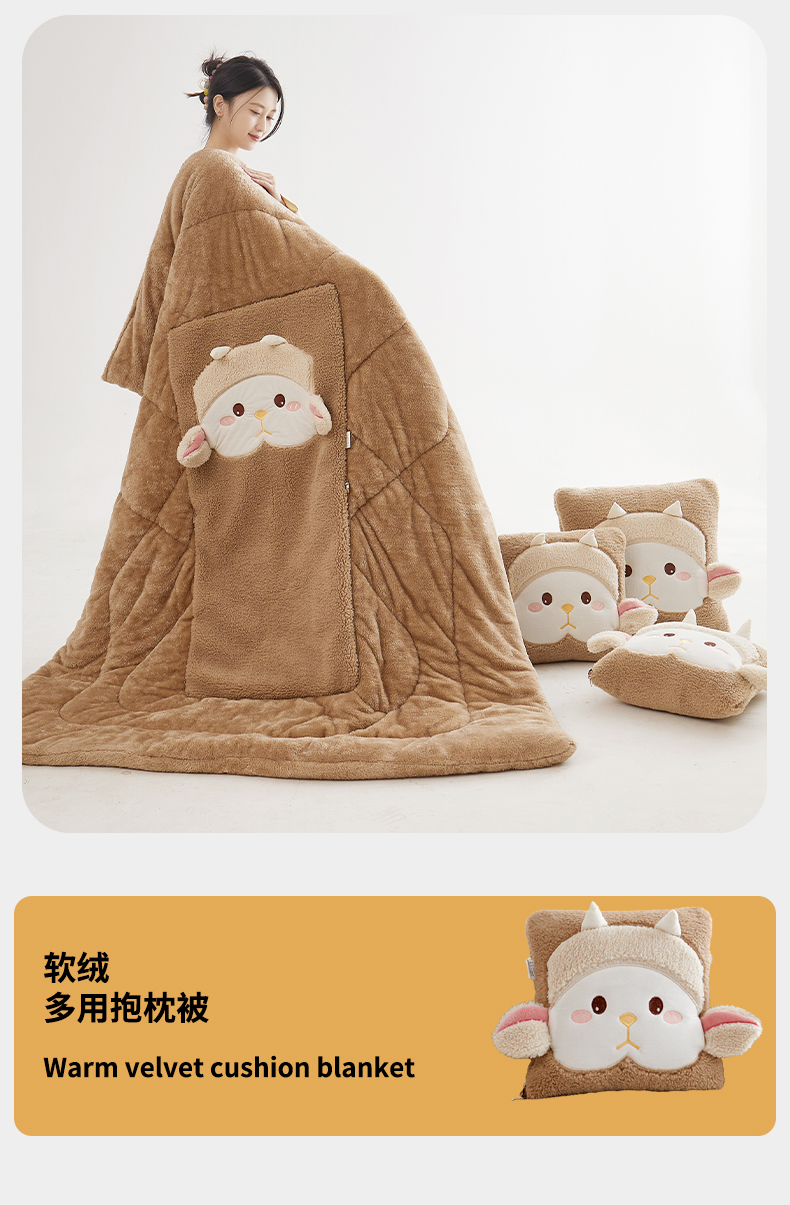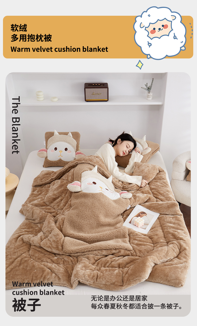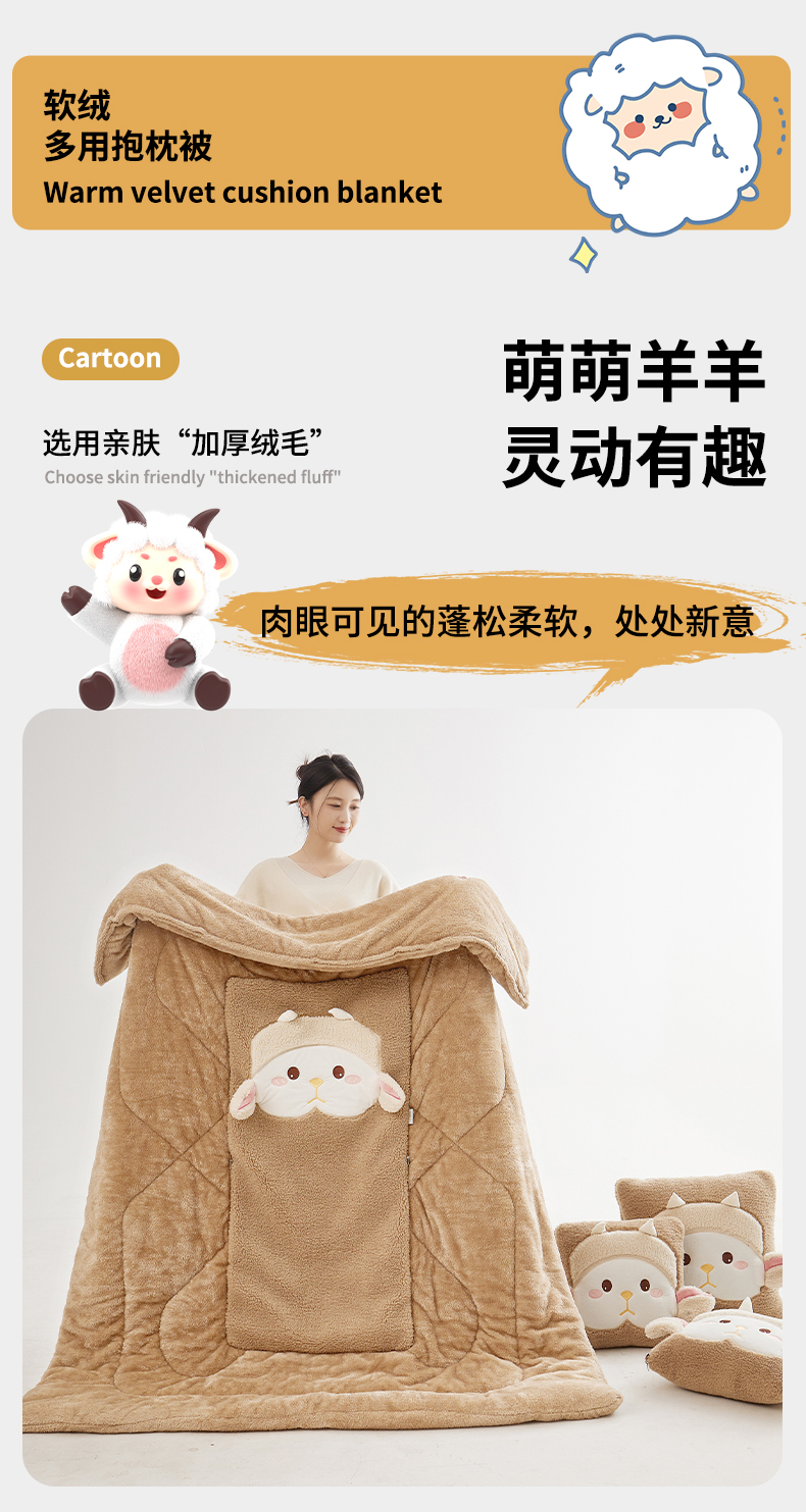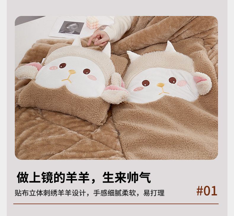 商品名称:古本家居 2025新款羊绒贴布立体刺绣萌萌羊抱枕被 萌萌羊驼色