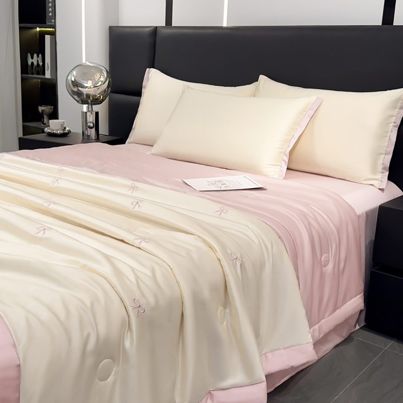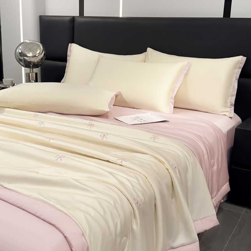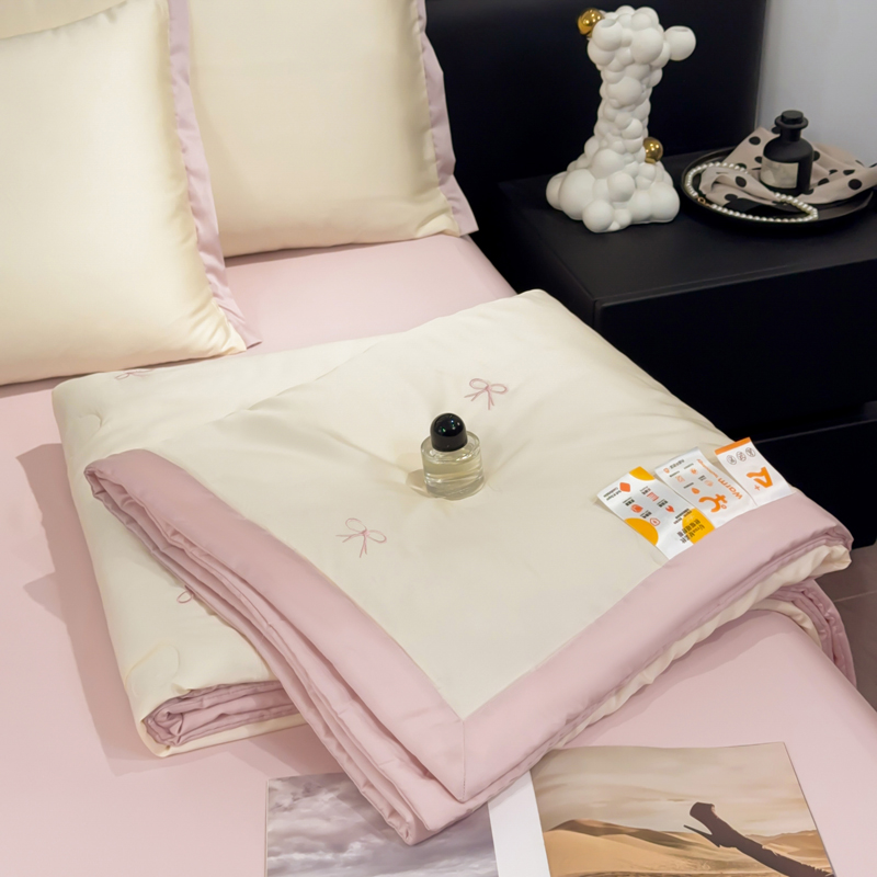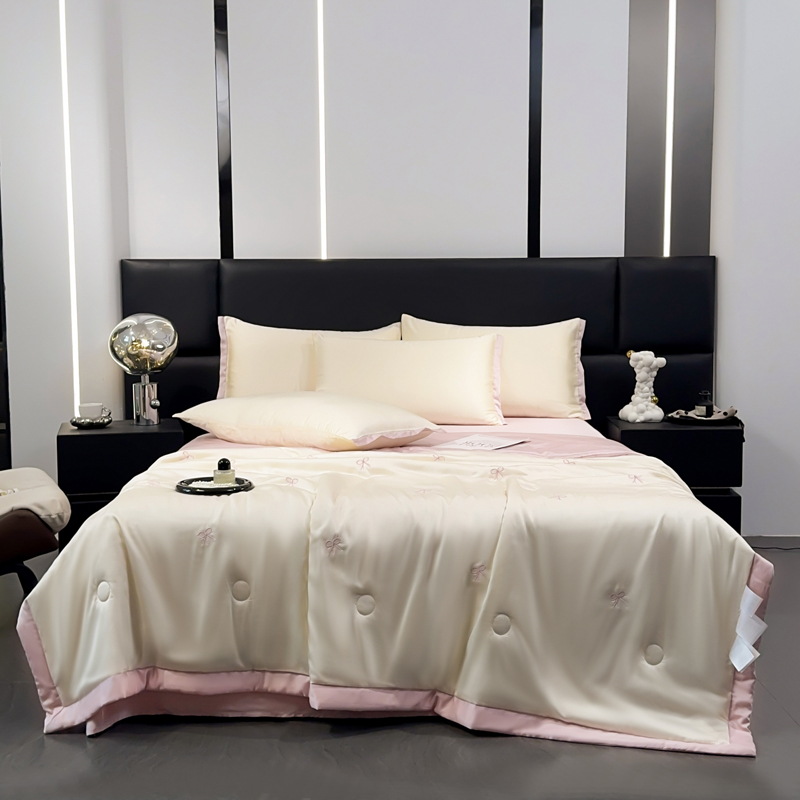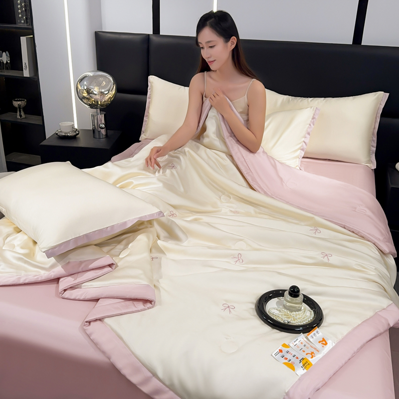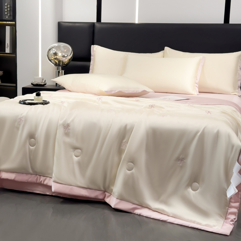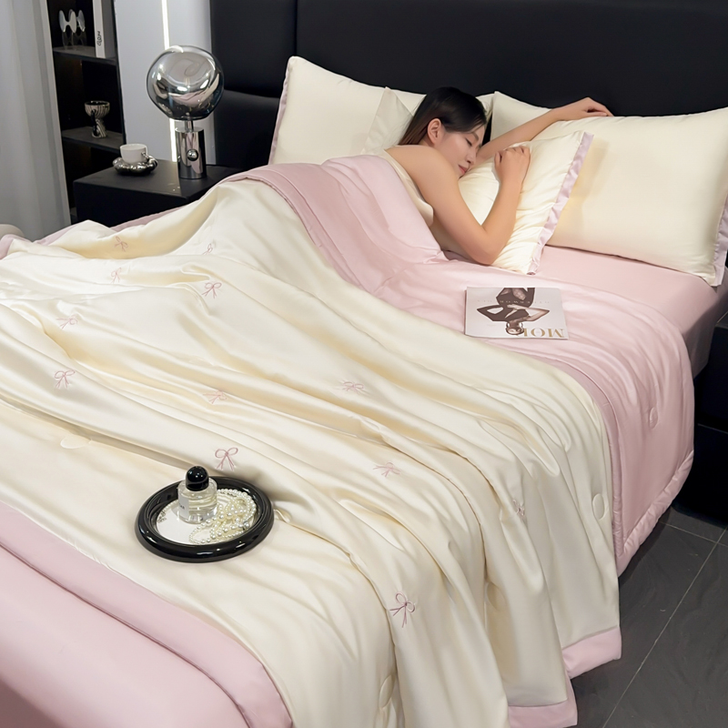 2025新款清凉舒适水洗冰丝刺绣夏被四件套 蝴蝶结-奶白粉