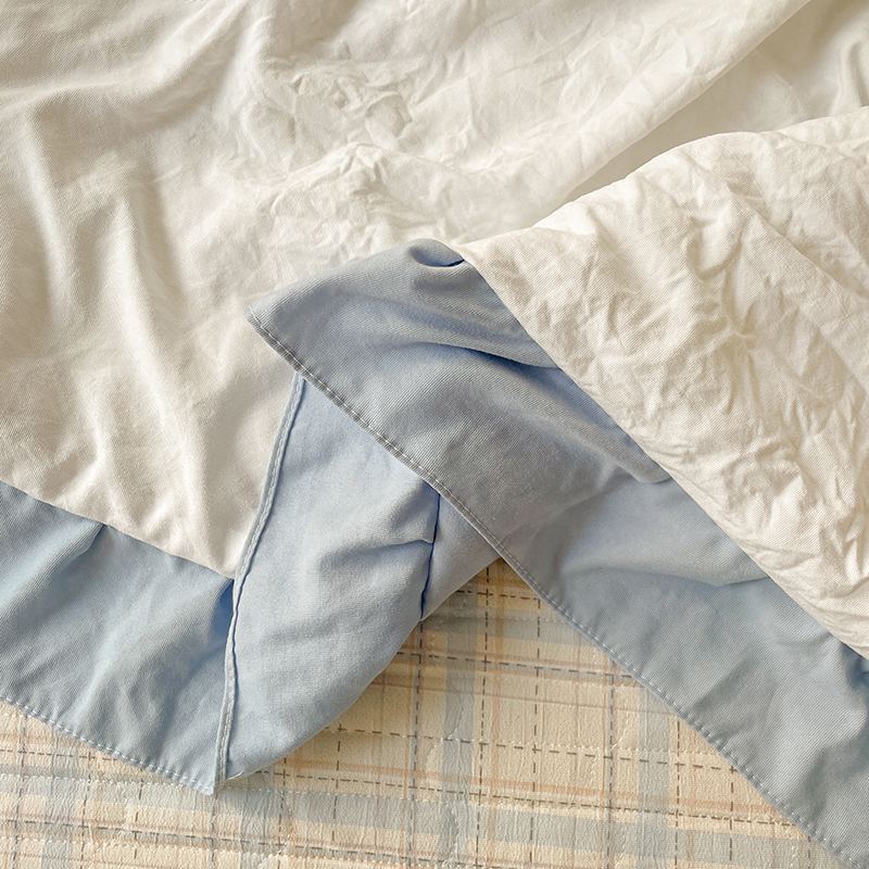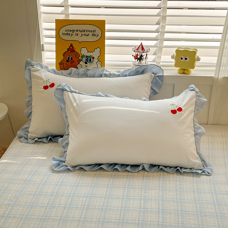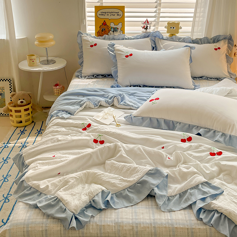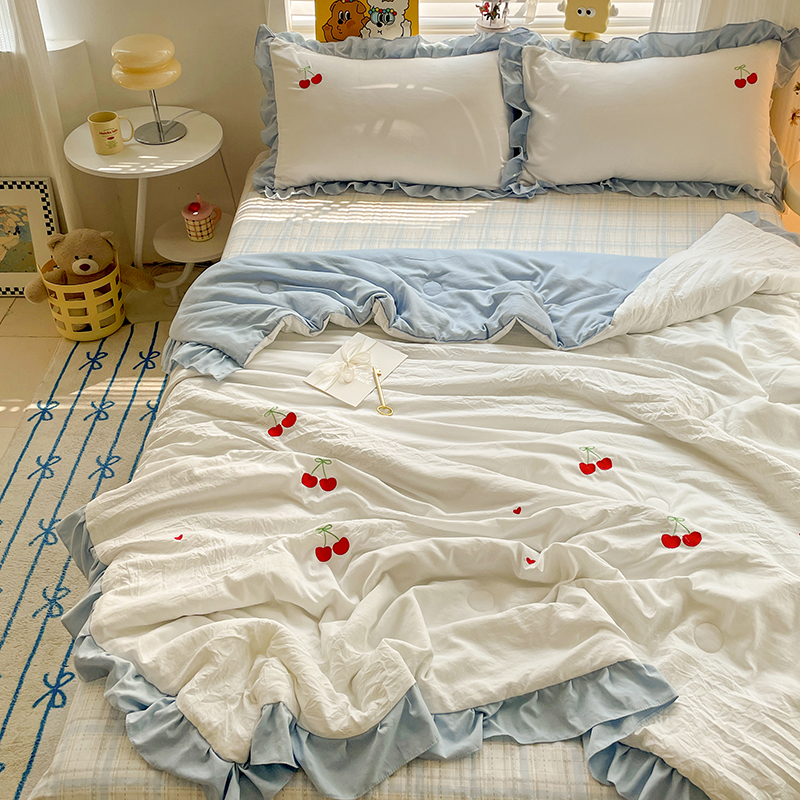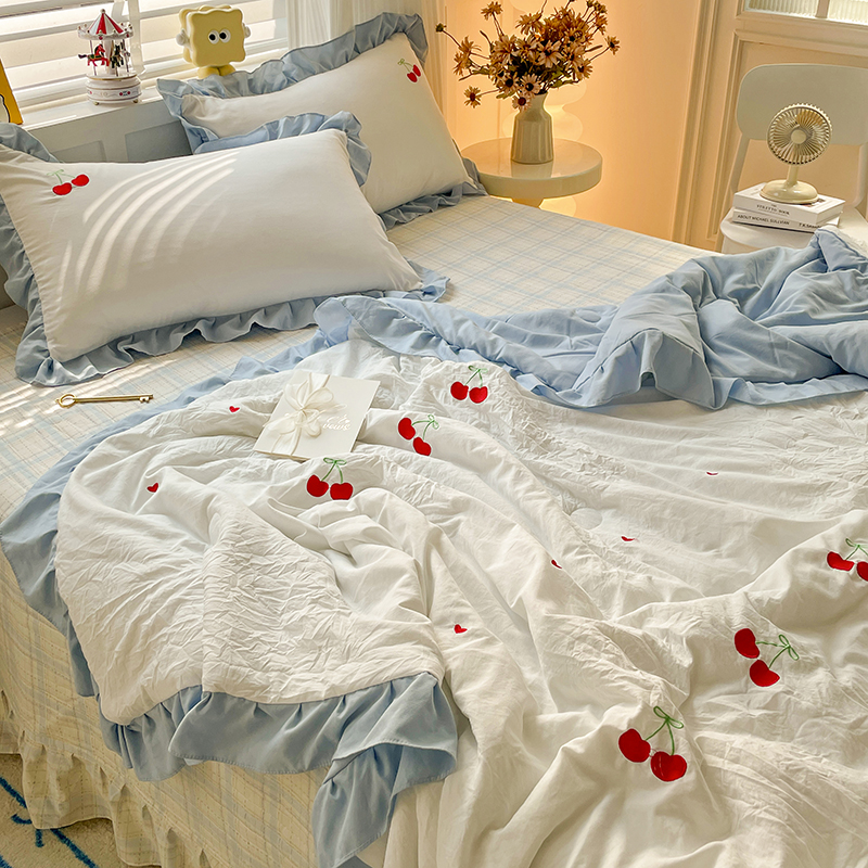 2025新款绣花双层纱针织棉夏被床盖四件套全棉夏被四件套 樱桃蓝格
