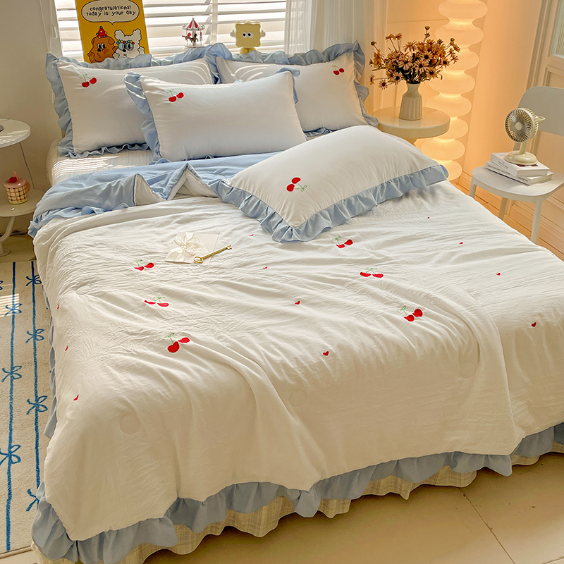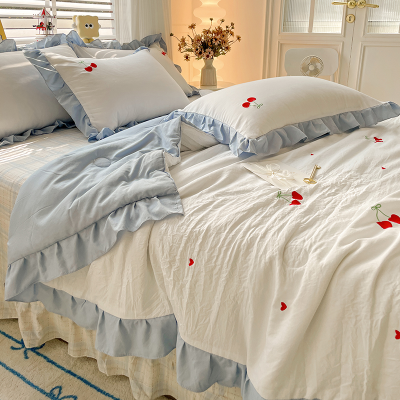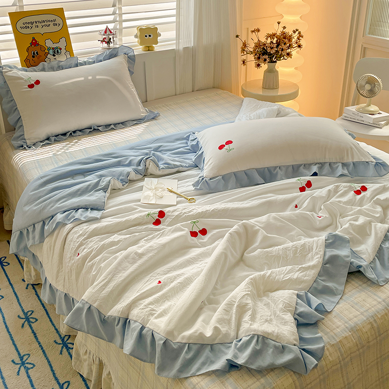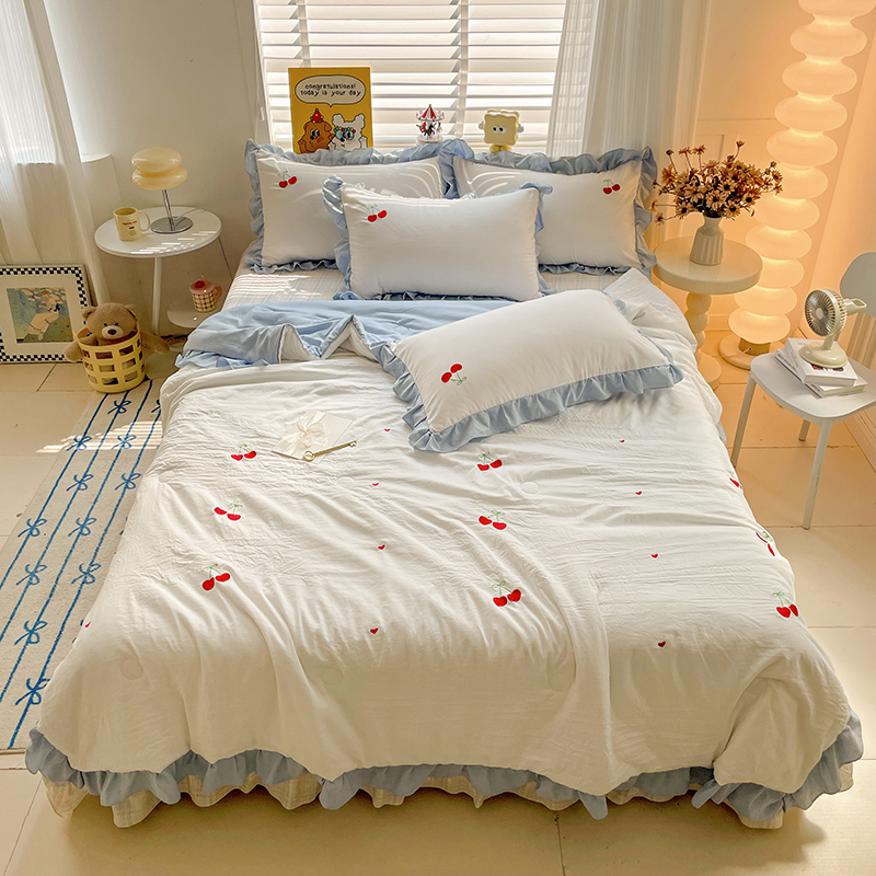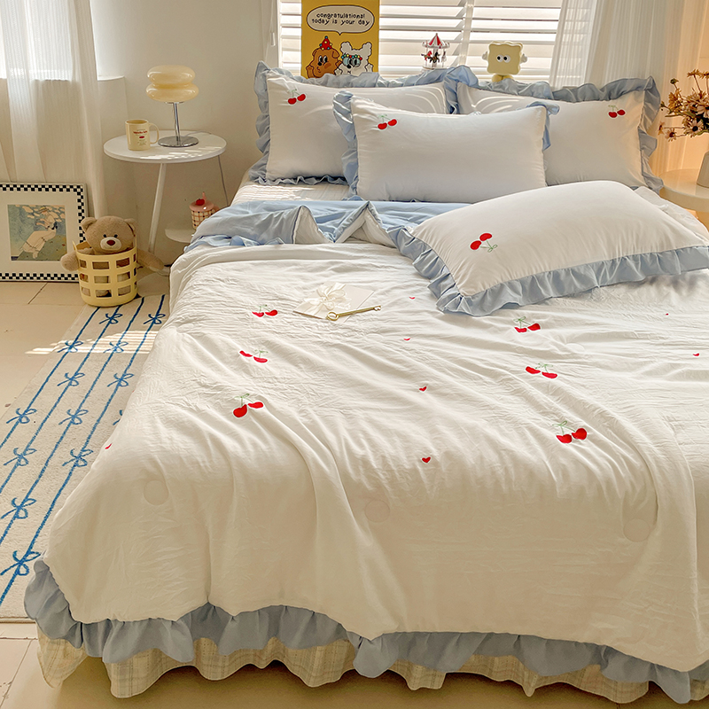 商品名称:2025新款绣花双层纱针织棉夏被床盖四件套全棉夏被四件套 樱桃蓝格