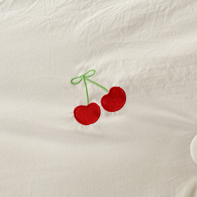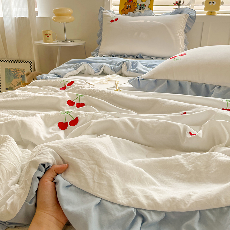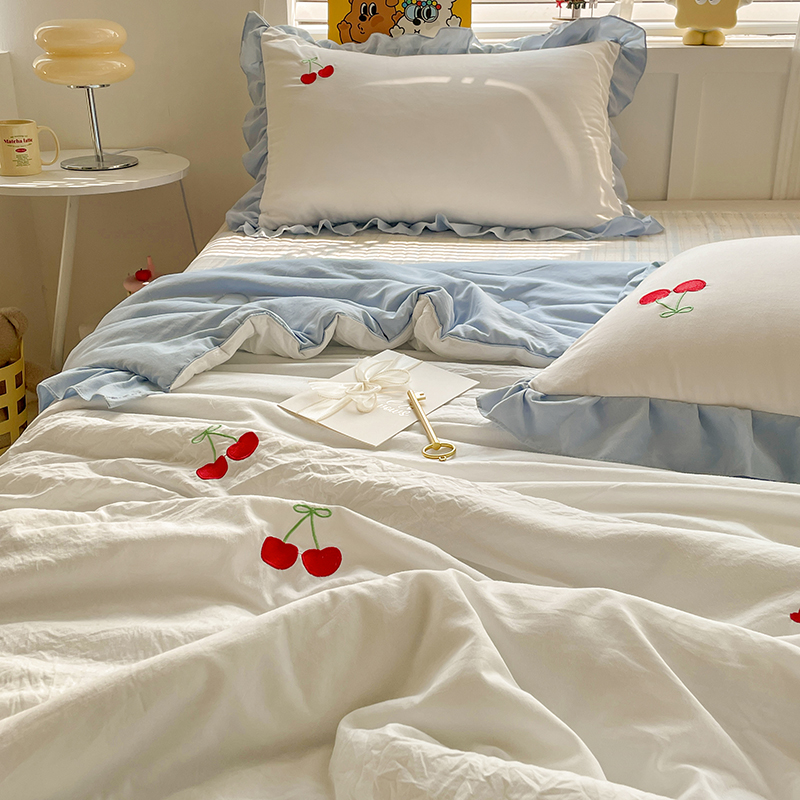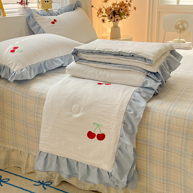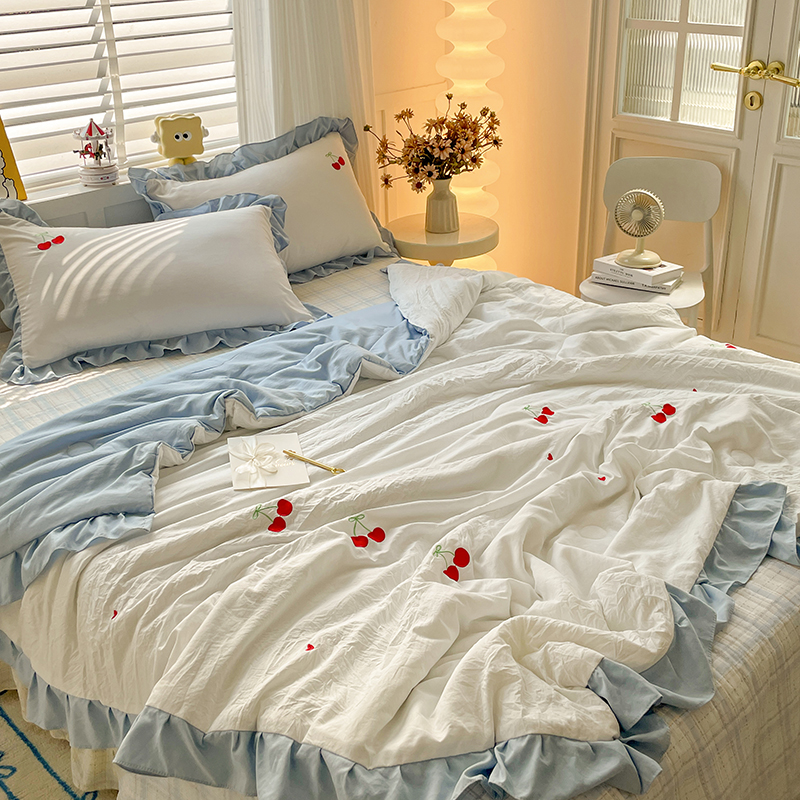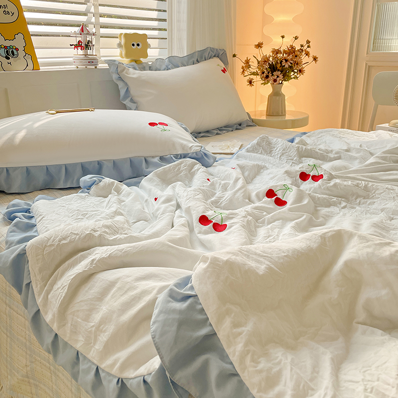 商品名称:2025新款绣花双层纱针织棉夏被床盖四件套全棉夏被四件套 樱桃蓝格