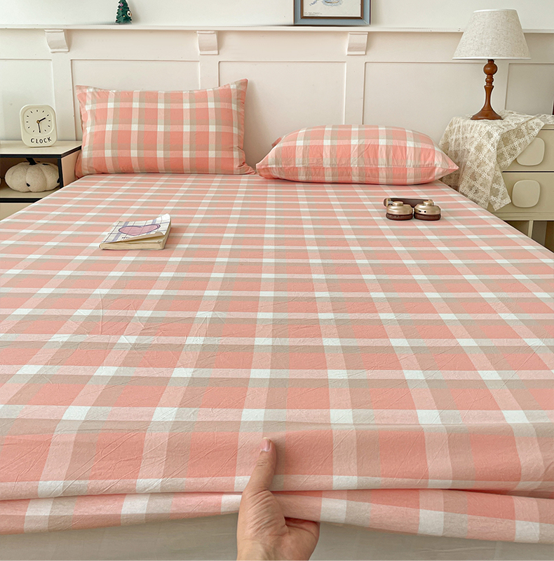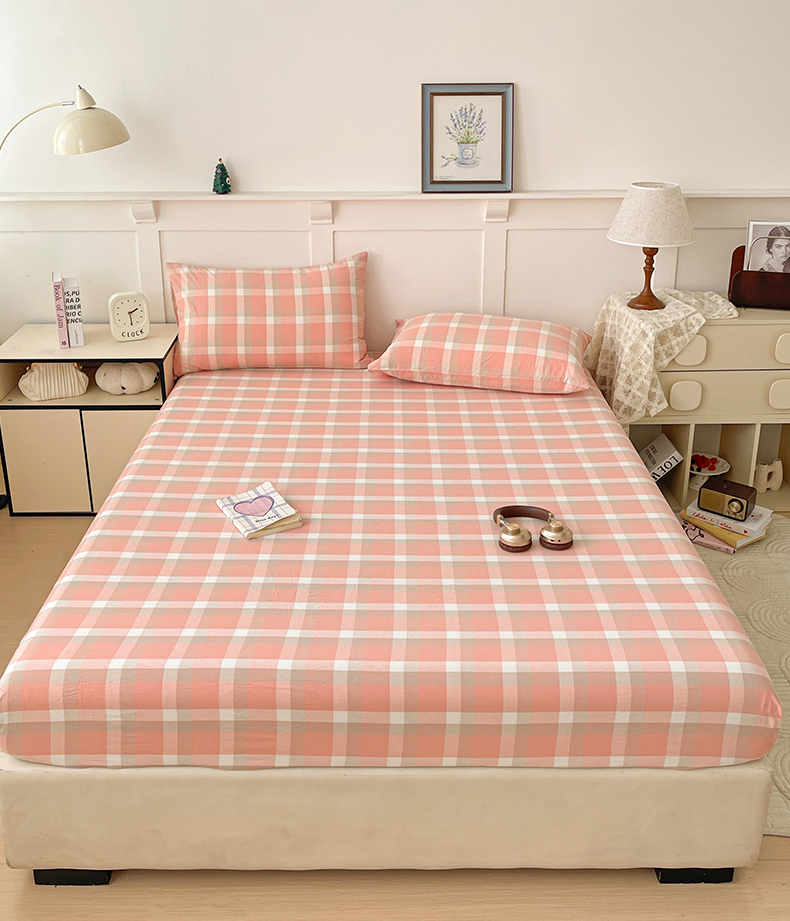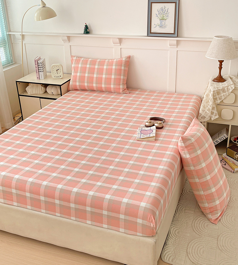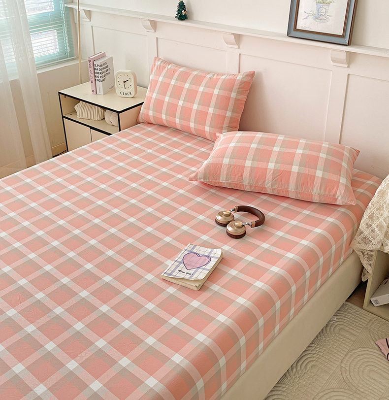 2025新款全棉水洗棉套件-单床笠 洛伊粉咖小格