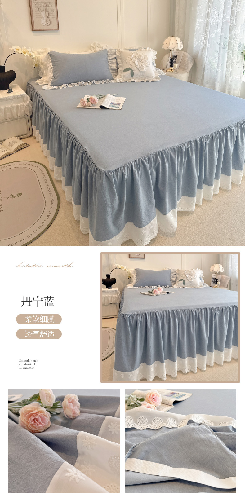 • 91家纺网 家纺一手货源 找家纺 胜权家纺 2025春夏新品全棉法式复古色织水洗棉床裙单品系列 丹宁蓝