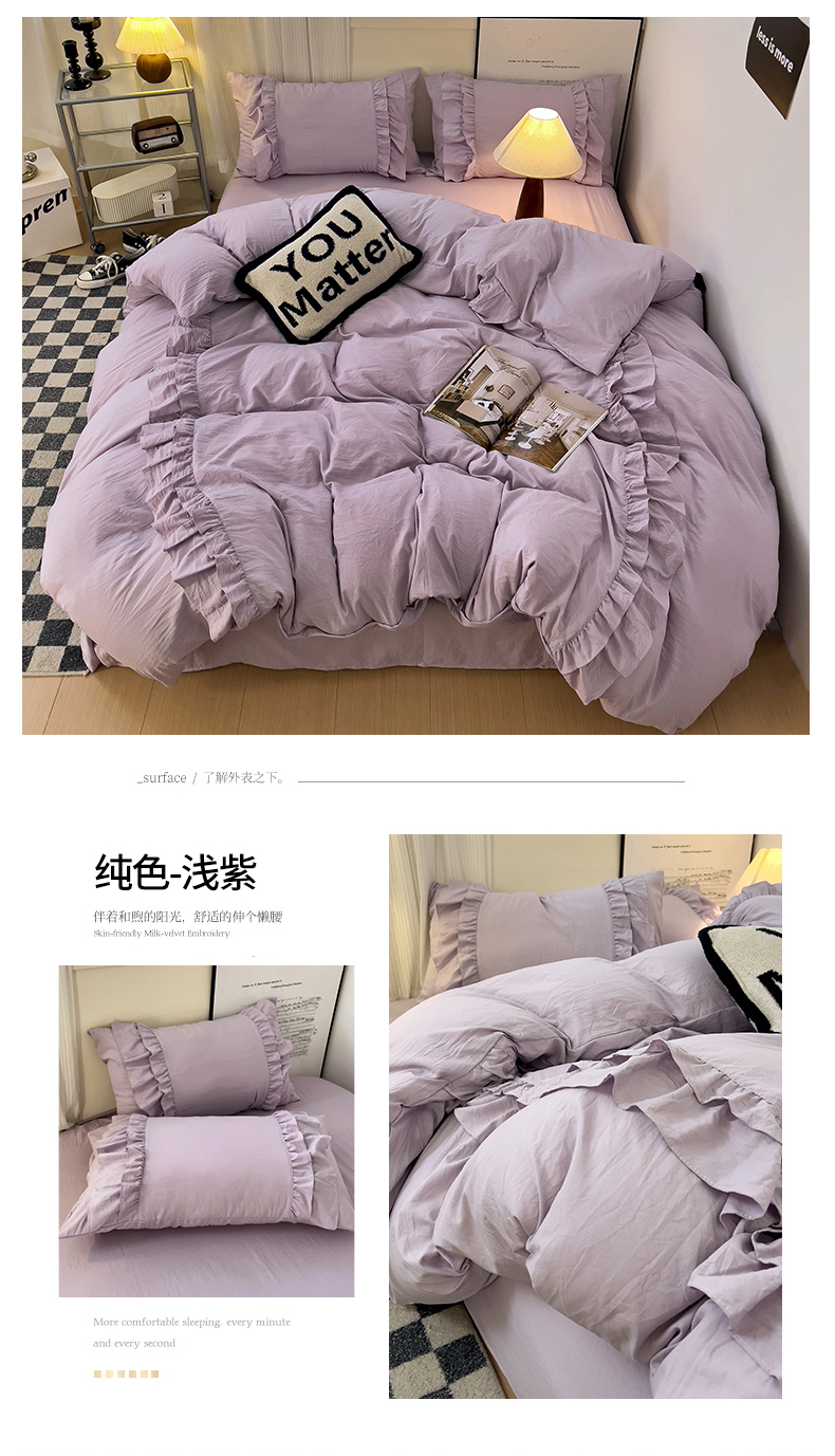 当前位置: 91家纺网 > 商品网购 > 床品套件 > 四件套 > 其它四件套 > 缦绣阁家纺 2025新款韩版花边水洗磨毛花边四件套床单款床笠款床裙款公主风四件套跨境外贸可定制 浅紫
