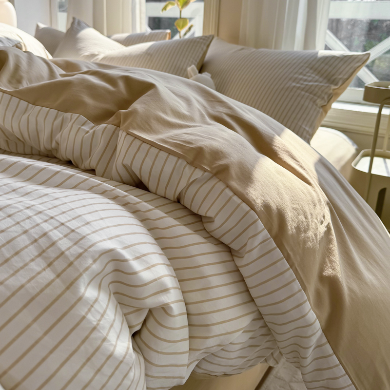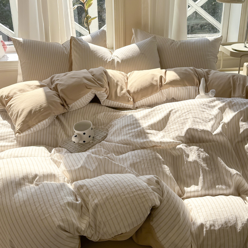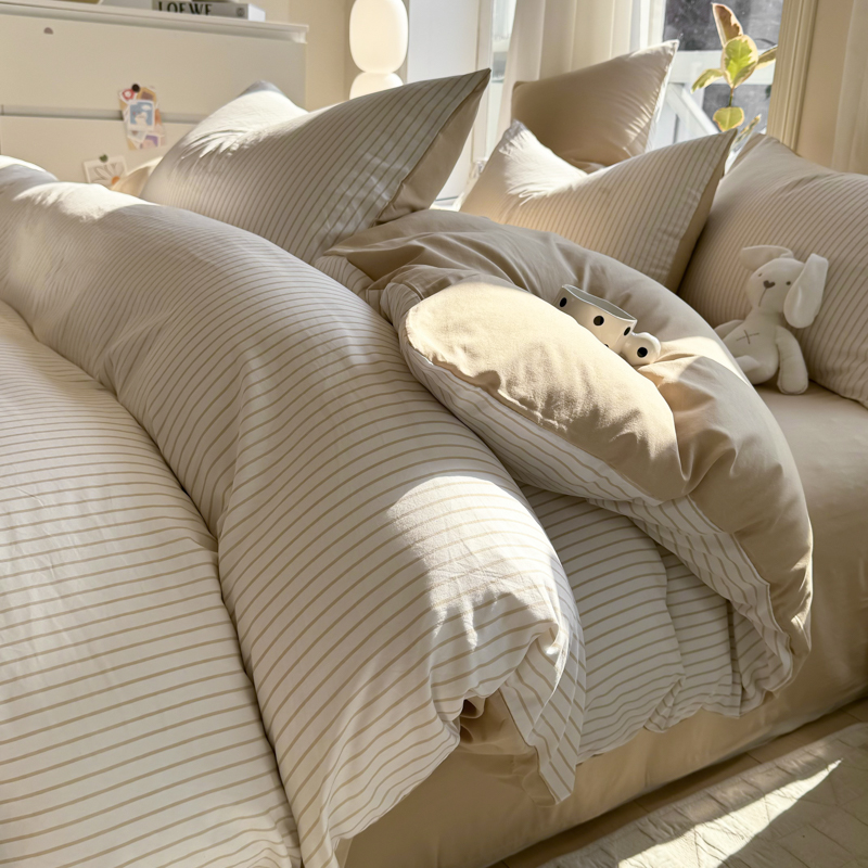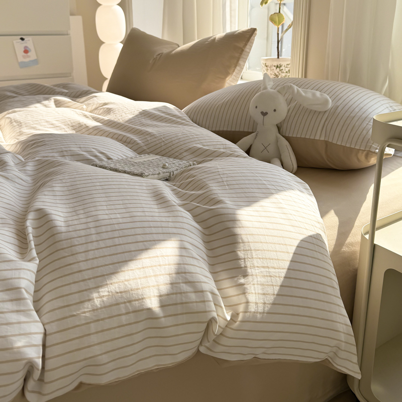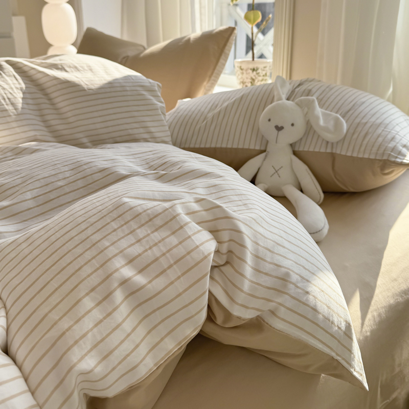 缦绣阁家纺 2025新款无印风条纹水洗磨毛四件套简约风4件套学生宿舍三件套 良品条纹驼