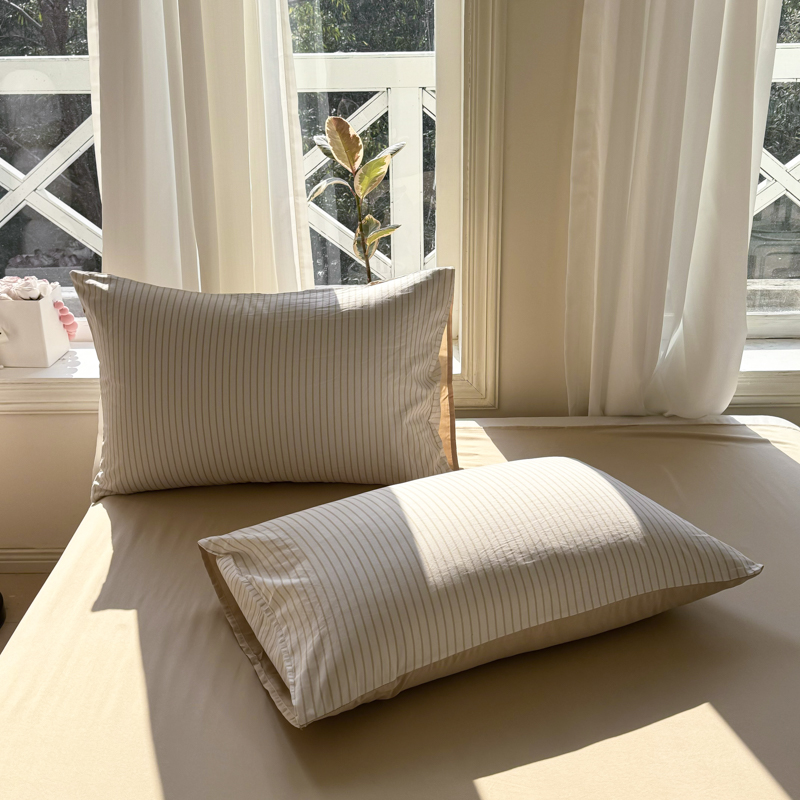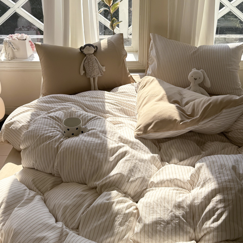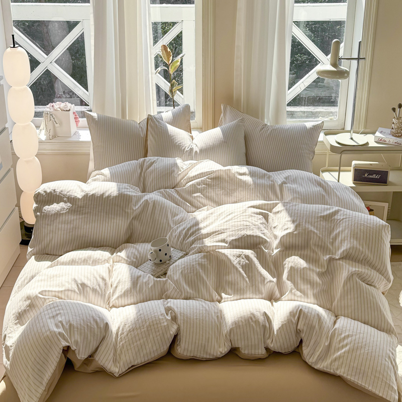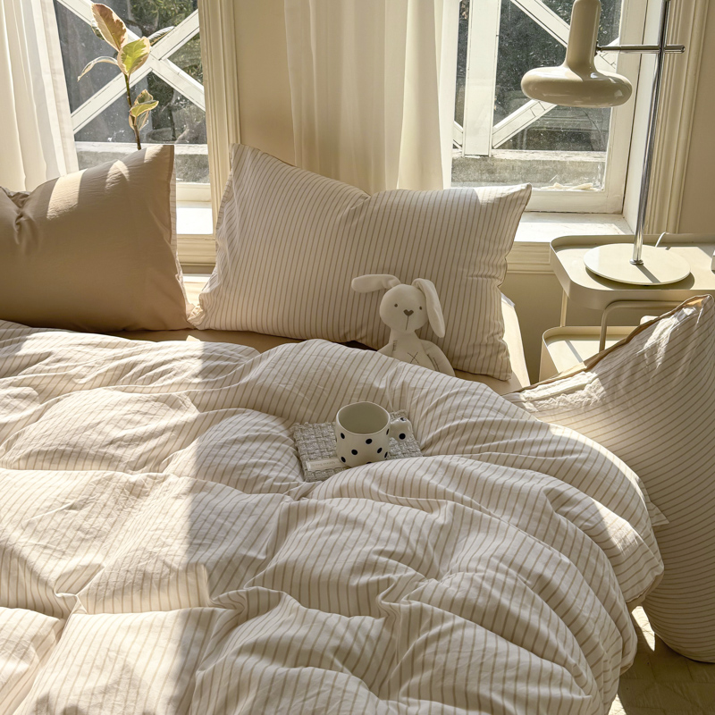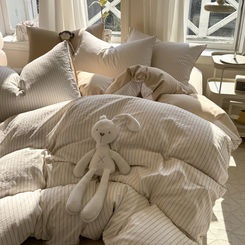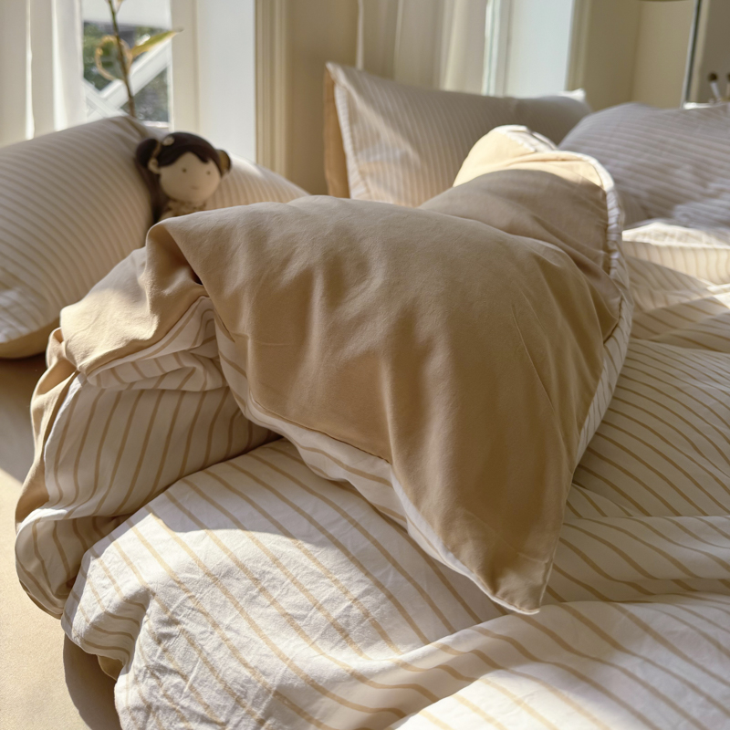 缦绣阁家纺 2025新款无印风条纹水洗磨毛四件套简约风4件套学生宿舍三件套 良品条纹驼