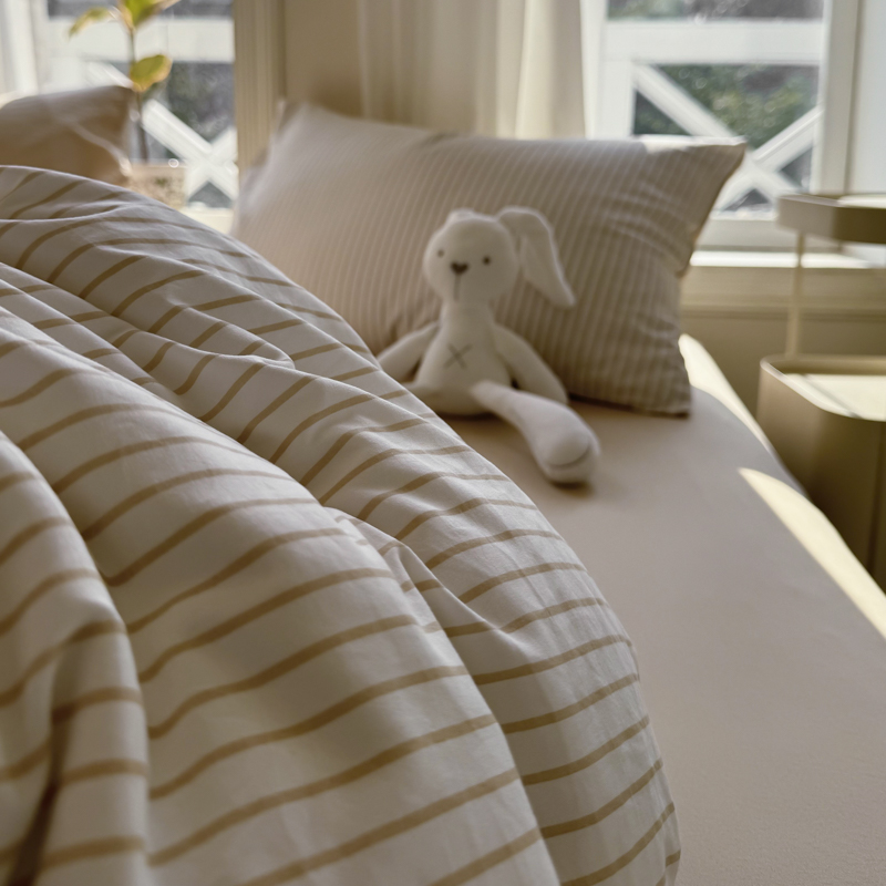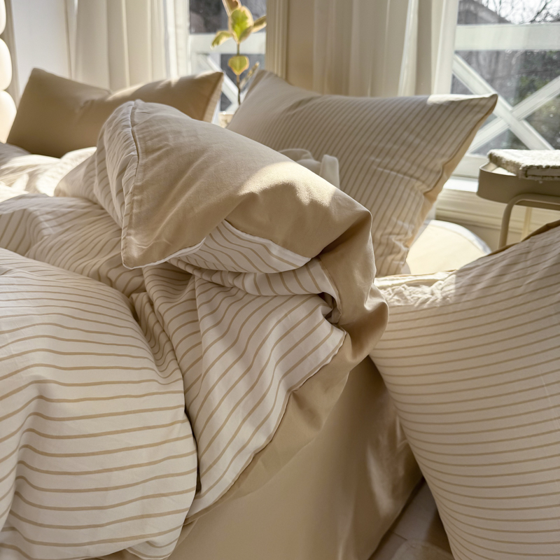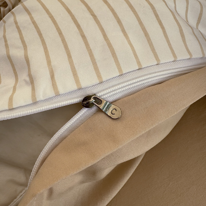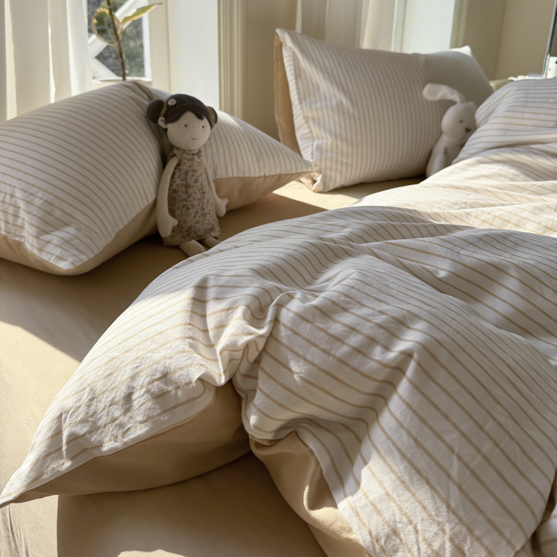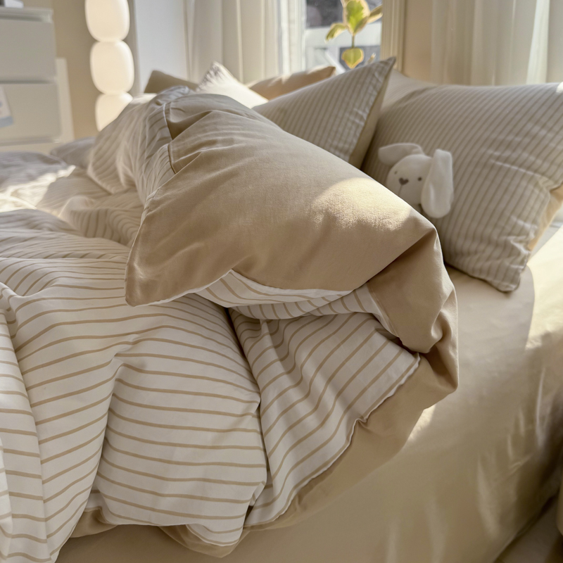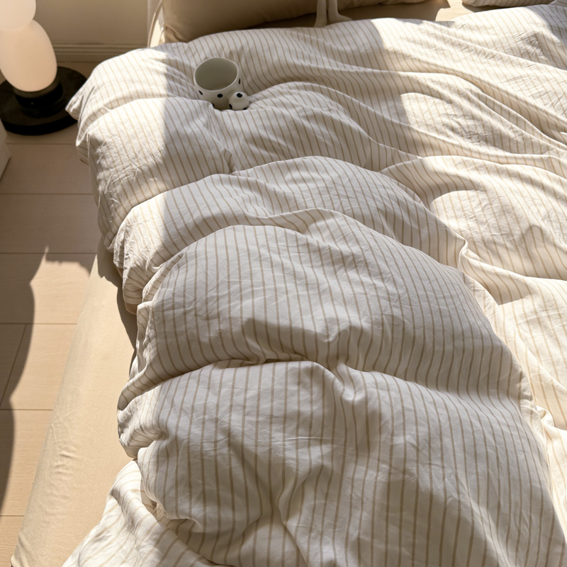 商品名称:缦绣阁家纺 2025新款无印风条纹水洗磨毛四件套简约风4件套学生宿舍三件套 良品条纹驼