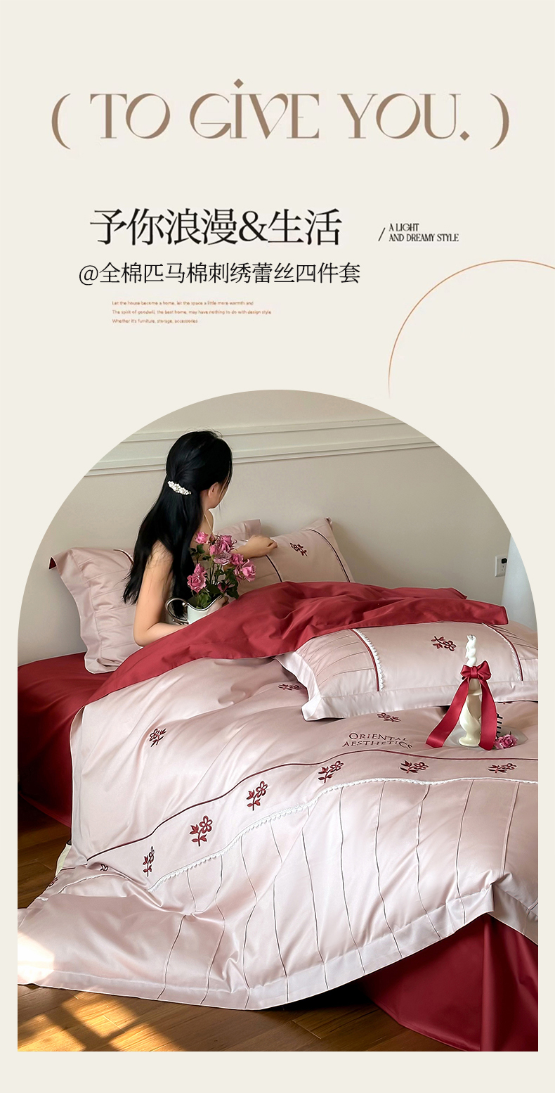 商品名称:(总)红番天婚庆 2025新款全棉提花全棉贡缎长绒棉手工捏折刺绣蕾丝四件套-觅春(活动价控价不低于480)