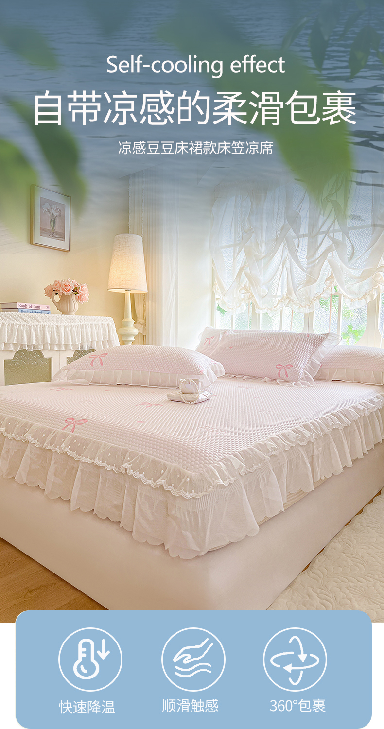 (总)麒豆豆2025新款凉感丝床笠式床裙乳胶凉席,白,粉,灰,蓝,绿,驼,玉,紫
