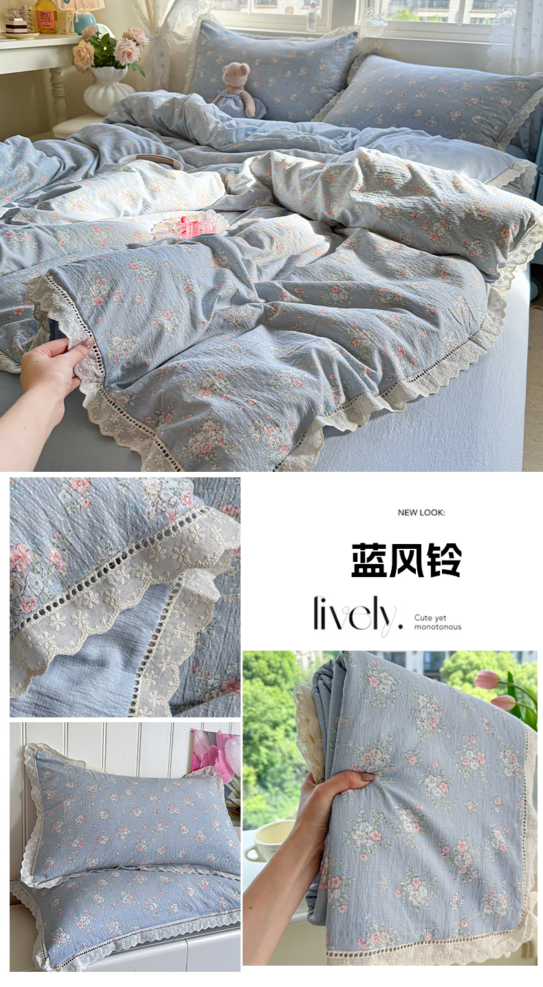 商品名称:Mata蔓塔家 2025新款云感双层纱全棉镂空花边四件套 蓝风铃