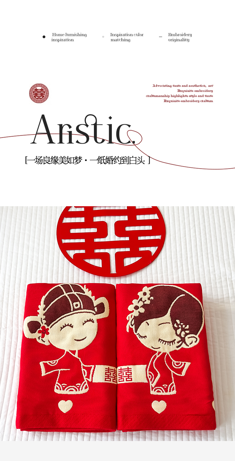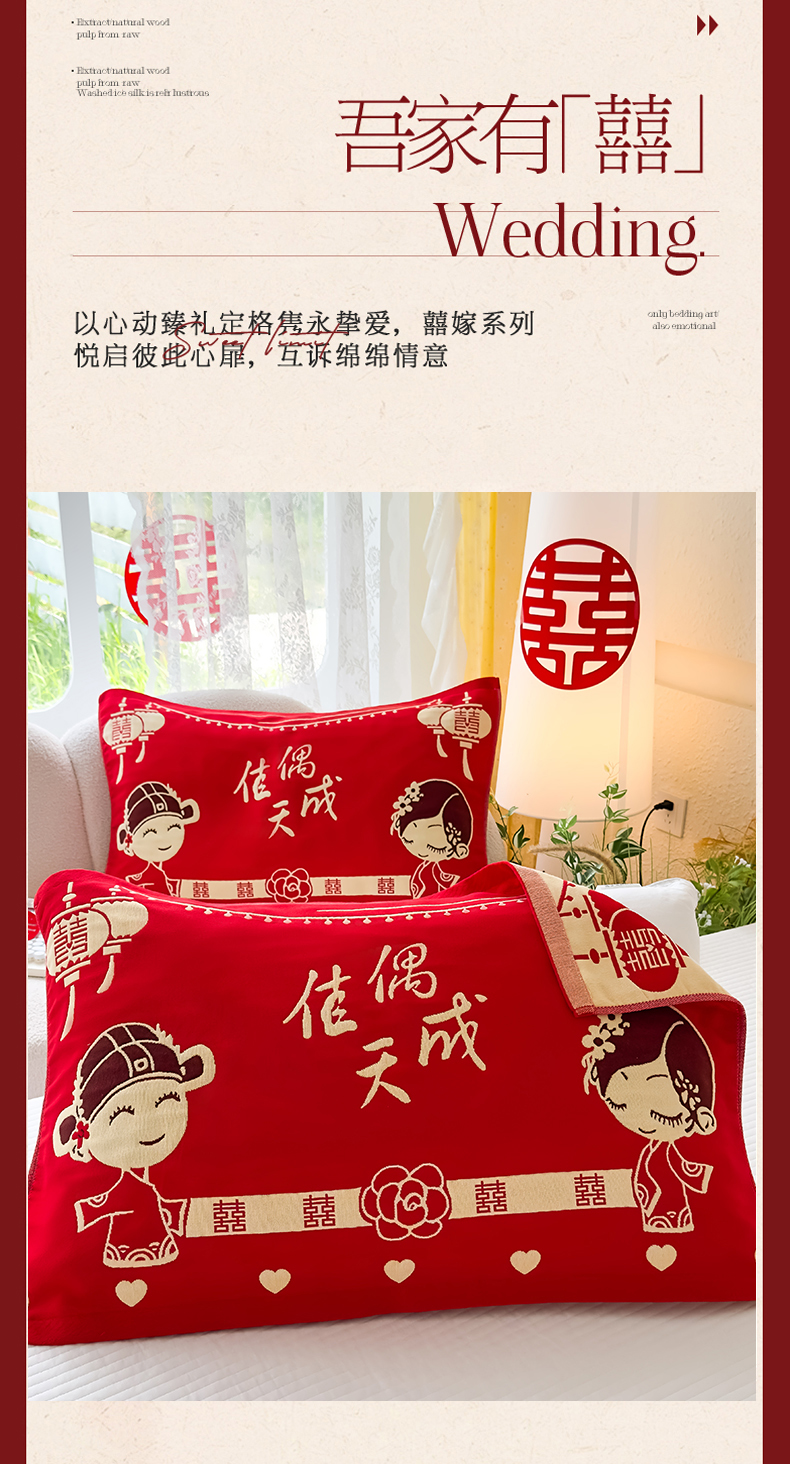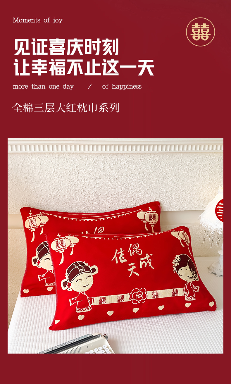 • 91家纺网 家纺一手货源 找家纺 悦然毛巾被 2025新款悦然三层大红枕巾婚庆三层全棉纯棉纱布枕巾 佳偶天成 52x78cm枕巾一对