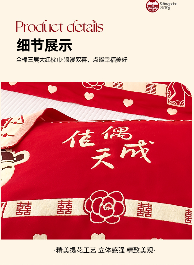 • 91家纺网 家纺一手货源 找家纺 悦然毛巾被 2025新款悦然三层大红枕巾婚庆三层全棉纯棉纱布枕巾 佳偶天成 52x78cm枕巾一对 91家纺网 家纺一手货源 找家纺 悦然毛巾被 2025新款悦然三层大红枕巾婚庆三层全棉纯棉纱布枕巾 佳偶天成 52x78cm枕巾一对