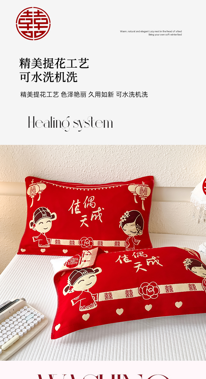 悦然毛巾被 2025新款悦然三层大红枕巾婚庆三层全棉纯棉纱布枕巾 佳偶天成 52x78cm枕巾一对