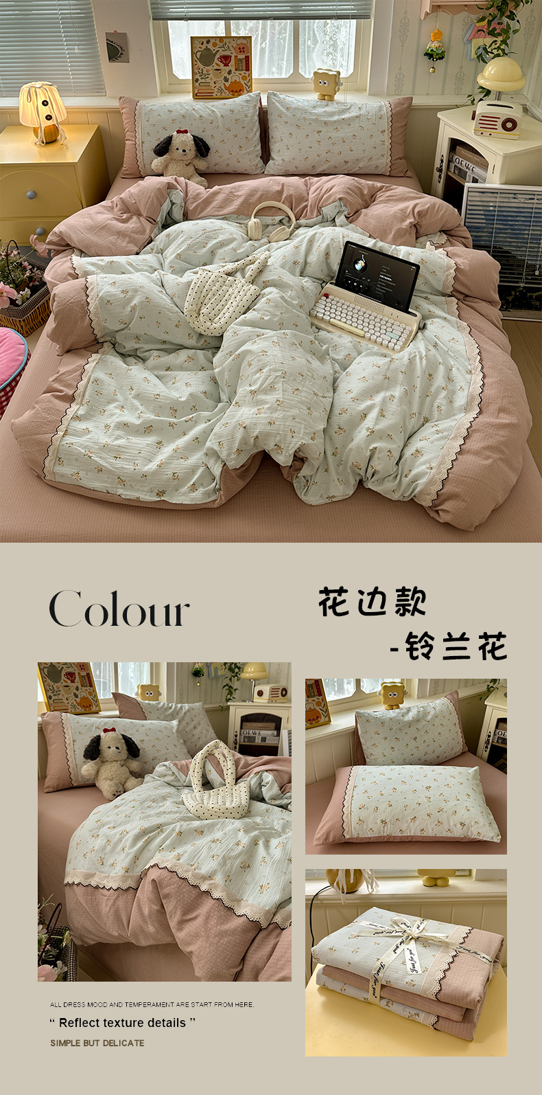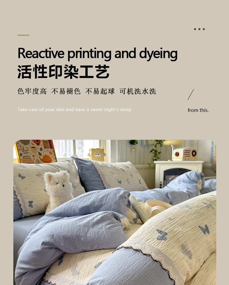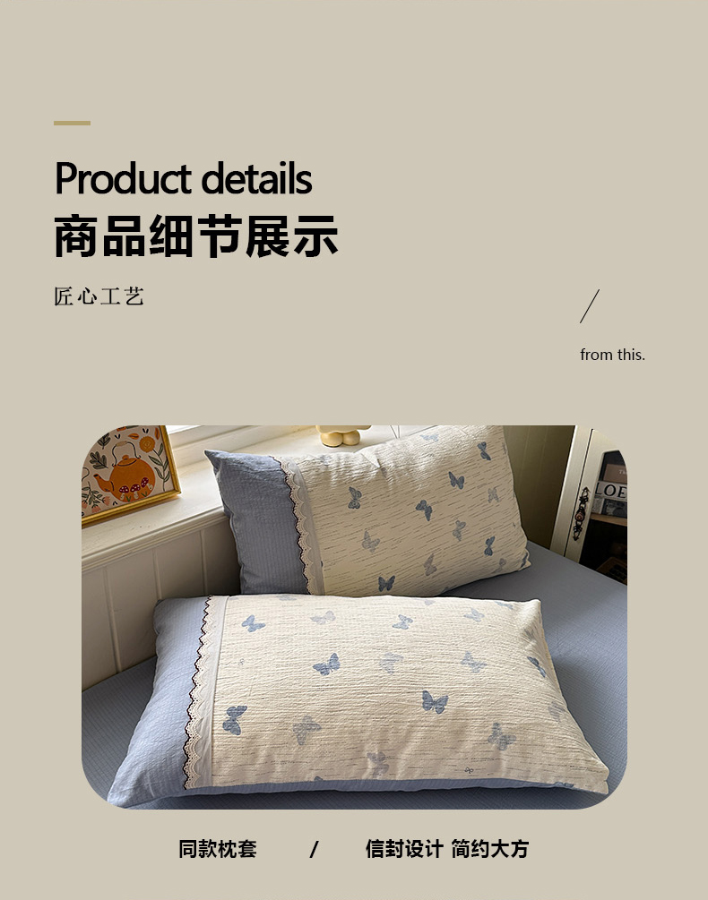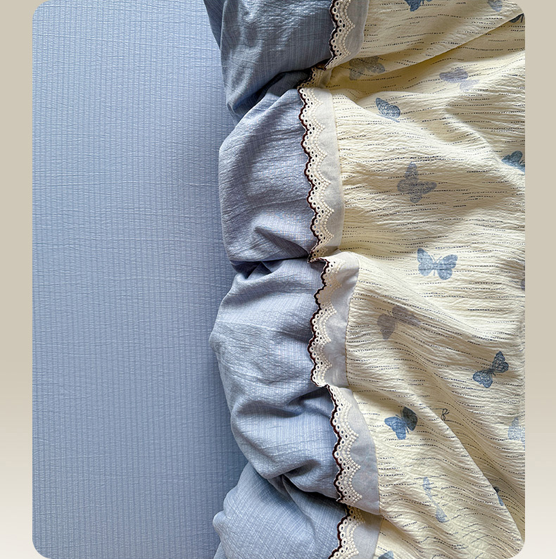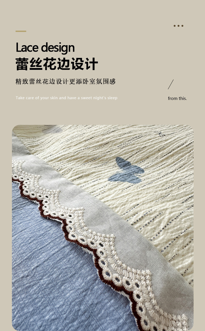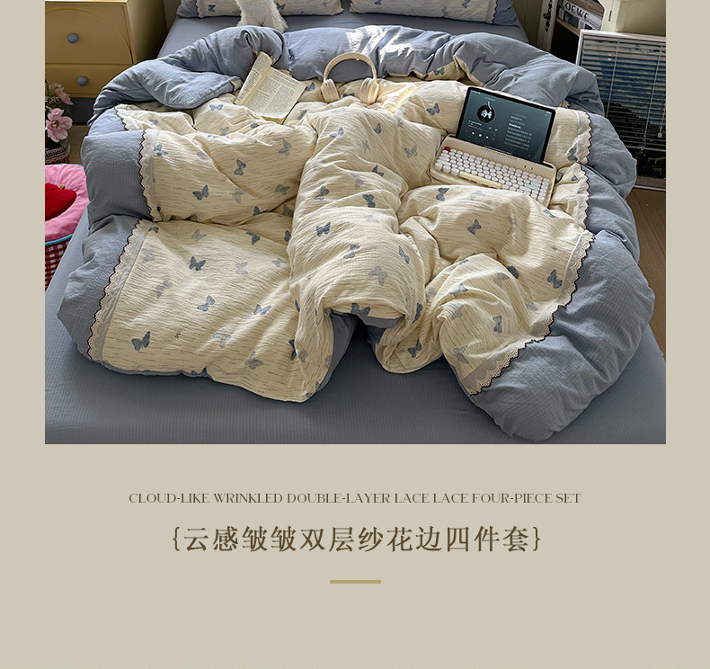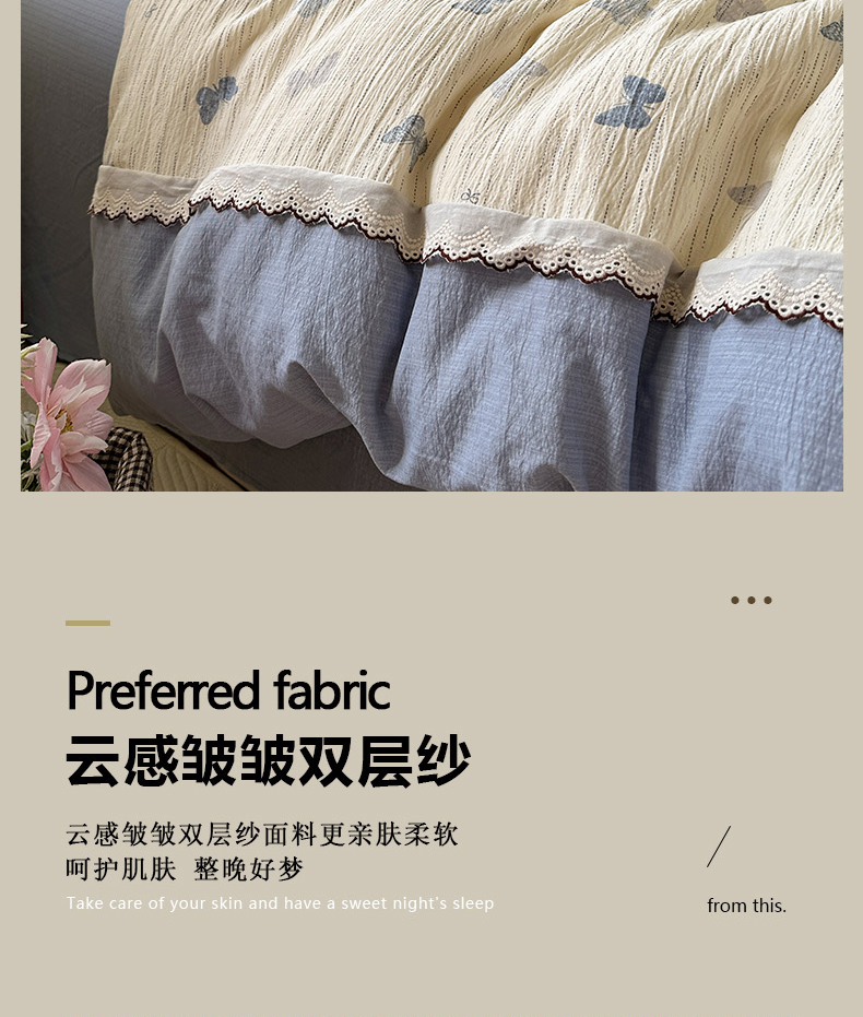 当前位置: 91家纺网 > 商品网购 > 床品套件 > 四件套 > 全棉普通四件套 > 水墨江南 2025新款云感皱皱纱全棉花边四件套场景一 花边款-蝶舞