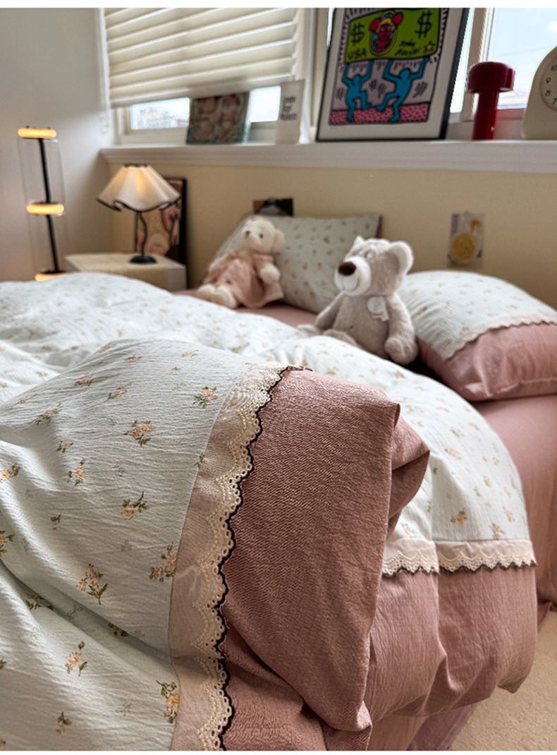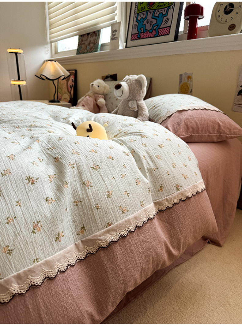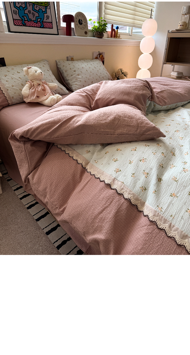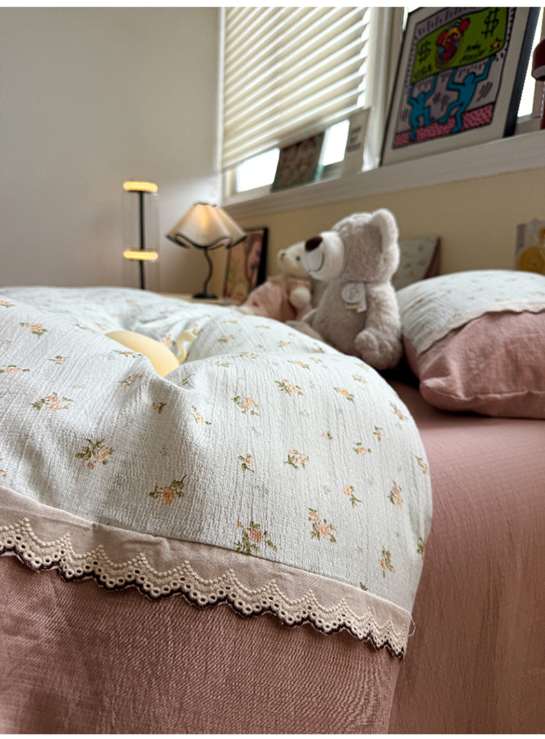 当前位置: 91家纺网 > 商品网购 > 床品套件 > 四件套 > 全棉普通四件套 > 水墨江南 2025新款云感皱皱纱全棉花边四件套-场景二 花边款-铃兰花