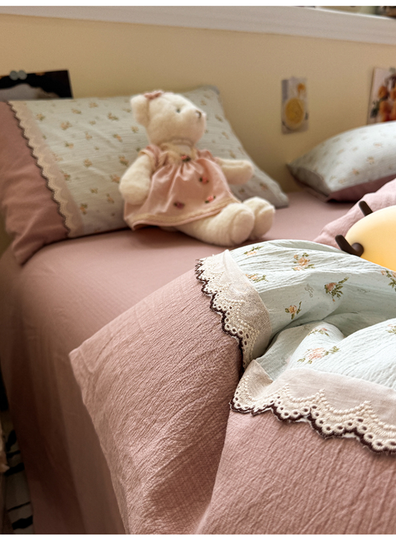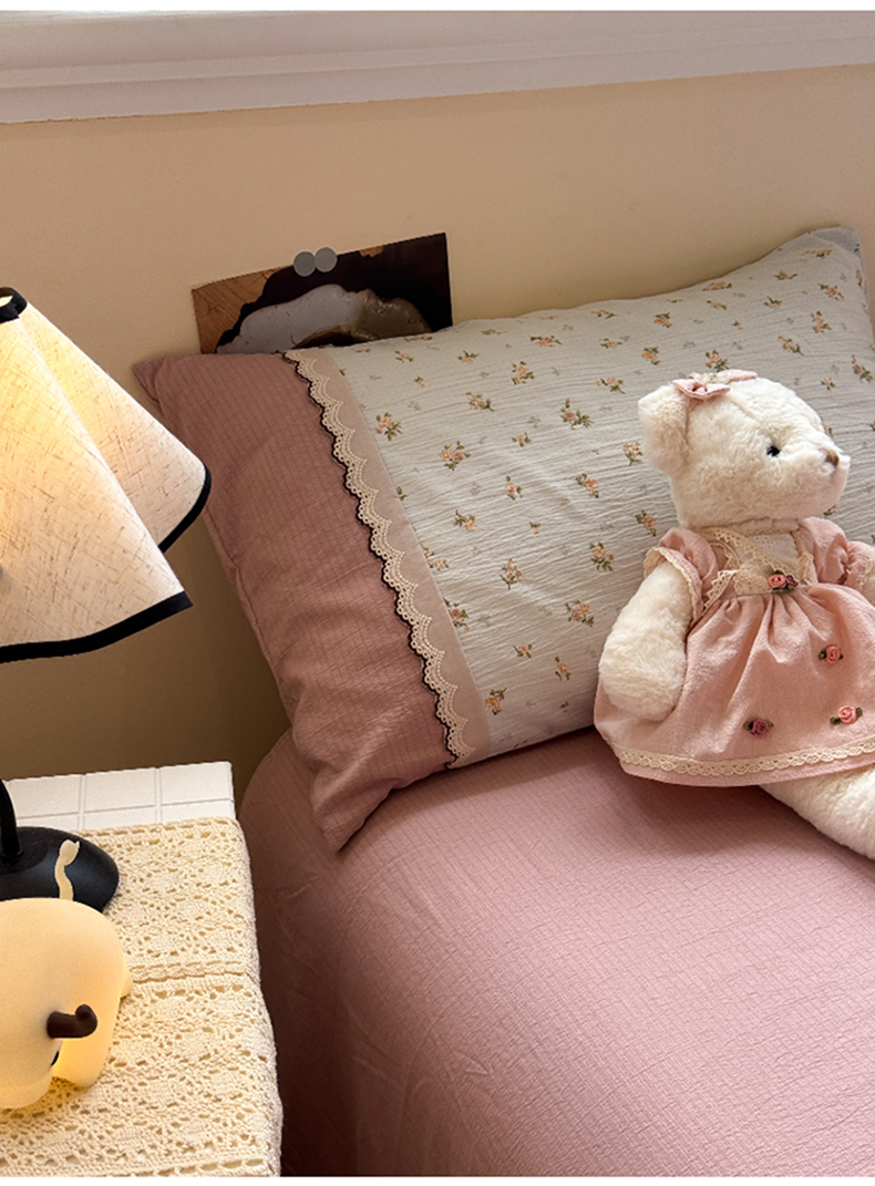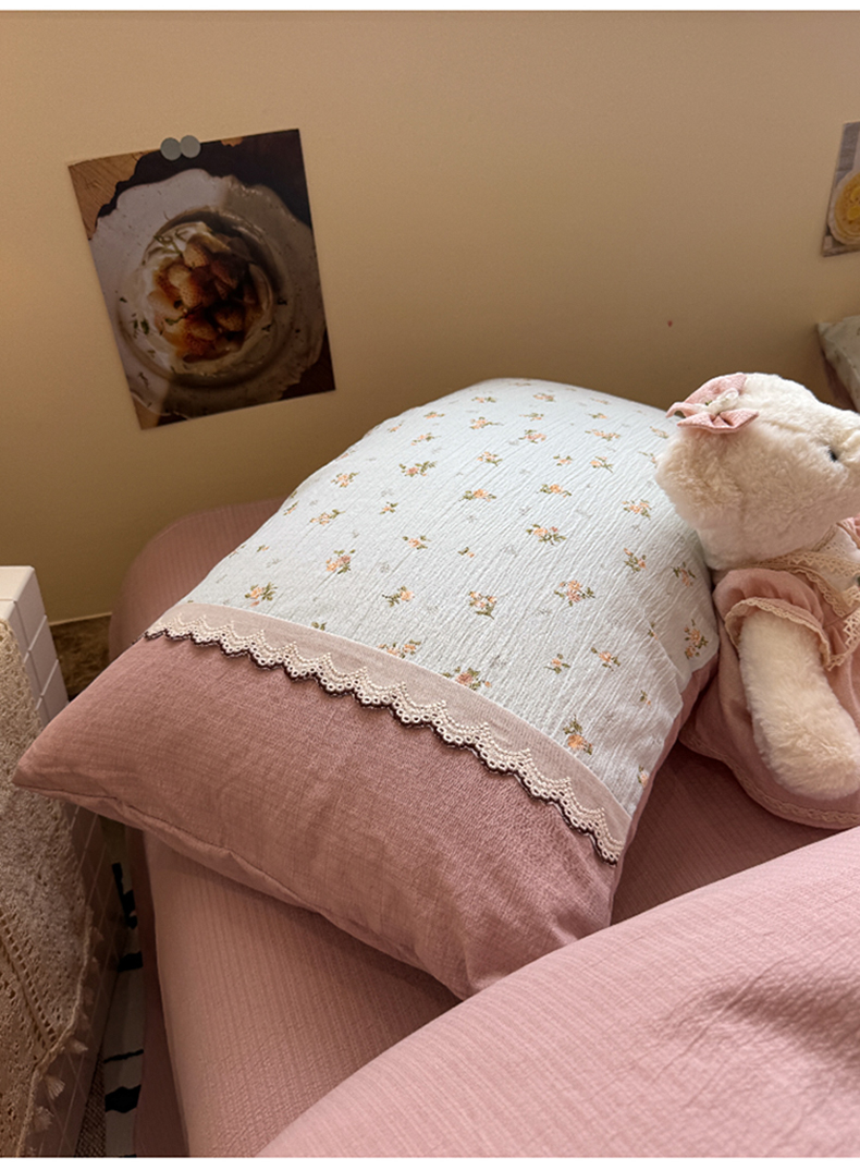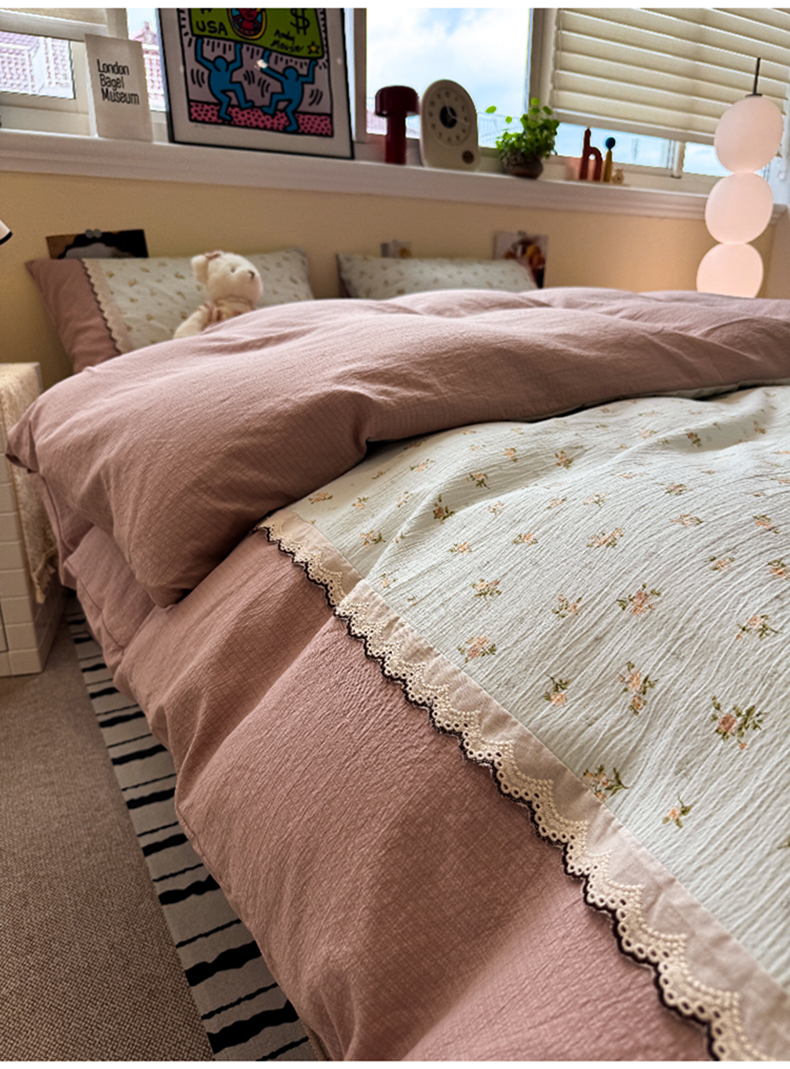 当前位置: 91家纺网 > 商品网购 > 床品套件 > 四件套 > 全棉普通四件套 > 水墨江南 2025新款云感皱皱纱全棉花边四件套-场景二 花边款-铃兰花