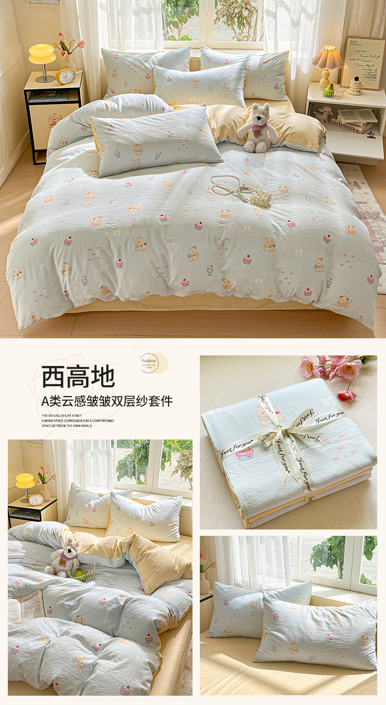 当前位置: 91家纺网 > 商品网购 > 床品套件 > 四件套 > 双层纱四件套 > 格真 2025秋冬新款110克高克重提花加厚皱皱纱双层纱四件套双面印花 少女季