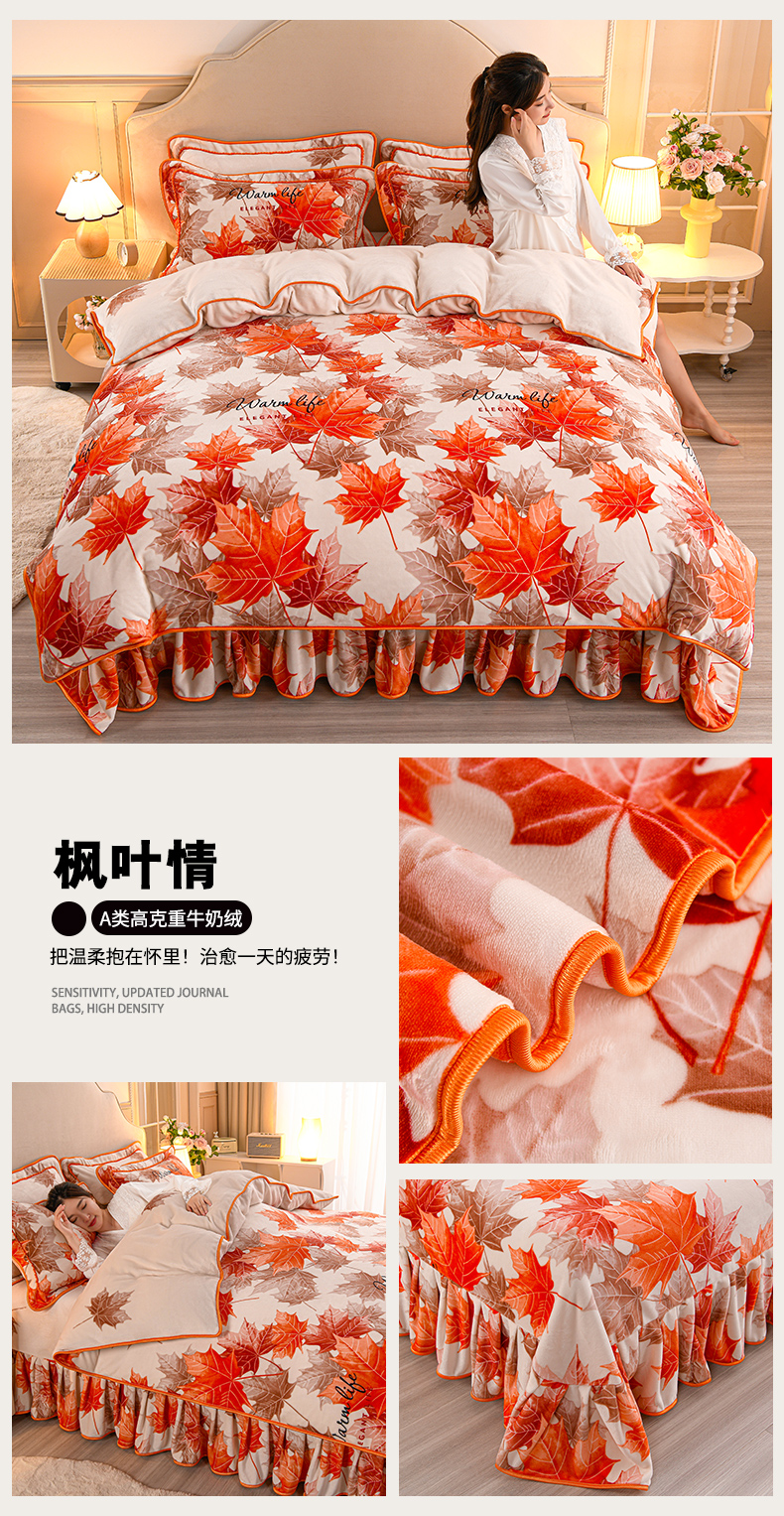 商品名称:羽梦2025新款8.5斤牛奶法莱绒金貂法兰绒四件套直播爆款枫叶情