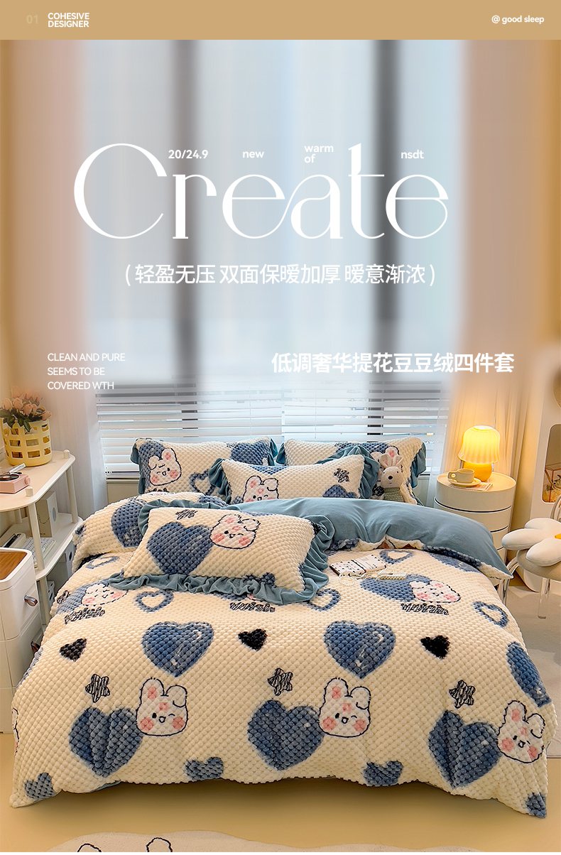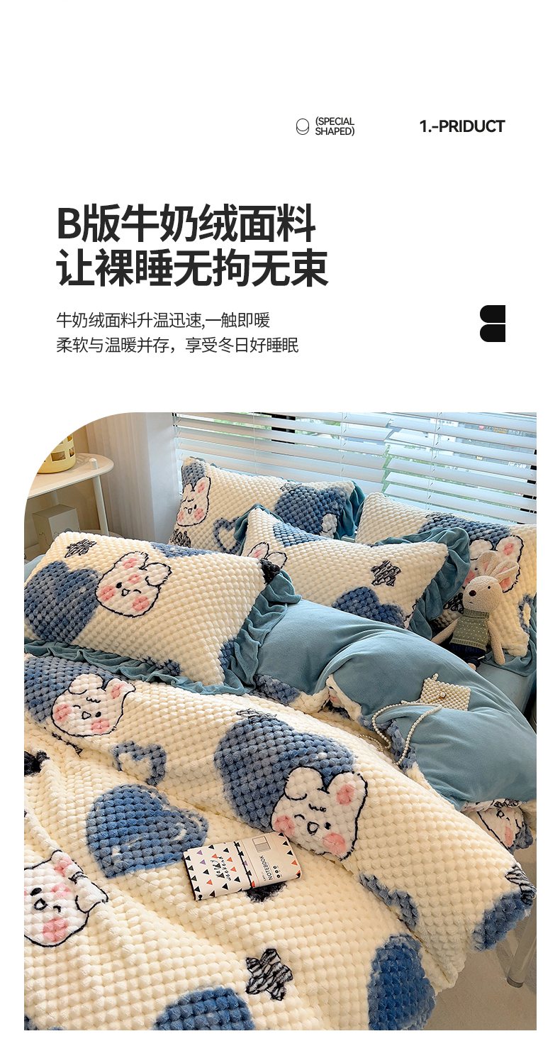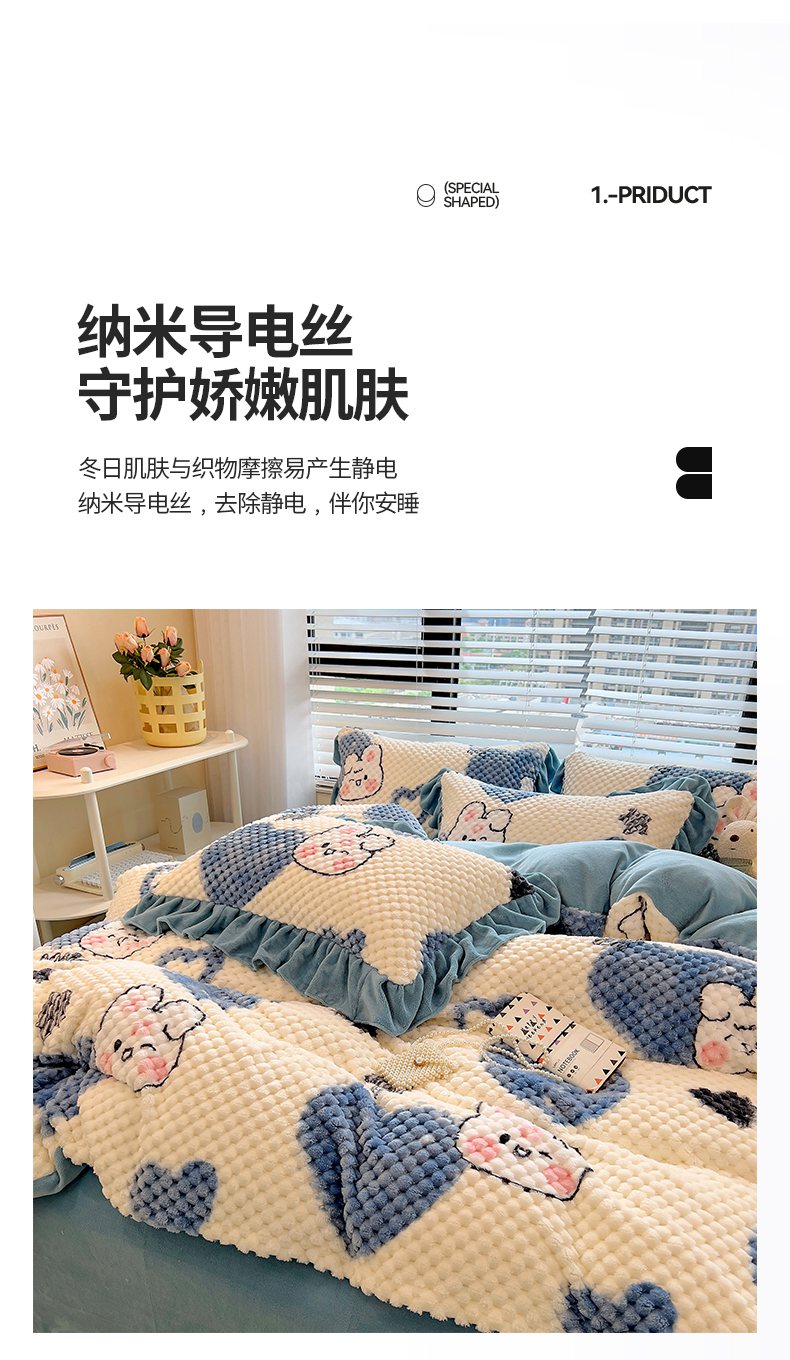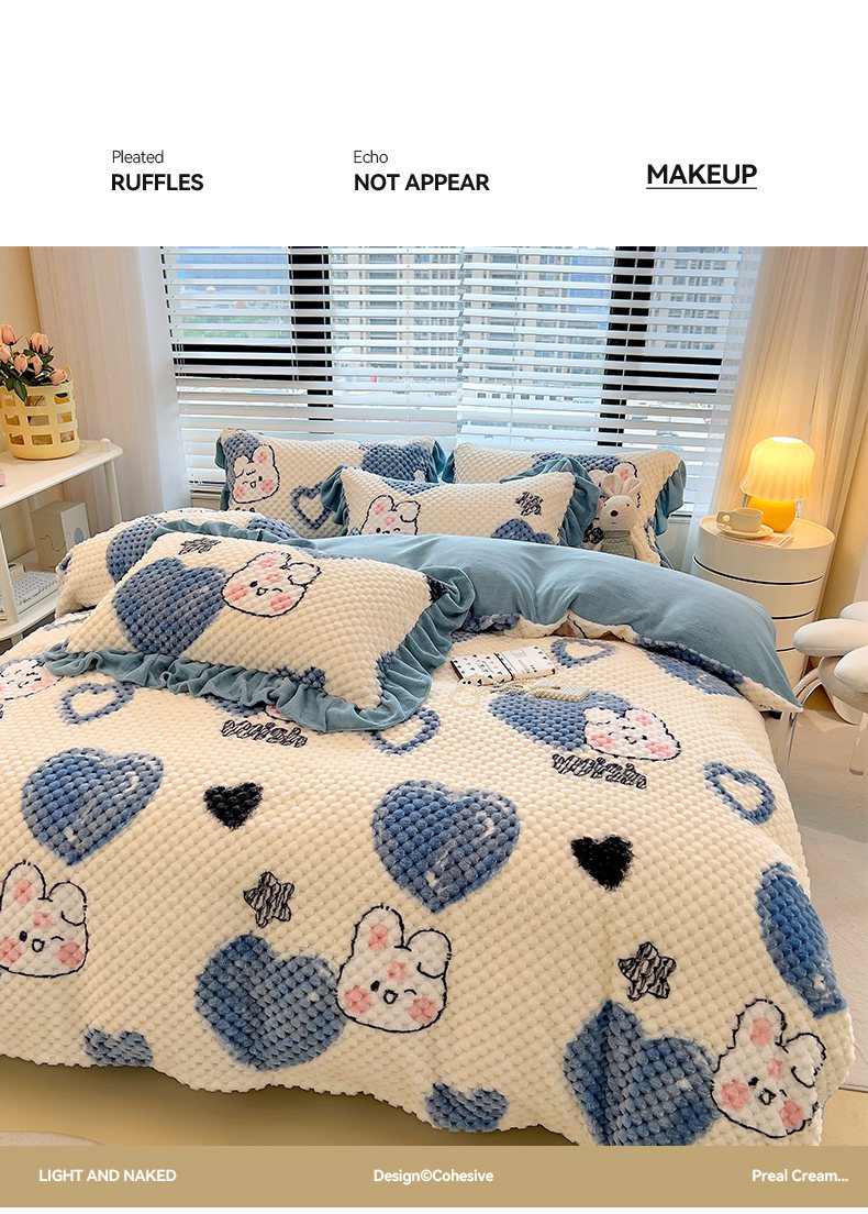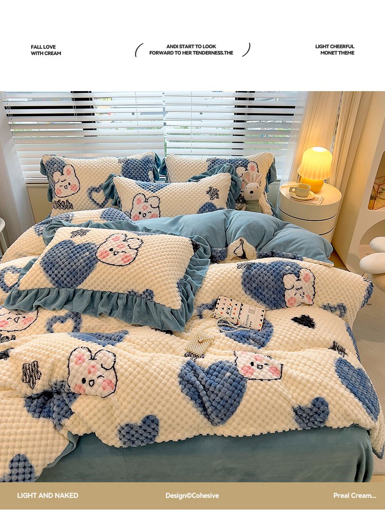 商品名称:摩妮卡 2025新款提花豆豆绒卡通印花牛奶绒四件套 兔小宝