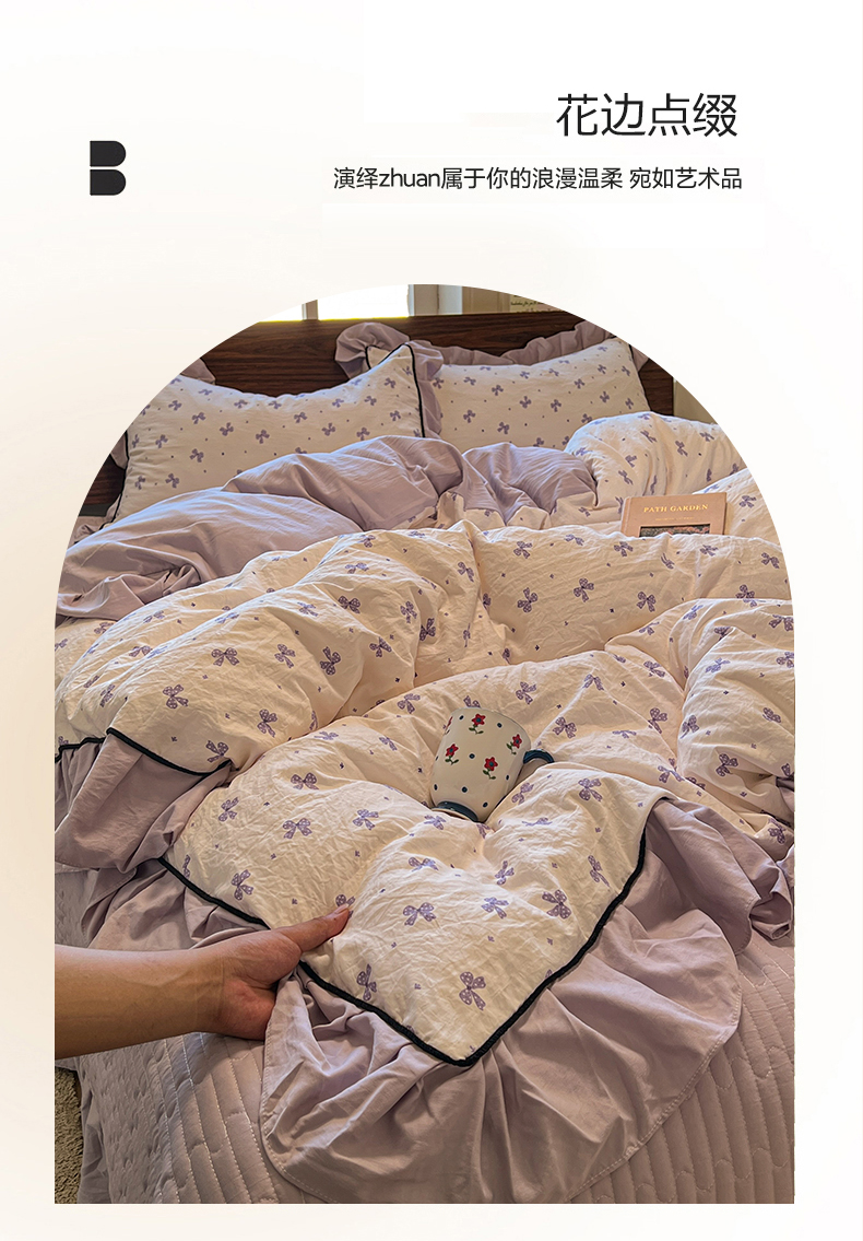 (总)美梦家纺 2026新款高克重全棉花边云感棉床盖四件套,希雅莉·米,雅格·粉,樱桃蜜·咖,尤丽叶·咖,紫藤碎花·咖,莓莓素语·粉,暖小象·兰,浅叶·米,希雅莉·灰