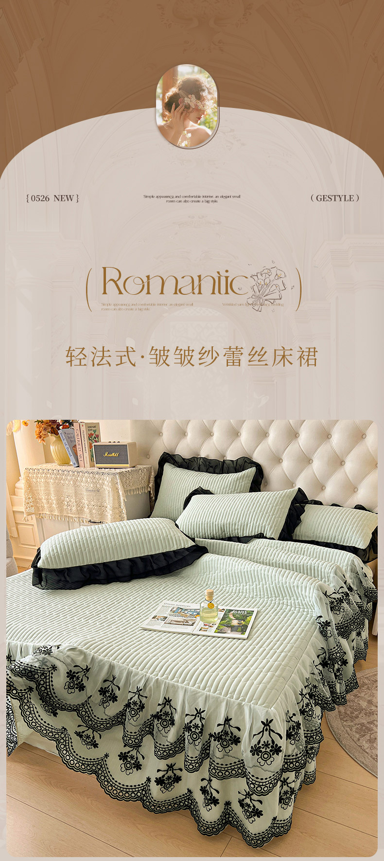 (总) 鼎丰家纺 2025新款法式浪漫花边皱皱纱床盖四件套,蔷薇-摩卡棕,蔷薇-桃花粉,蔷薇-牛奶白,蔷薇-云雾灰,蔷薇-清洗绿