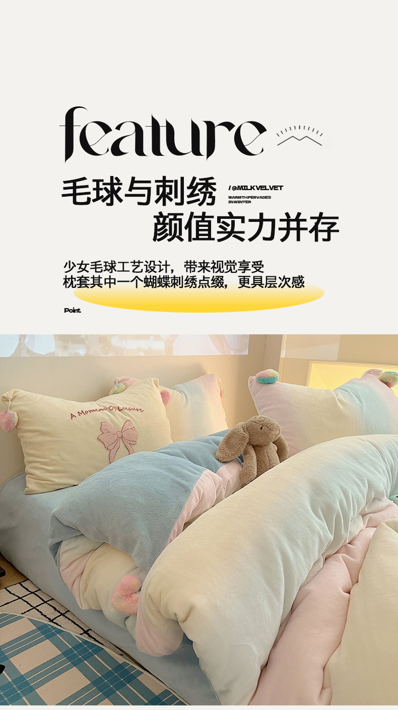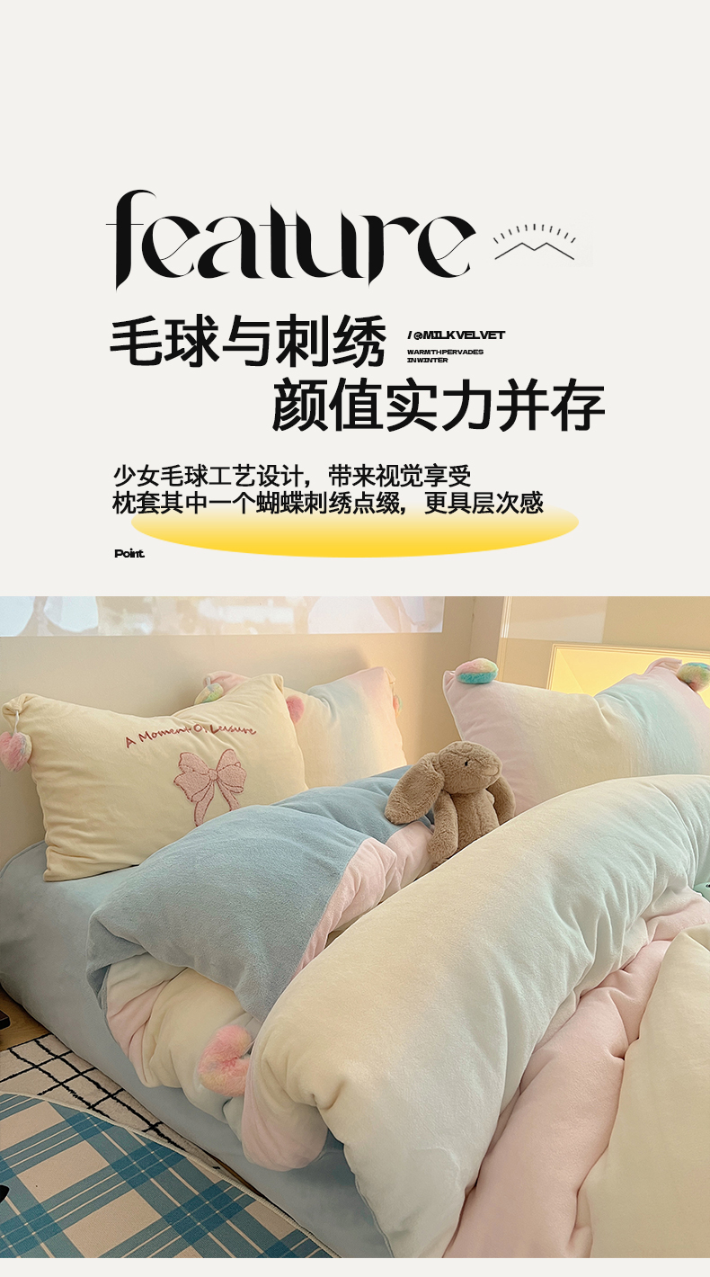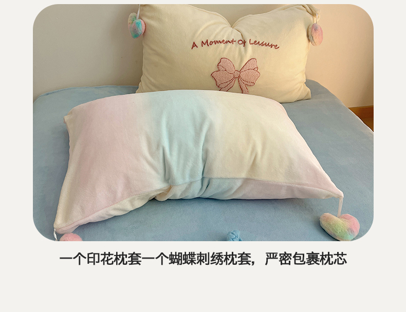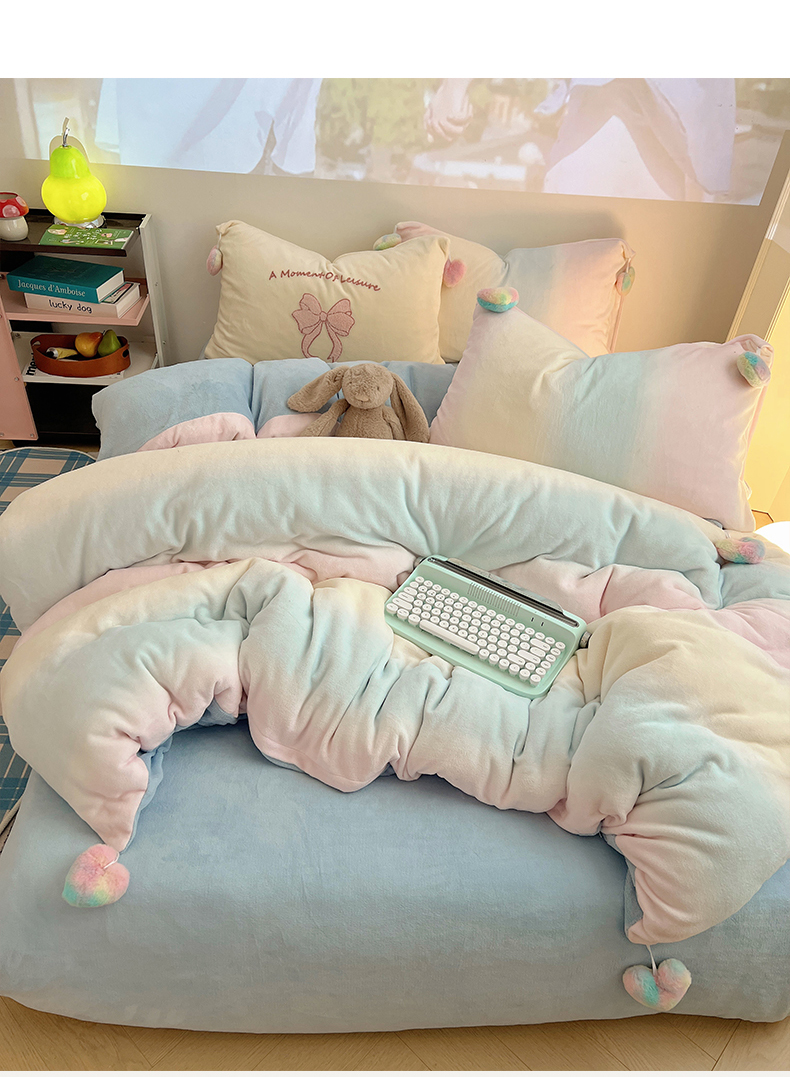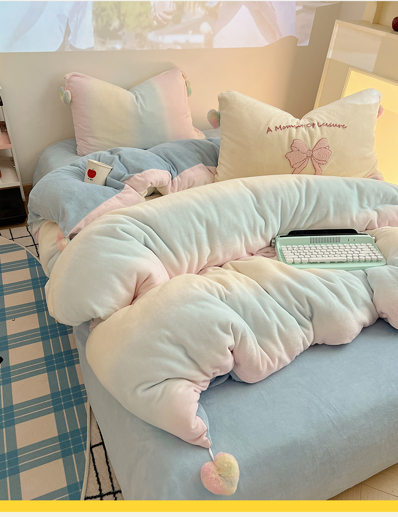 当前位置: 91家纺网 > 商品网购 > 床品套件 > 四件套 > 牛奶绒四件套 > 桃子家居 2025新款insA类少女甜心毛球混搭工艺蝴蝶结刺绣毛巾绣印花加厚牛奶绒四件套 绒毛球-蝴蝶结渐变粉蓝黄