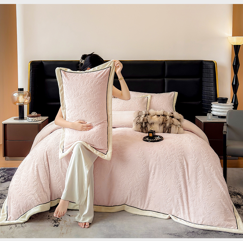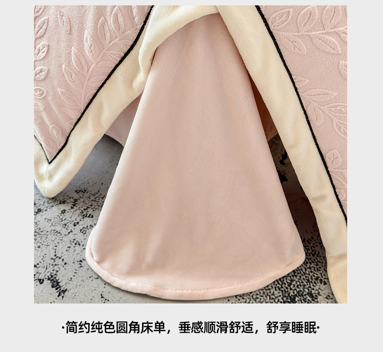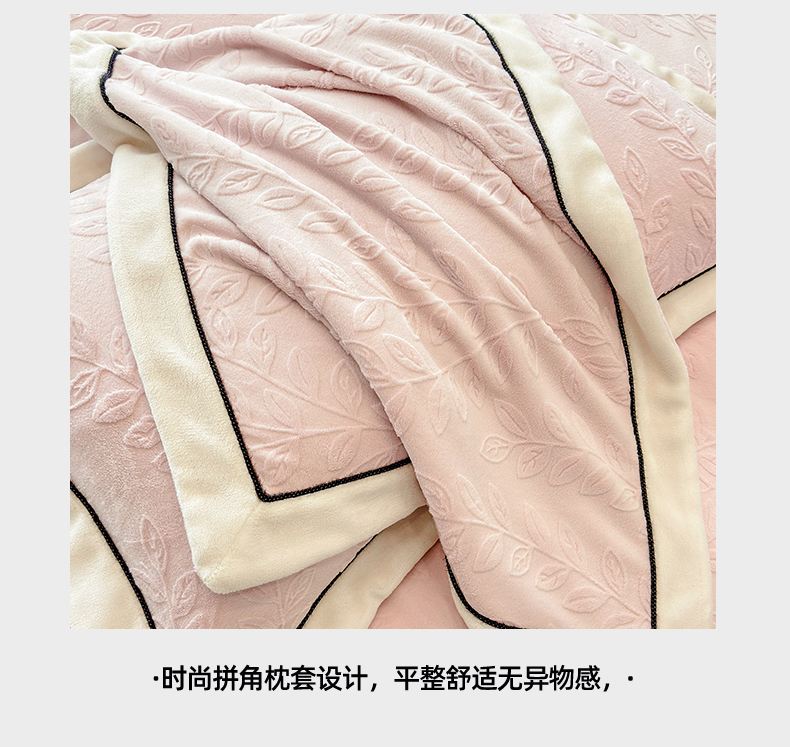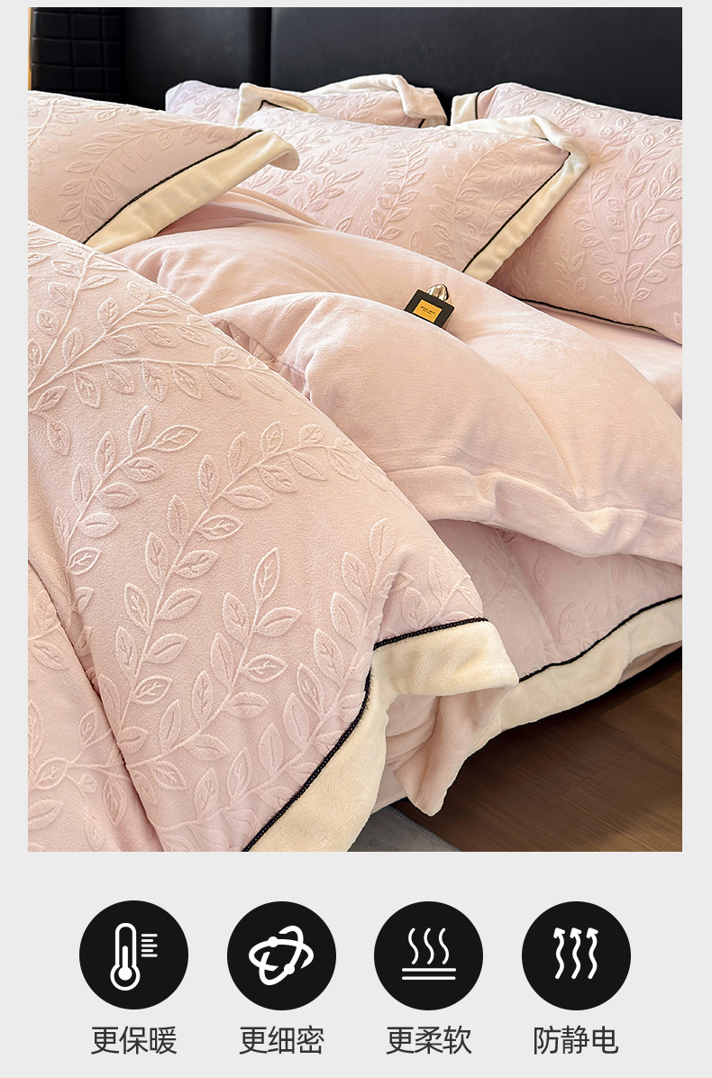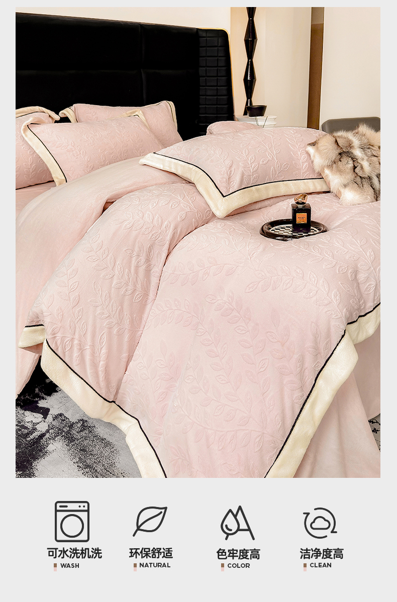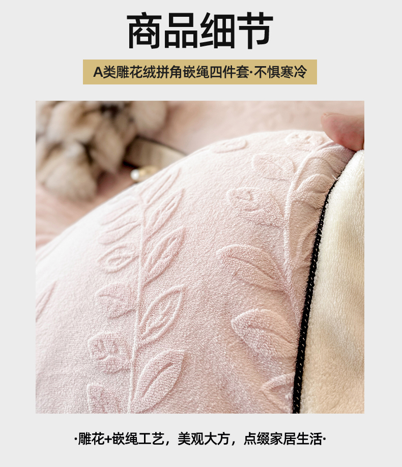 商品名称:金喜 2025秋冬新款230克高克重牛奶绒四件套雕花绒拼角宽边嵌绳系列四件套 花枝-桃粉
