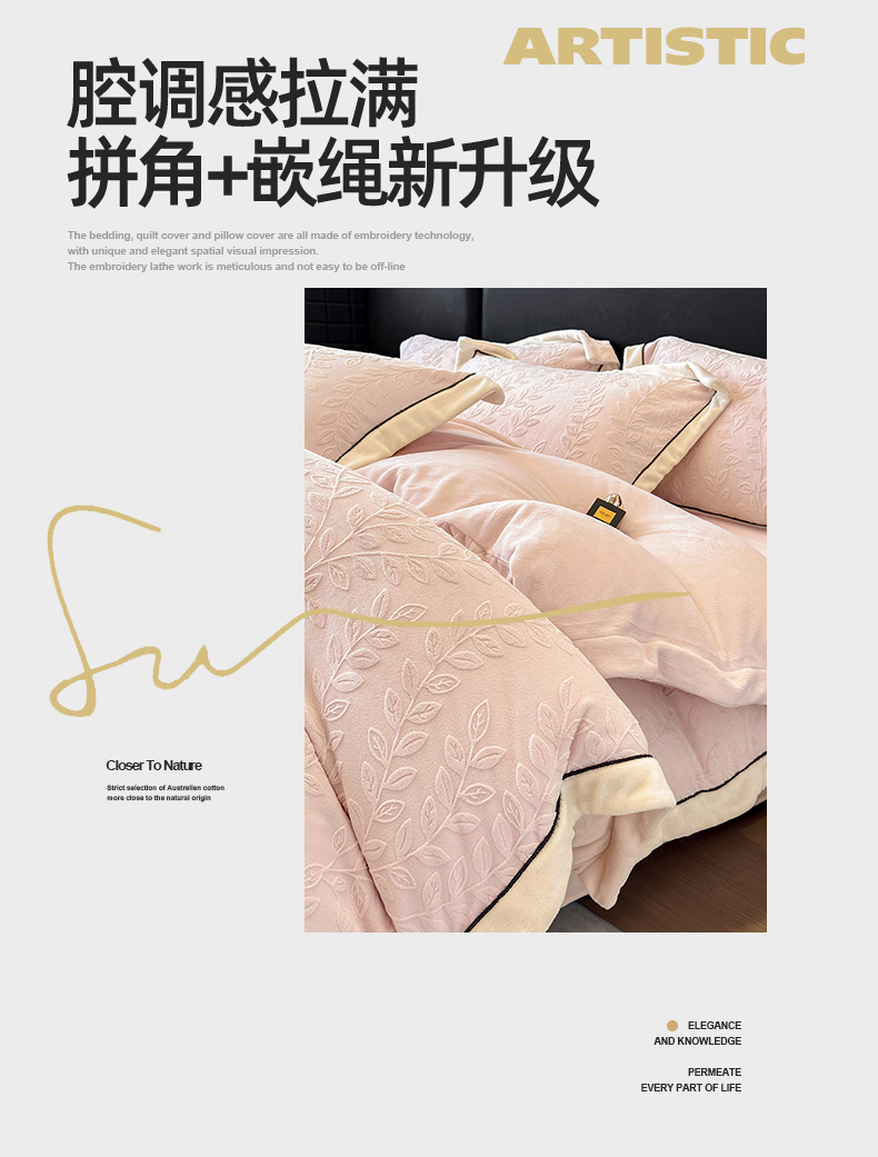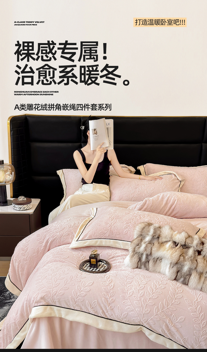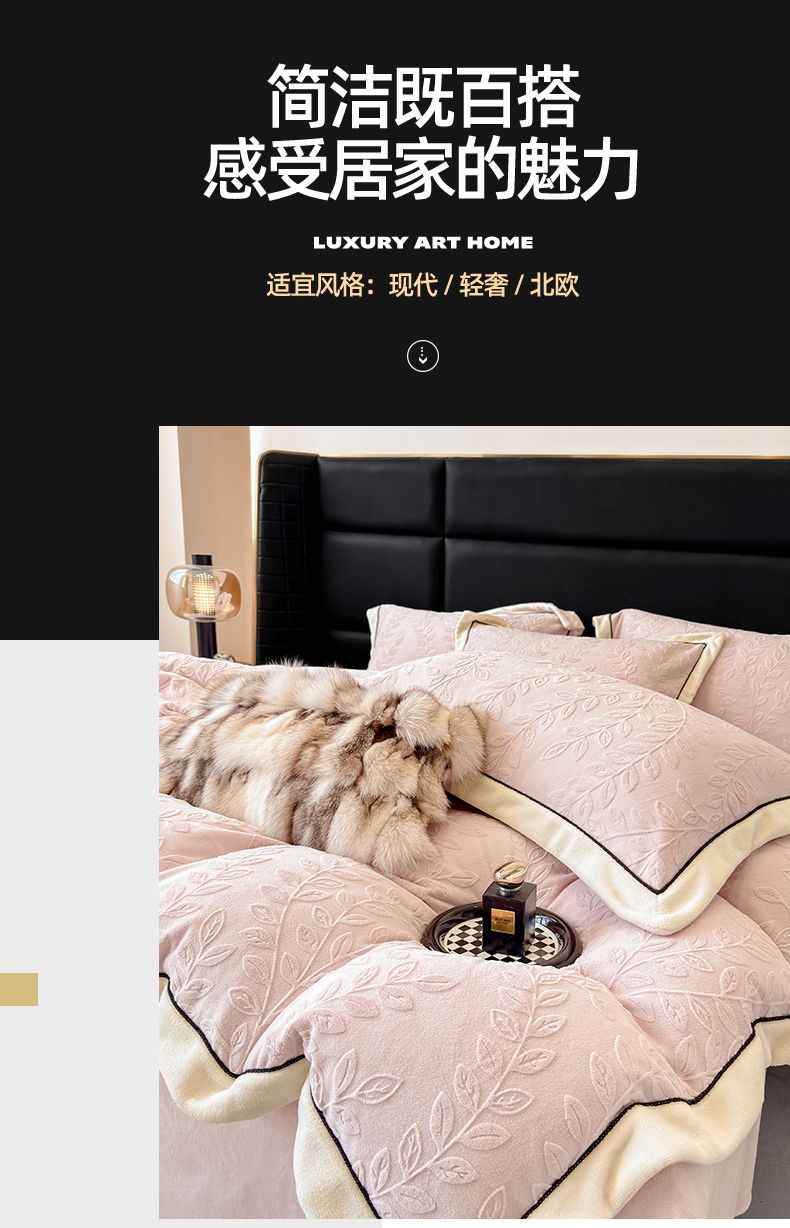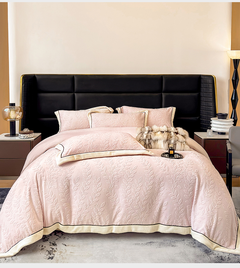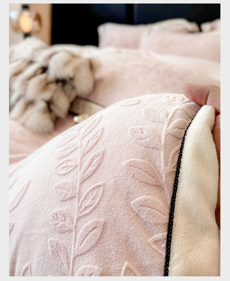 商品名称:金喜 2025秋冬新款230克高克重牛奶绒四件套雕花绒拼角宽边嵌绳系列四件套 花枝-桃粉
