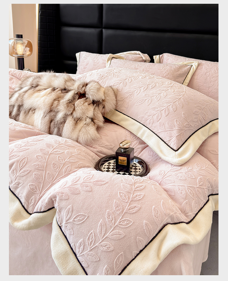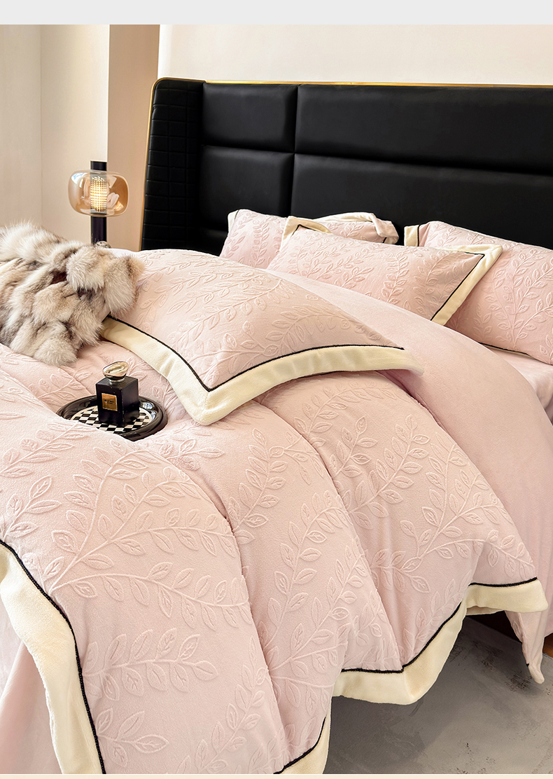 金喜 2025秋冬新款230克高克重牛奶绒四件套雕花绒拼角宽边嵌绳系列四件套 花枝-桃粉
