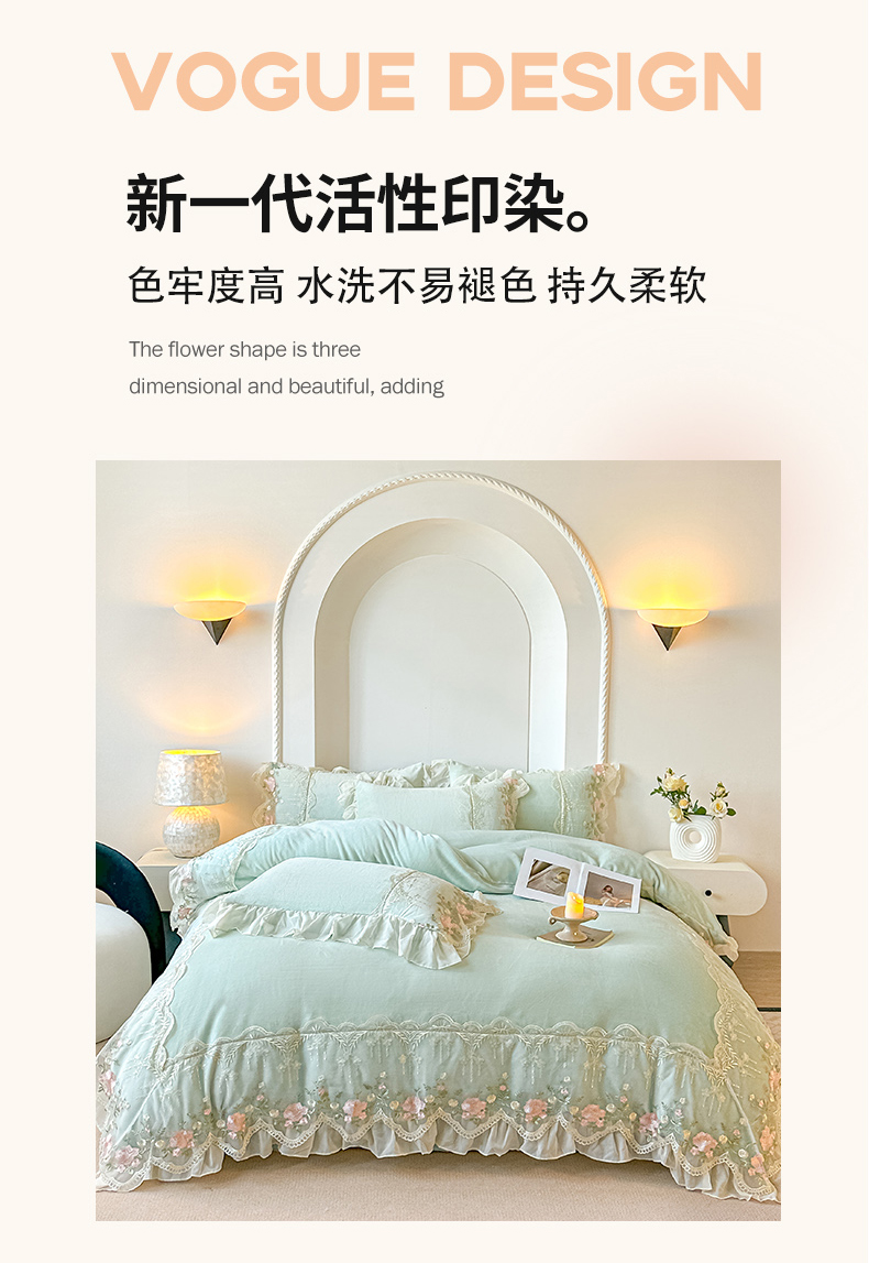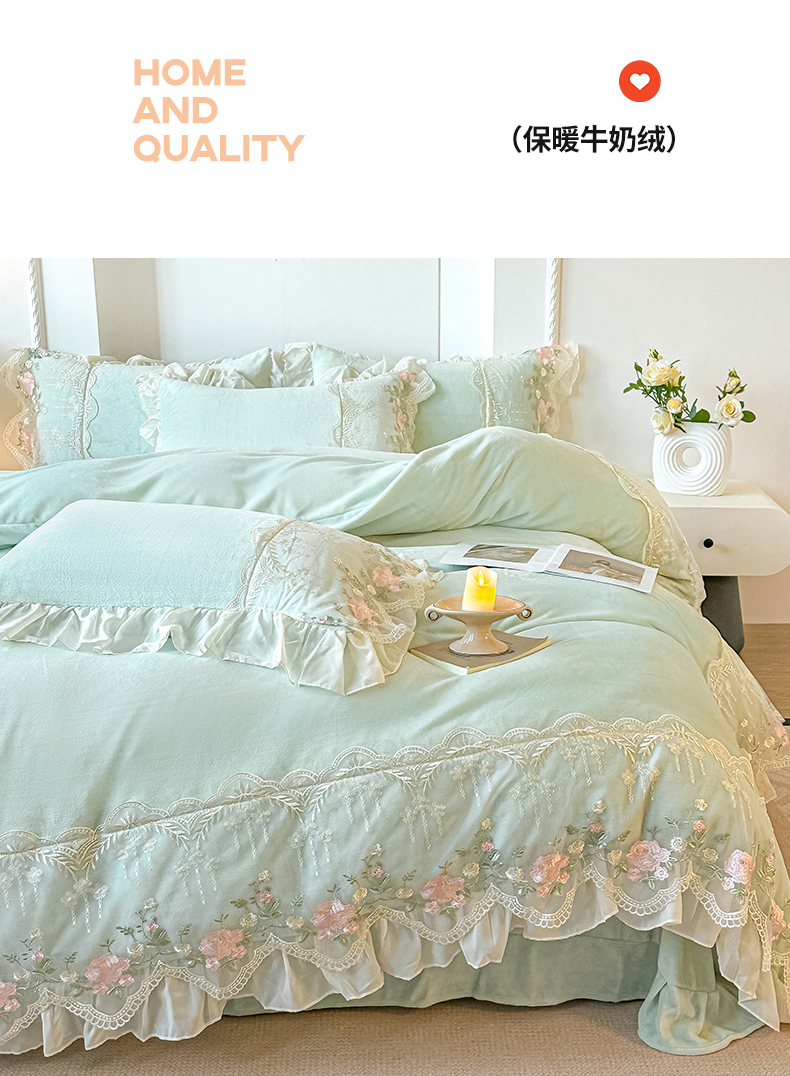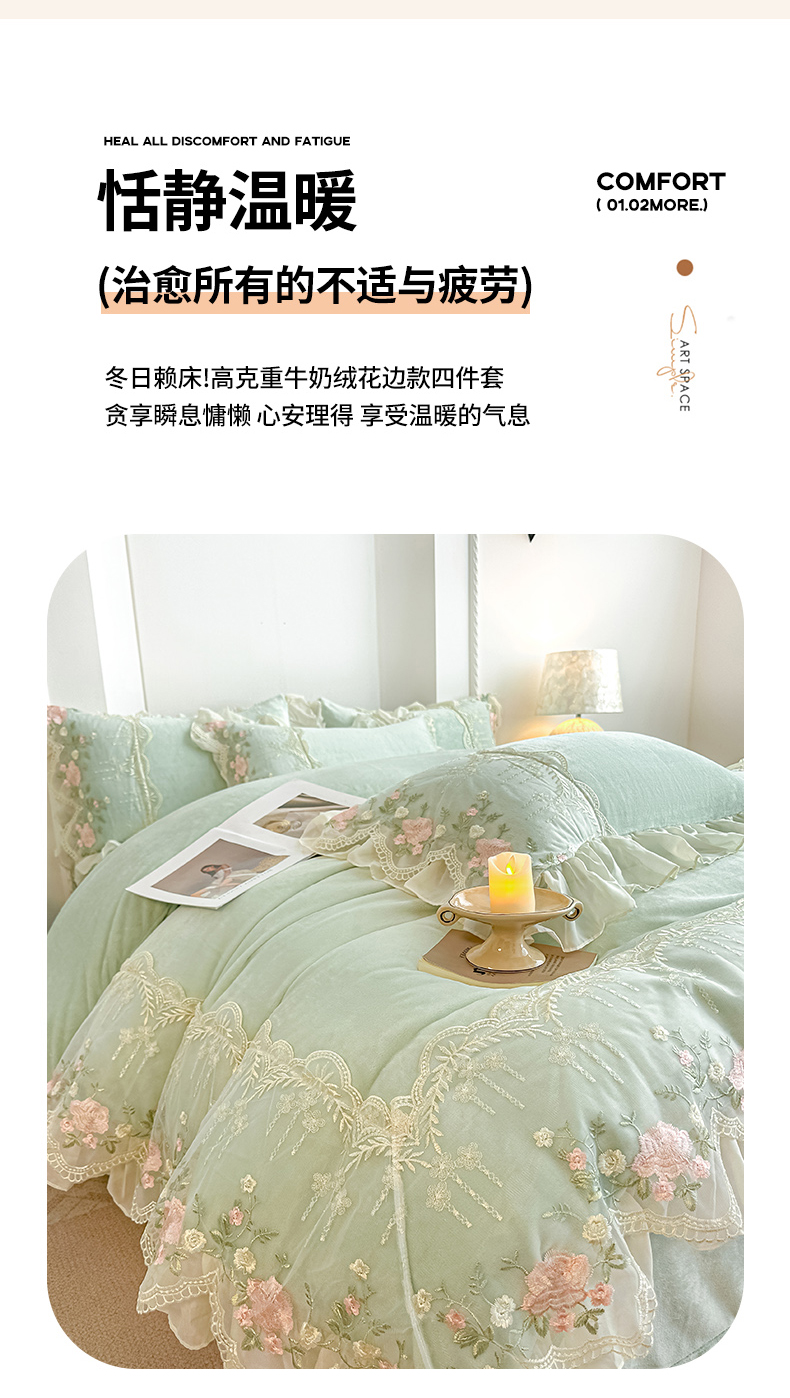 当前位置: 91家纺网 > 商品网购 > 床品套件 > 四件套 > 牛奶绒四件套 > 凯美家居 2025新款A类牛奶绒蕾丝刺绣四件套-锦上添花 锦上添花-浅绿