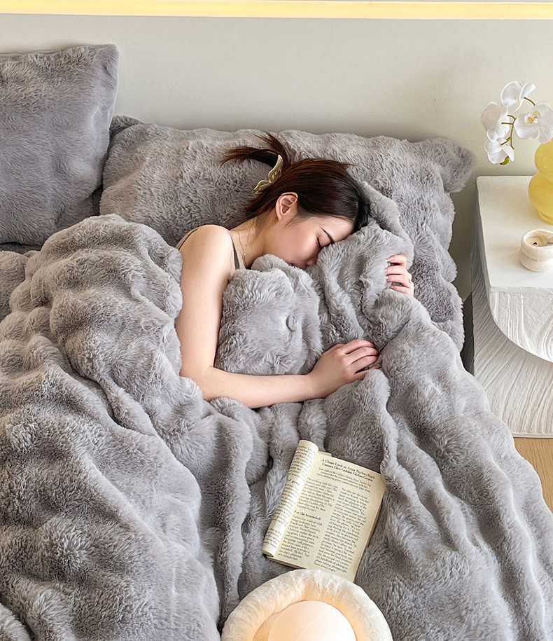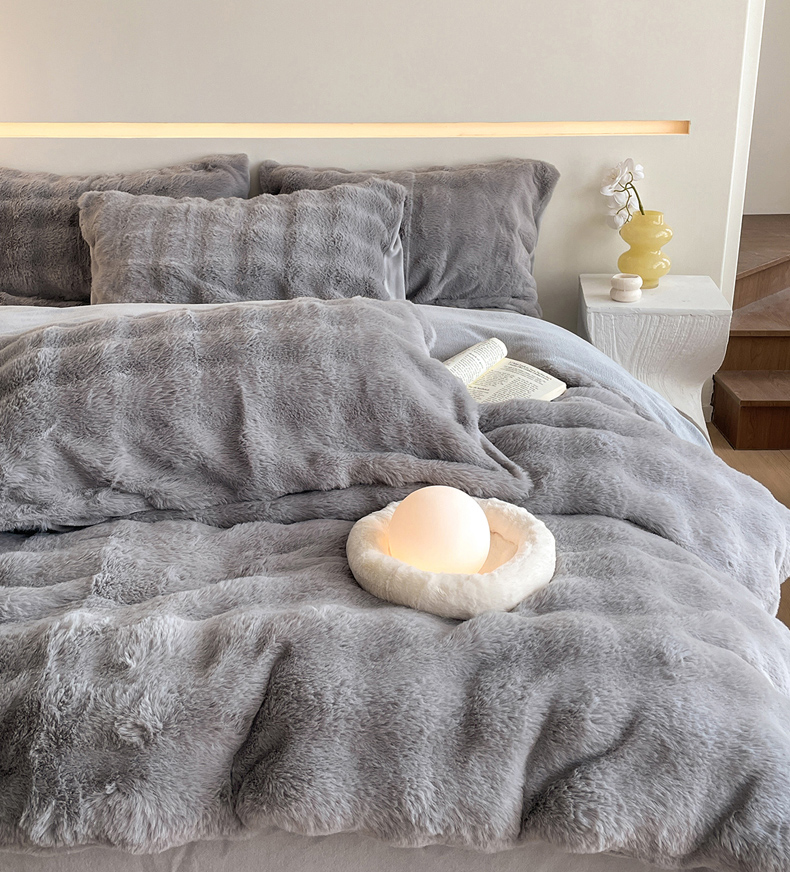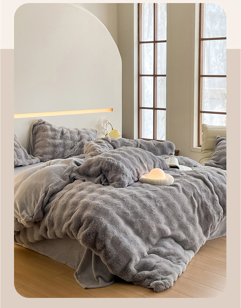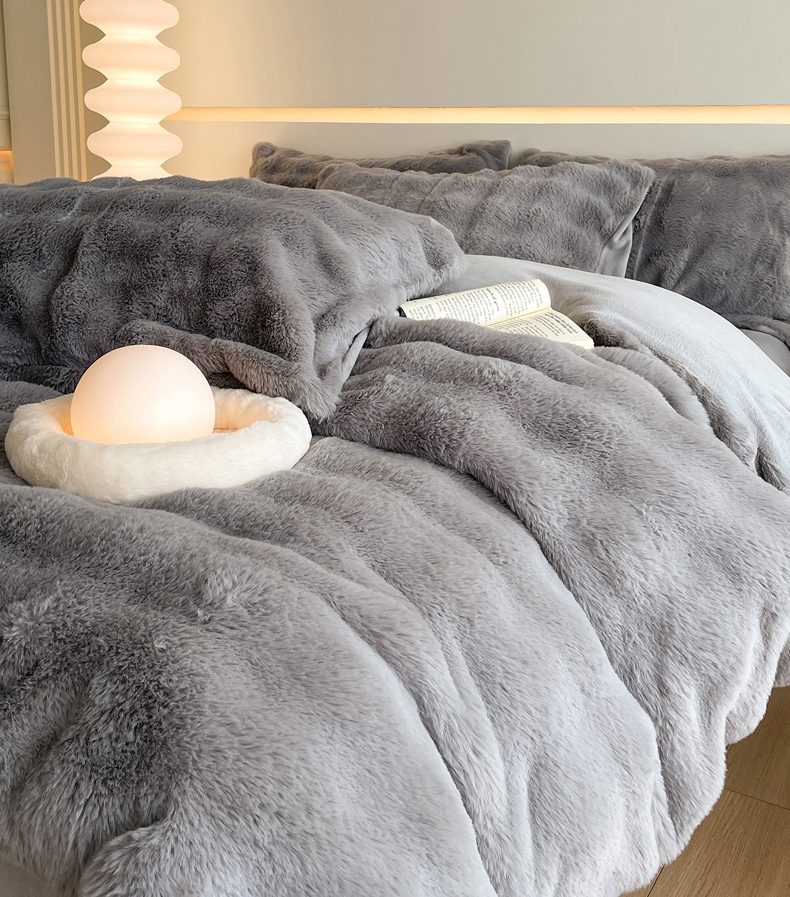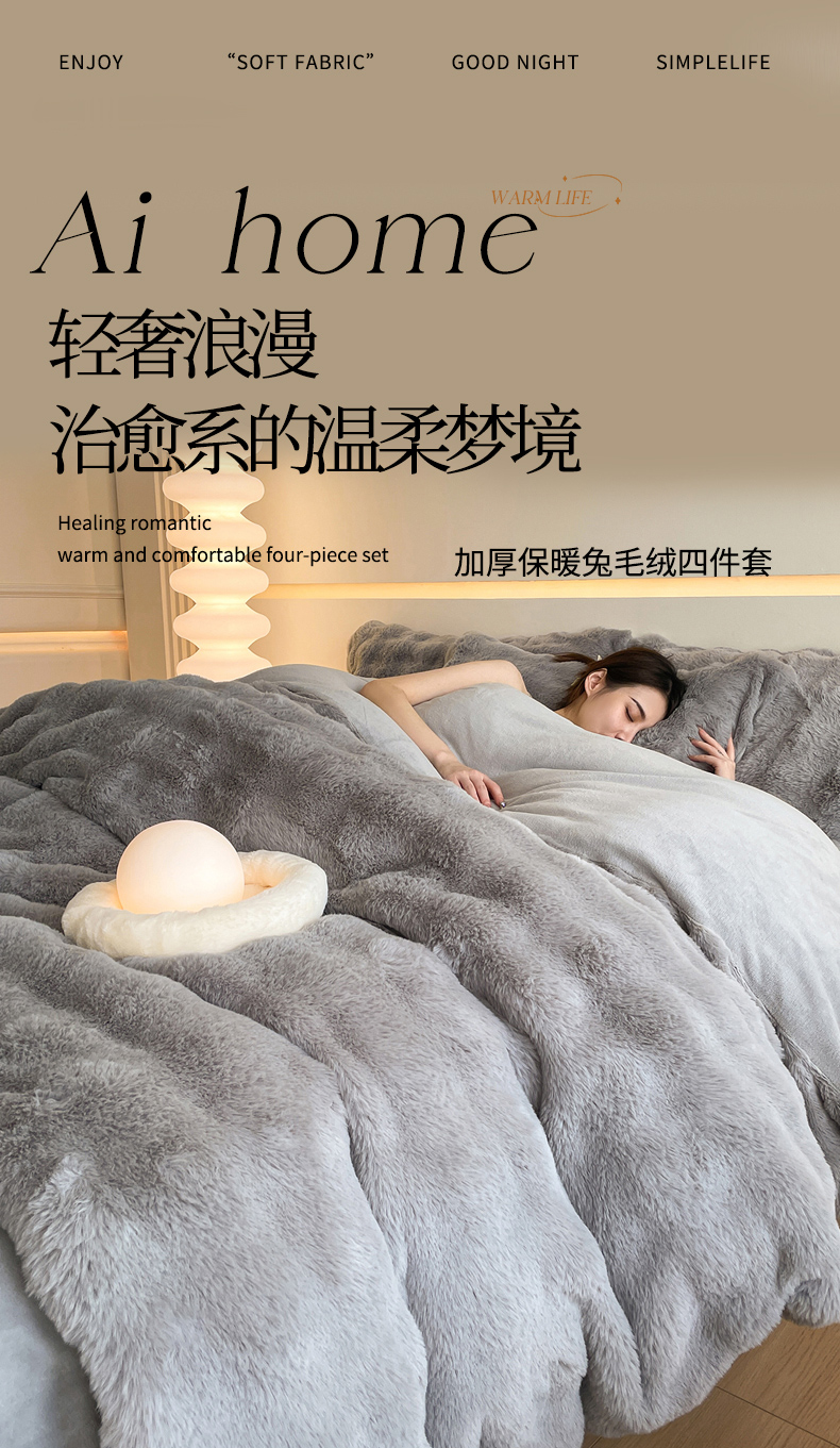 商品名称:曲之慕 2025新款高克重皮草绒牛奶绒兔毛四件套 颜可-灰