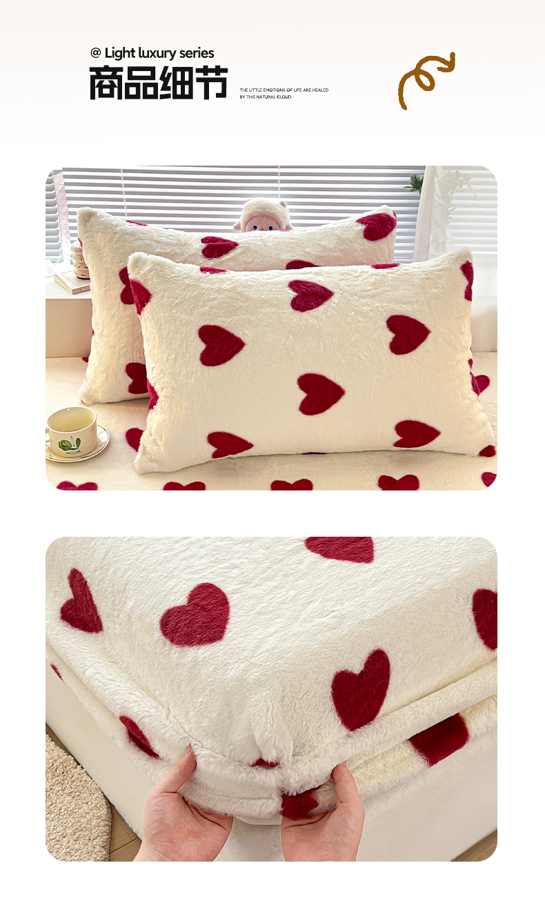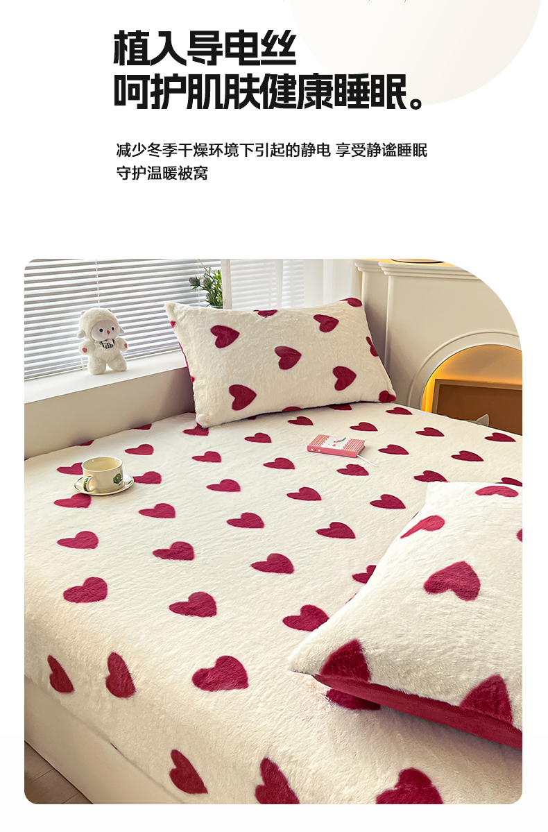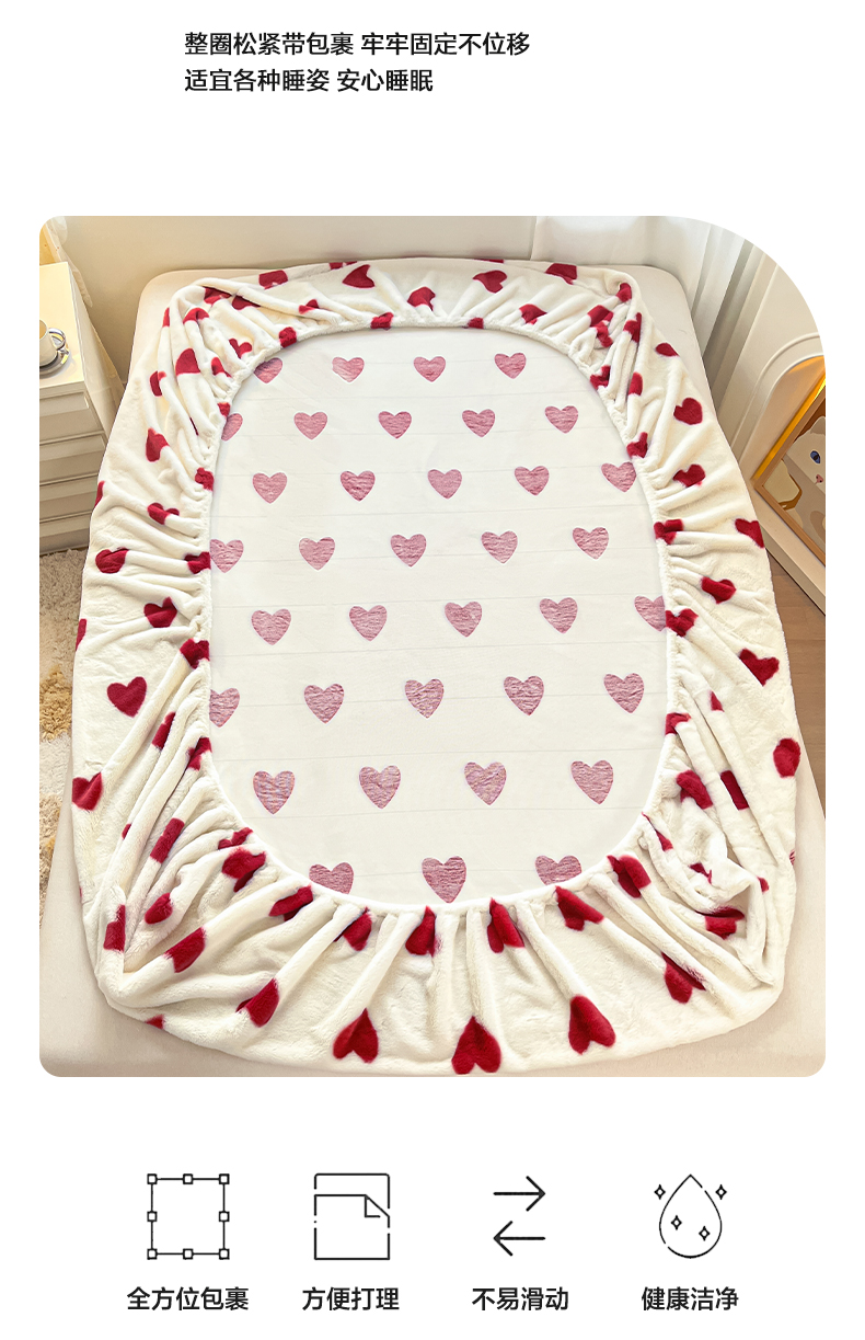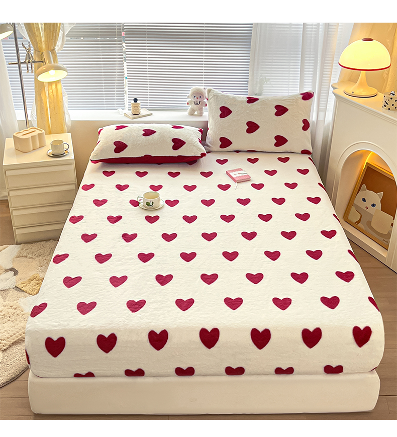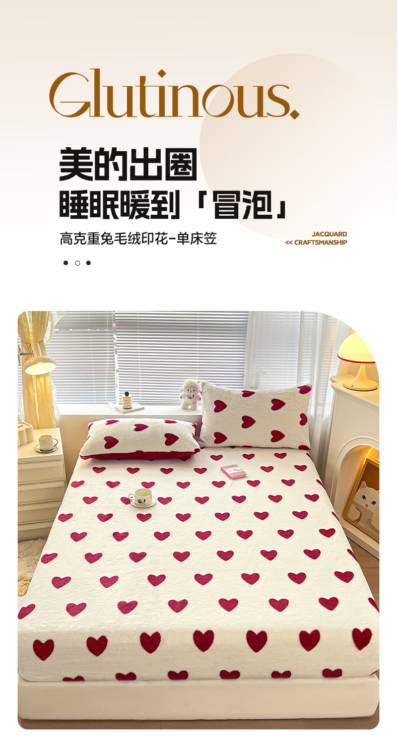 商品名称:雅居纺家纺 2025新款高克重兔绒印花单床笠-爱心 爱心-红