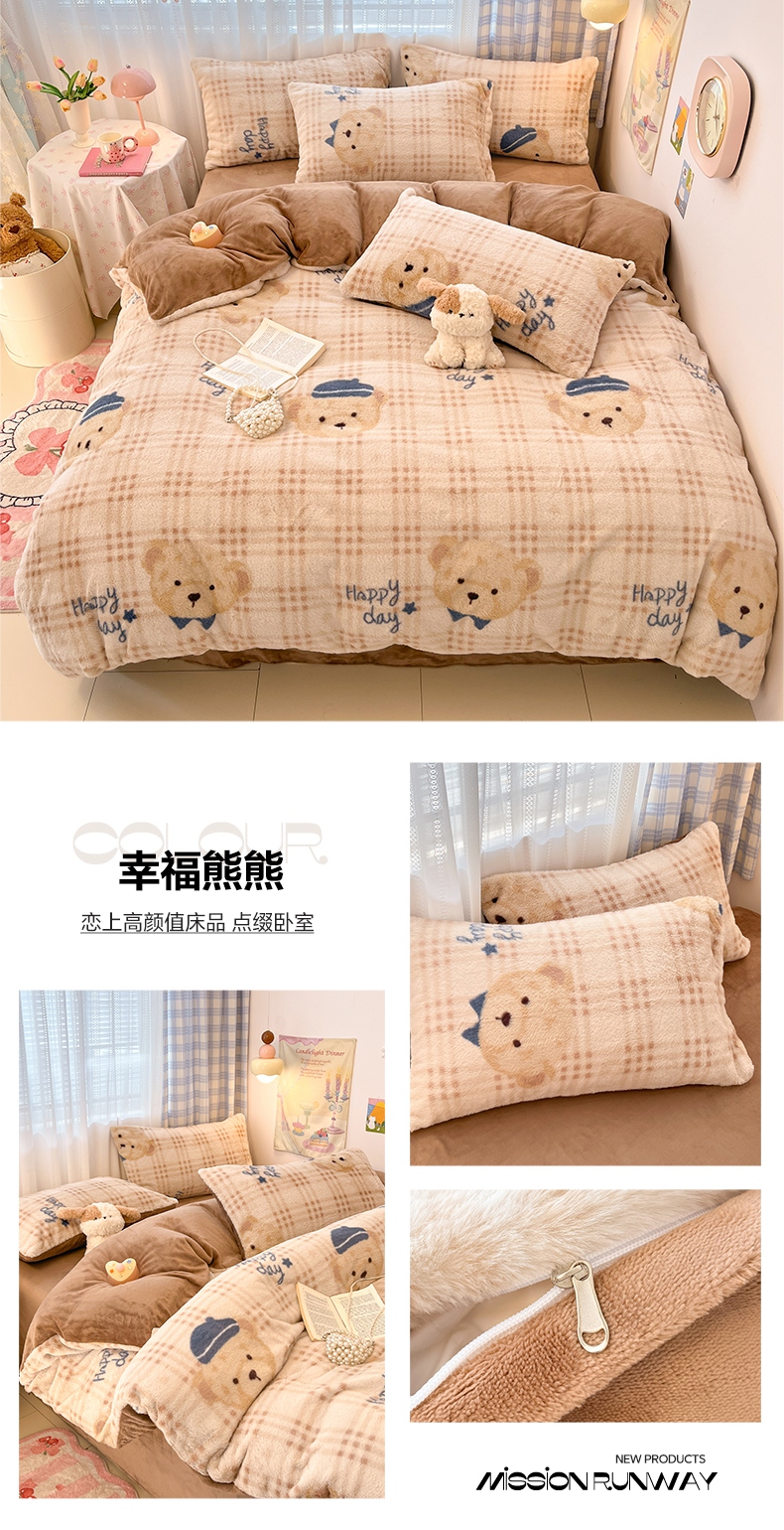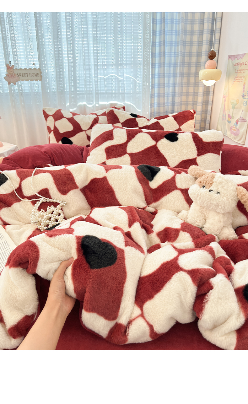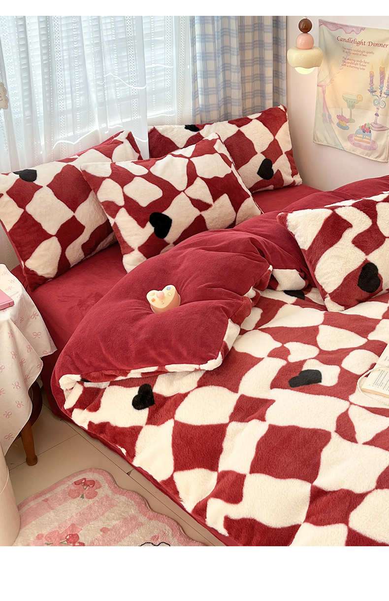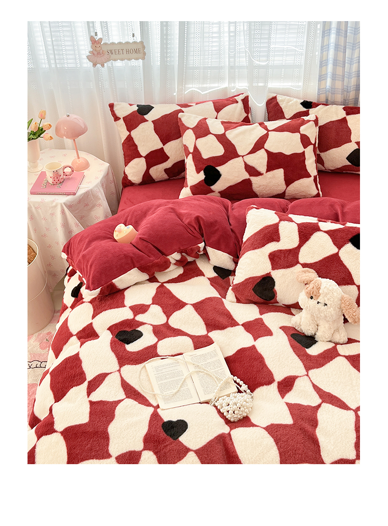 雅居纺家纺 2025新款保暖舒适兔绒印花四件套 红色爱心格
