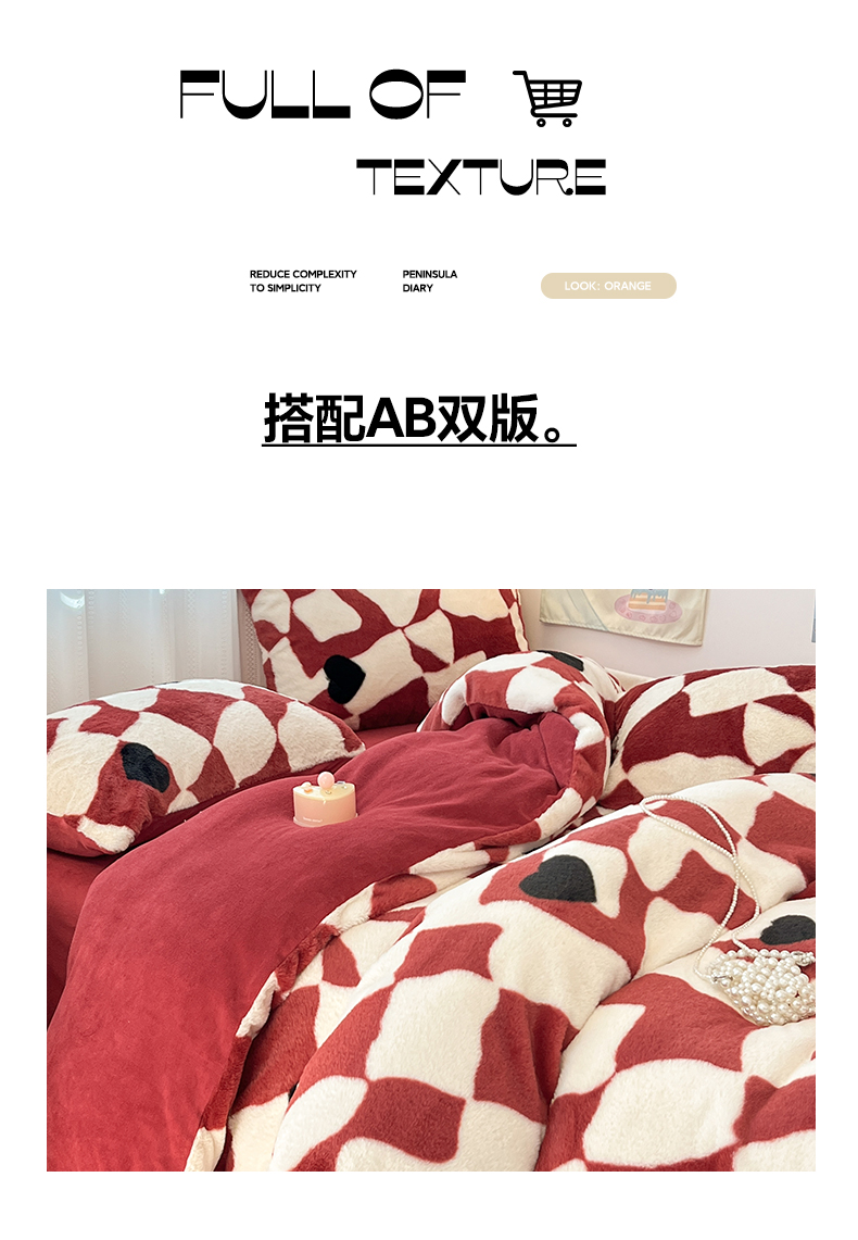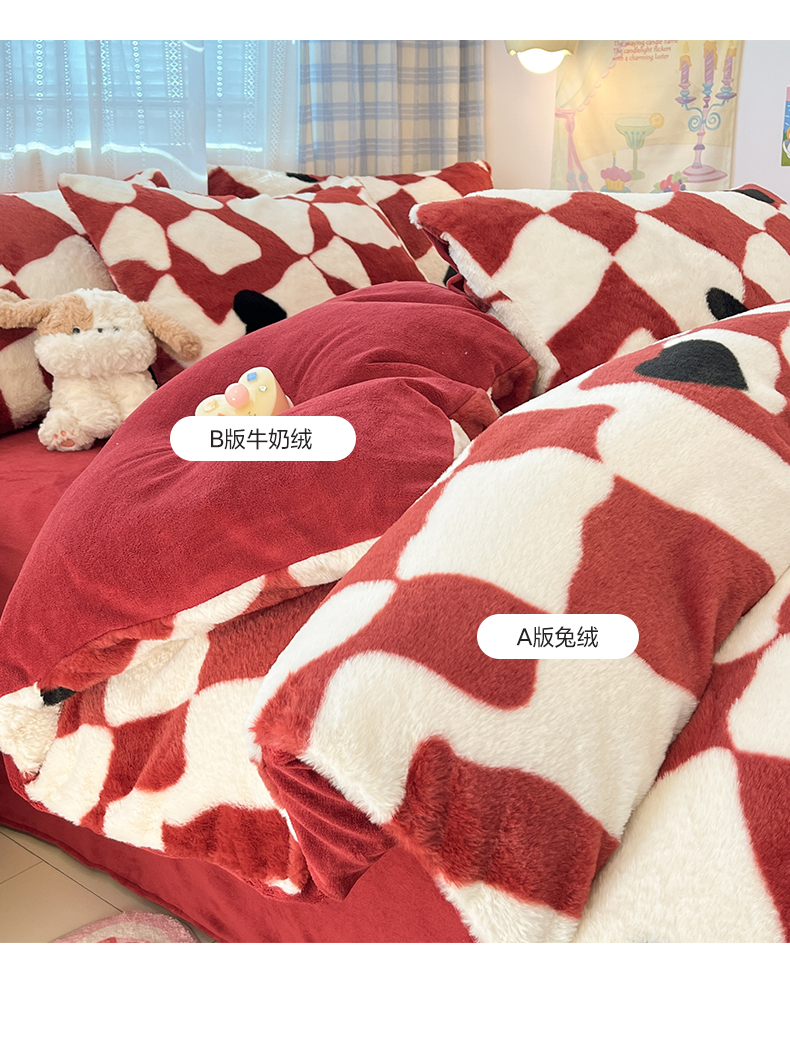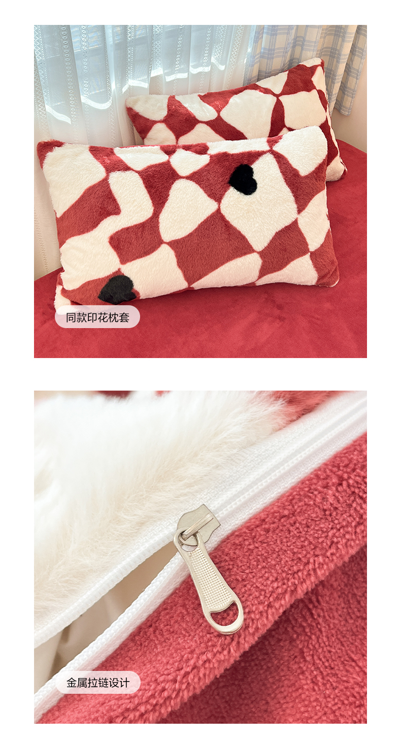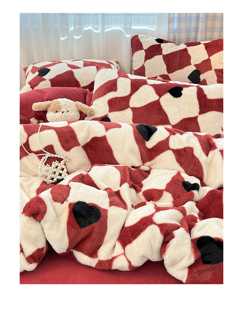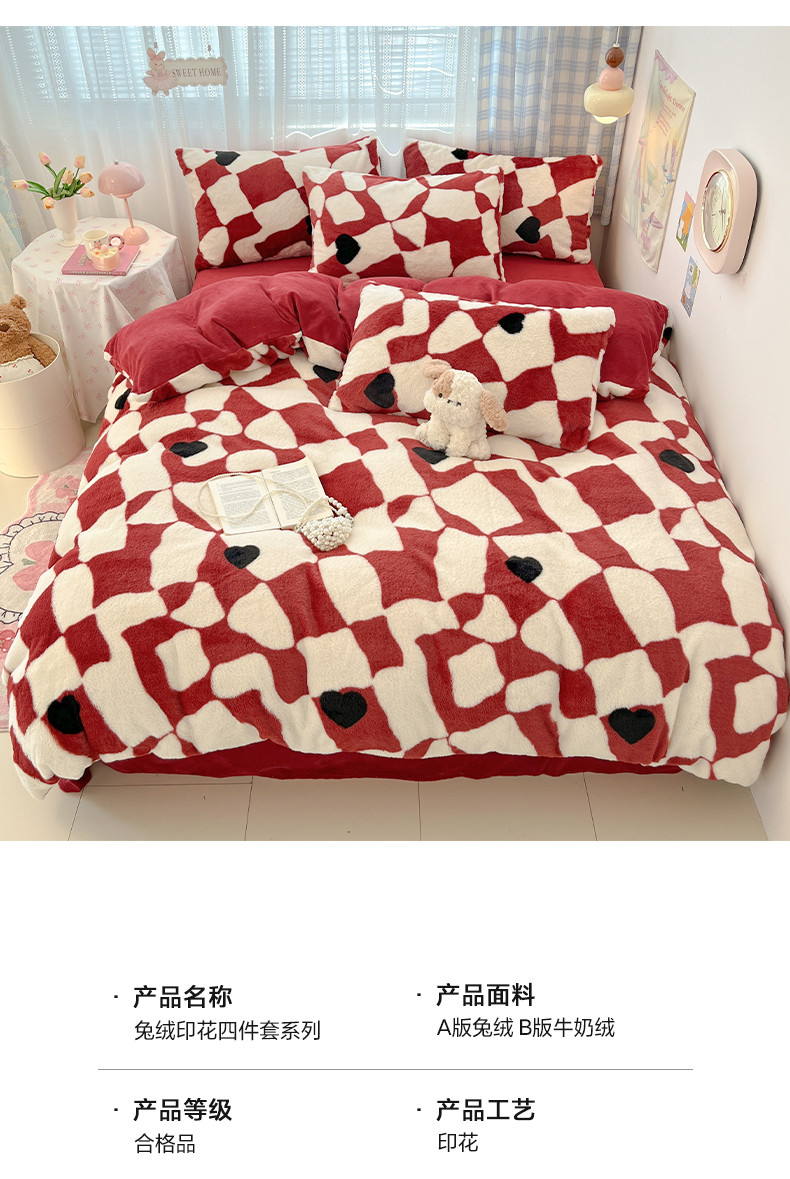 商品名称:雅居纺家纺 2025新款保暖舒适兔绒印花四件套 红色爱心格
