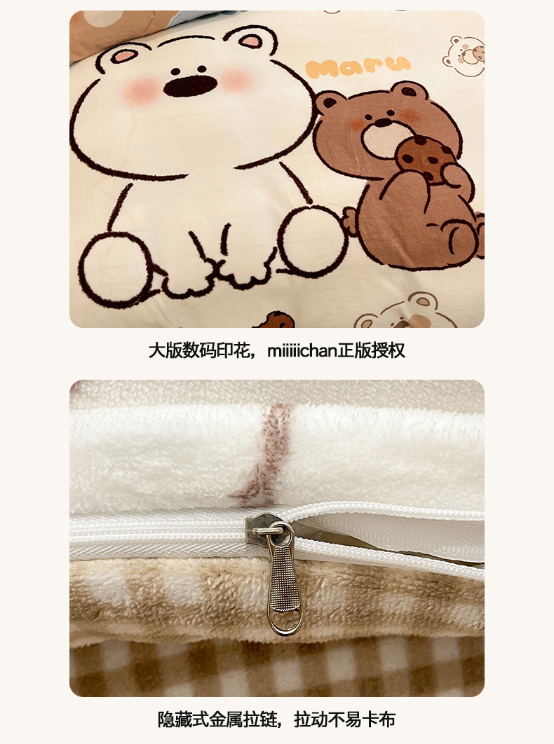 商品名称:桃子家居 2025新品A类正版授权miiiiichan咪酱大版卡通数码印花加厚牛奶绒系列四件套 绒大版-咪酱宝宝熊