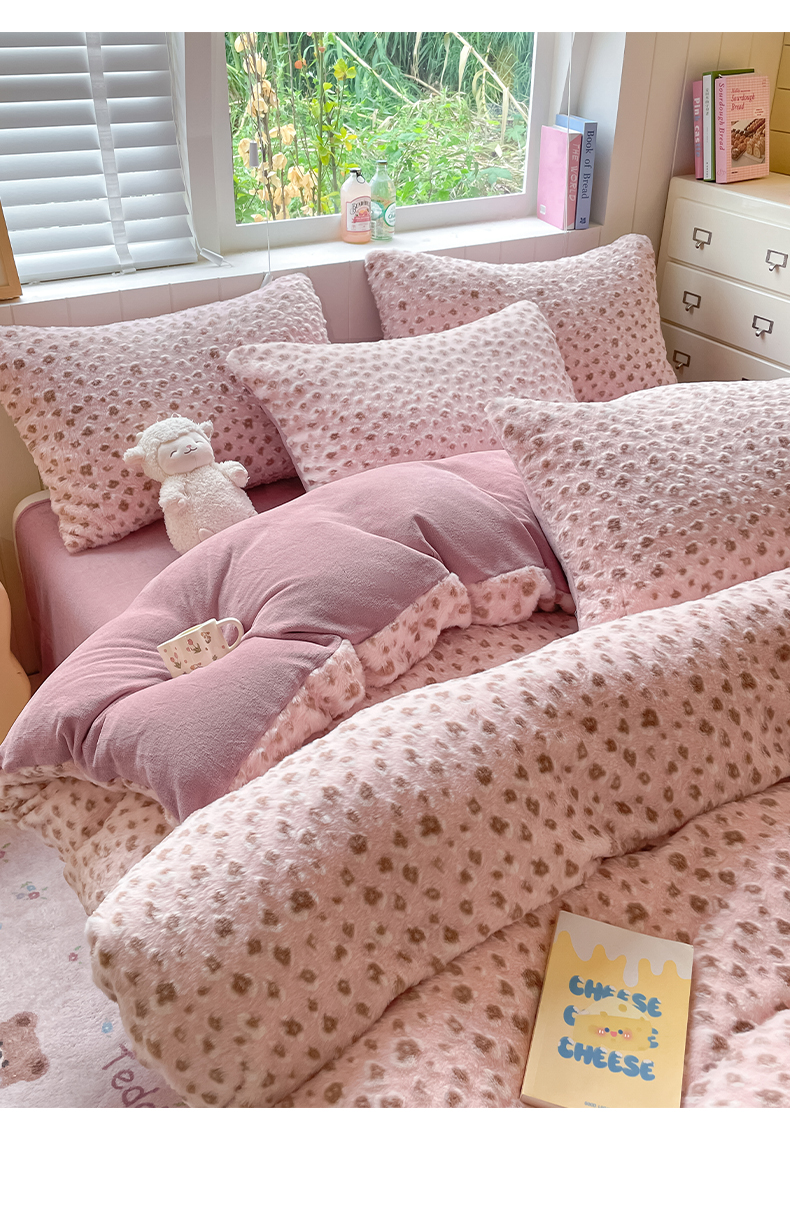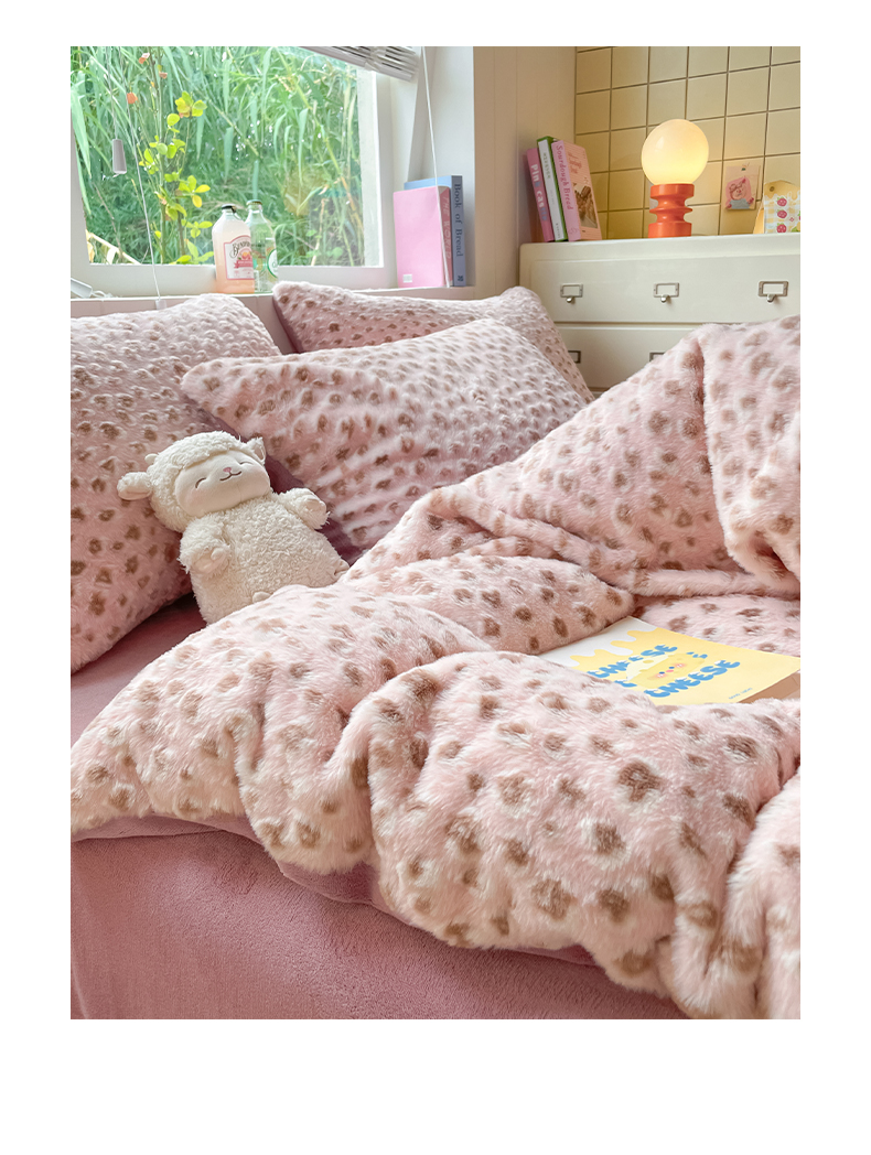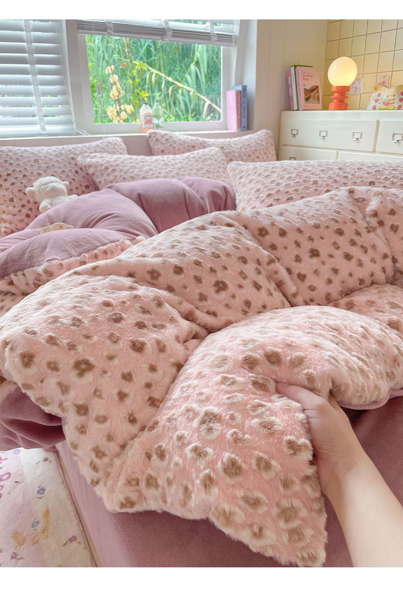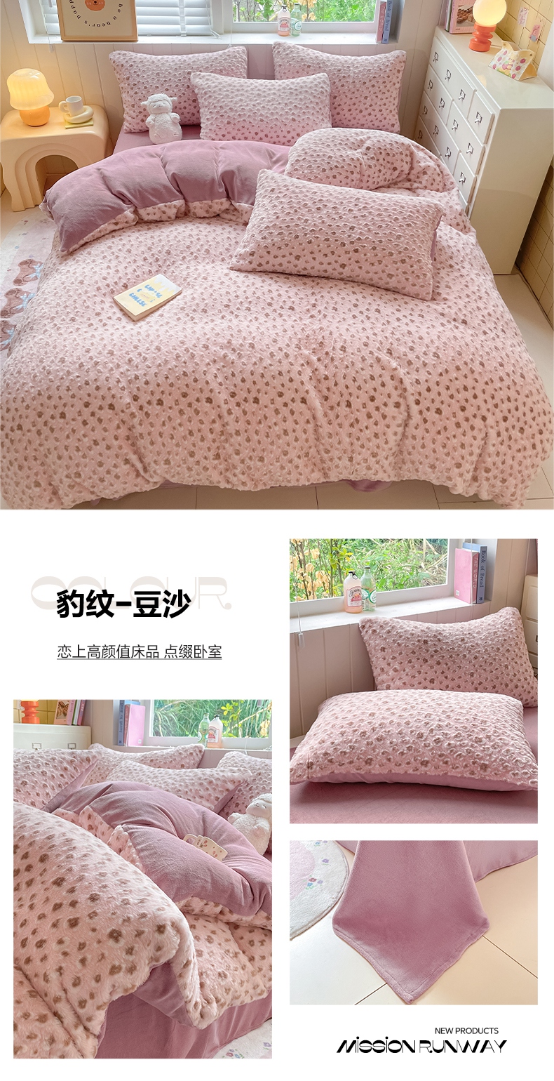 商品名称:雅居纺家纺 2025新款立体雕花兔绒牛奶绒四件套 豹纹-豆沙