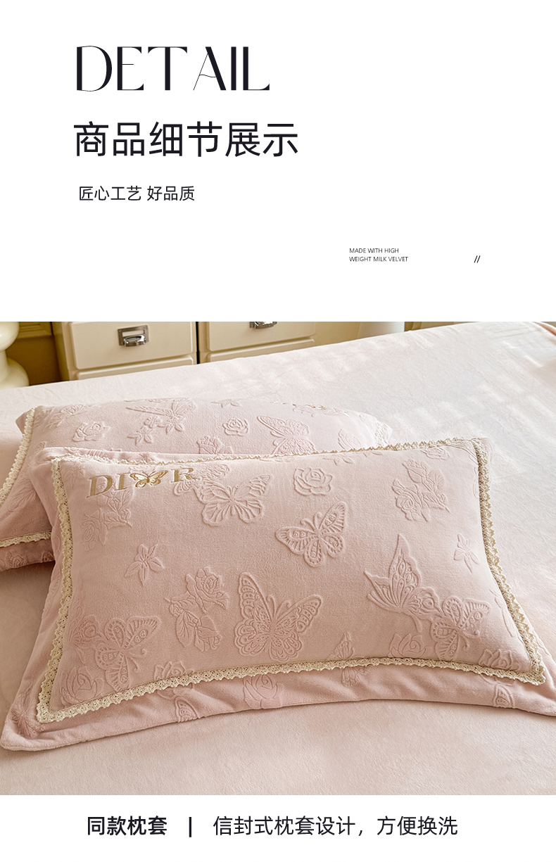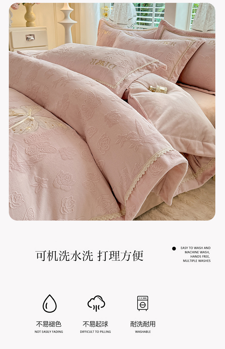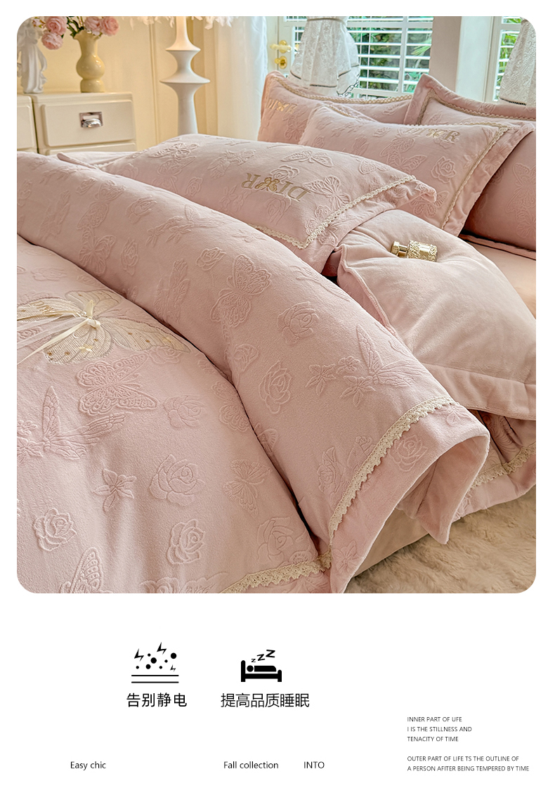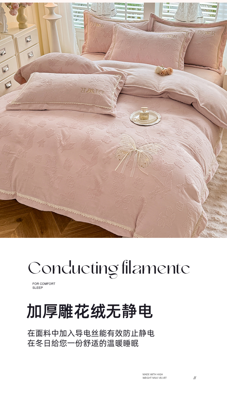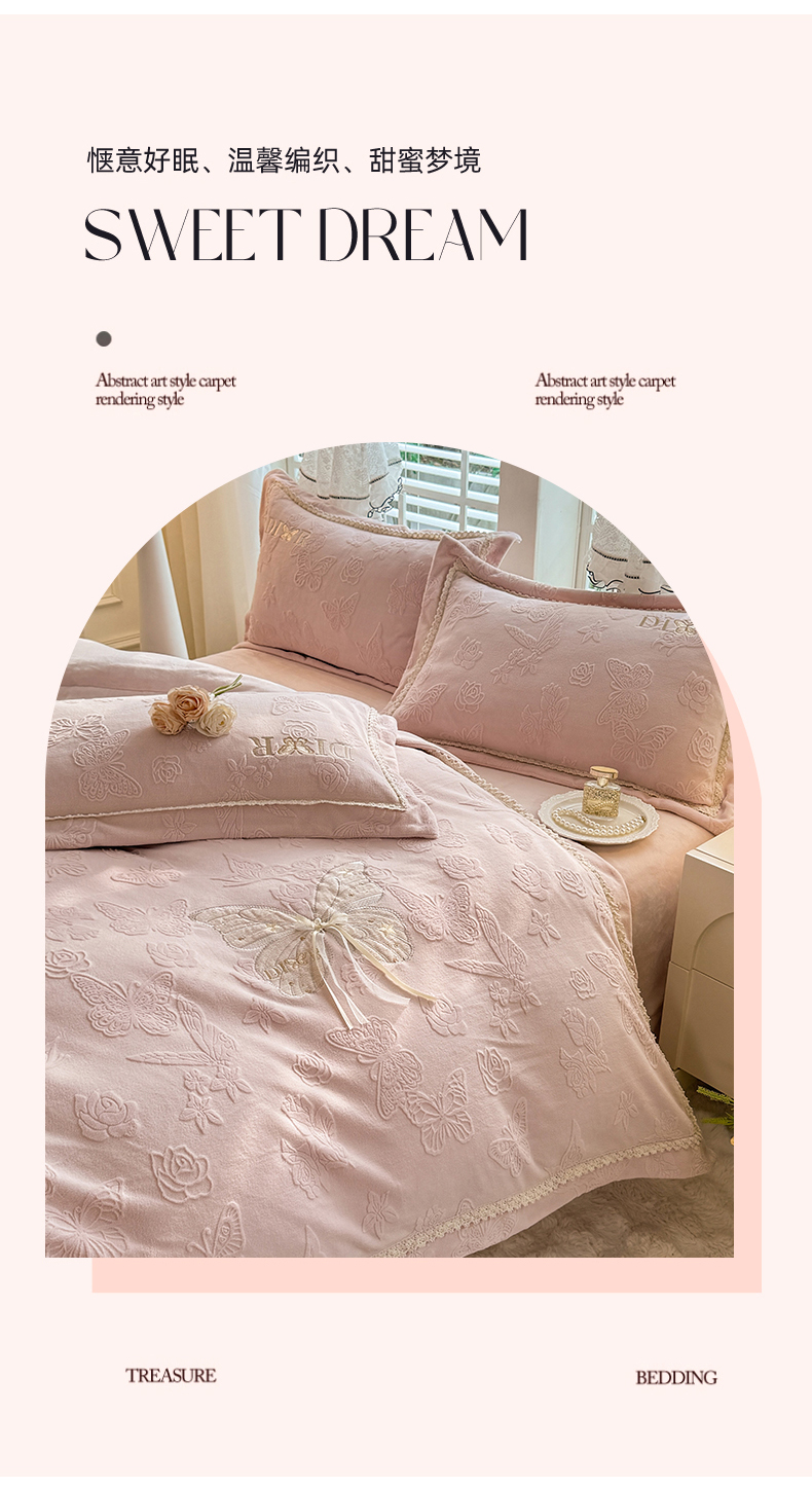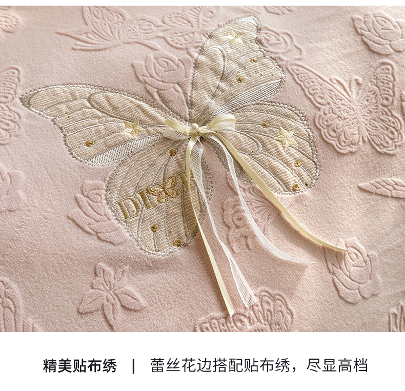 商品名称:艾唯希家纺 2025新款韩版雕花绒工艺四件套全消光牛奶绒-语蝶系列 语蝶-新粉