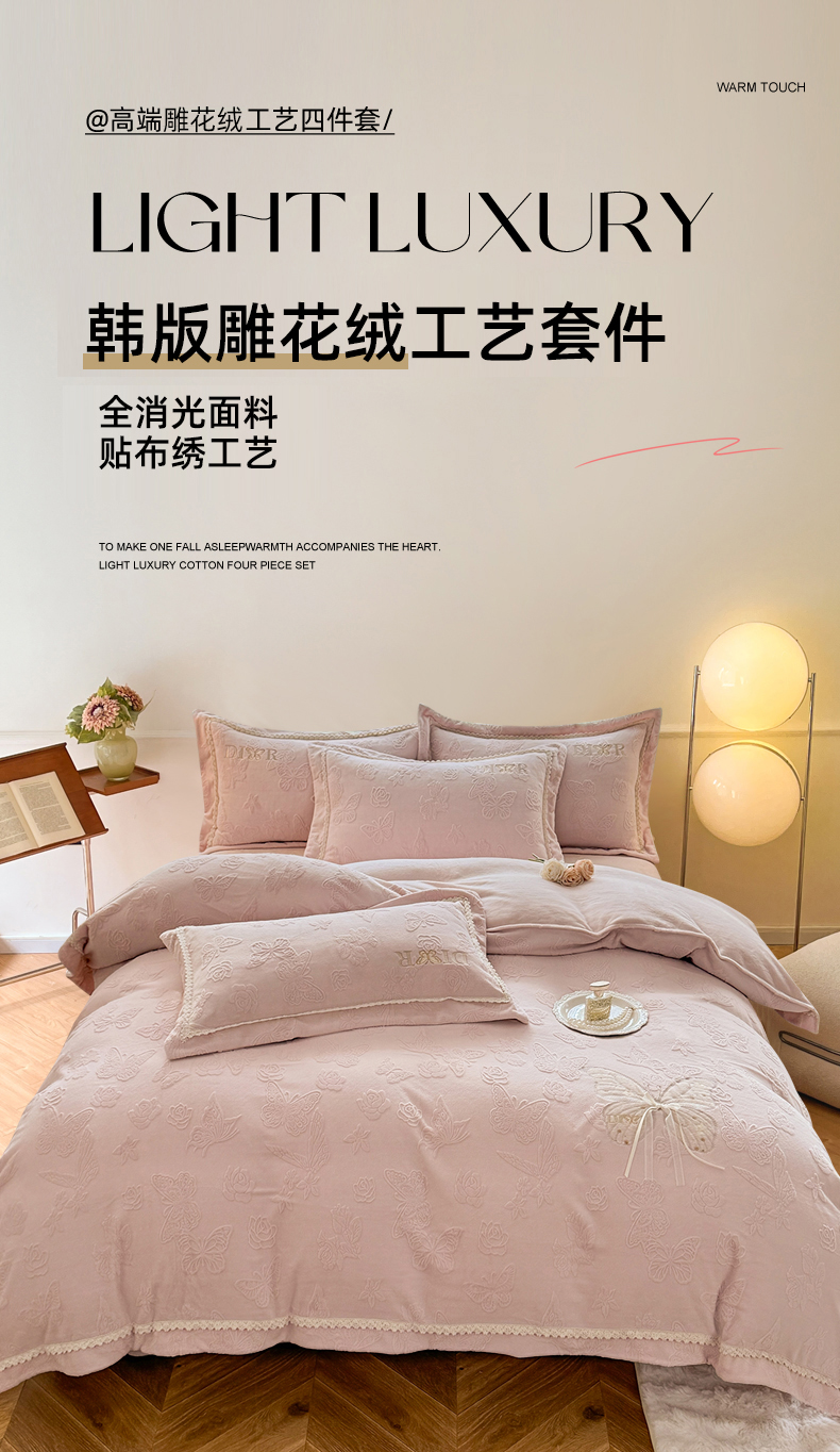 艾唯希家纺 2025新款韩版雕花绒工艺四件套全消光牛奶绒-语蝶系列 语蝶-新粉