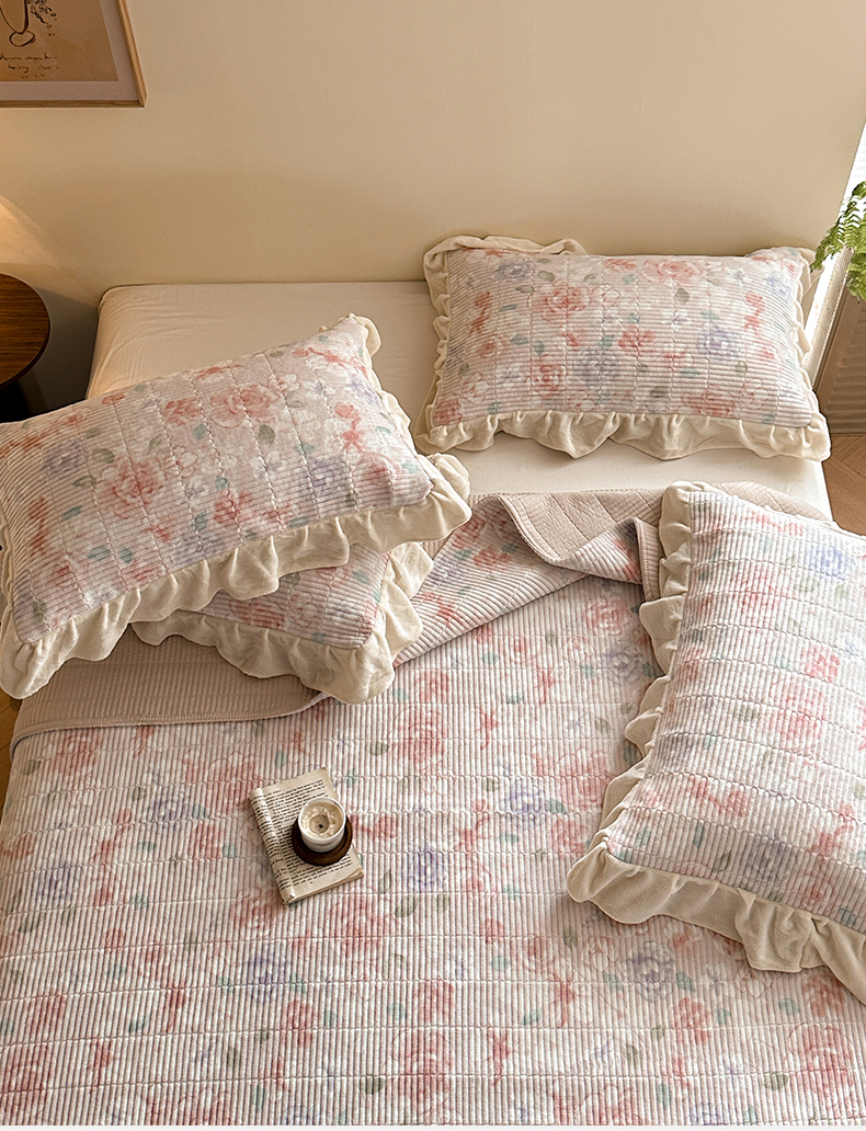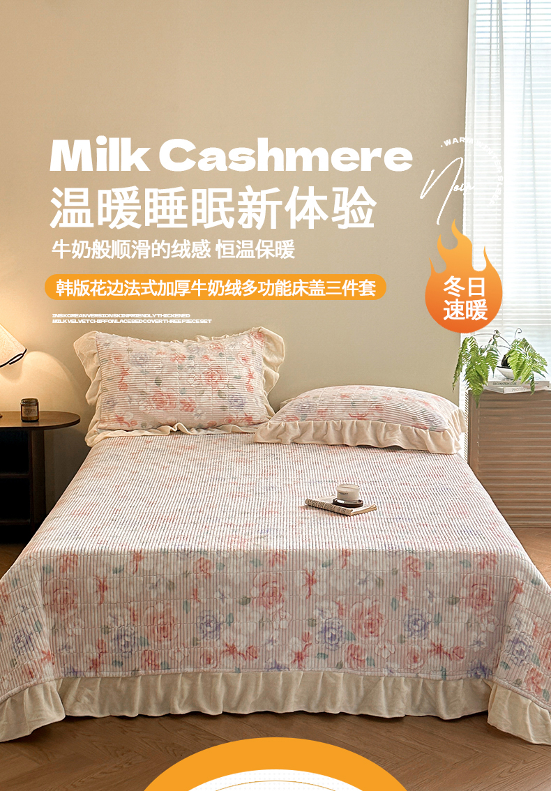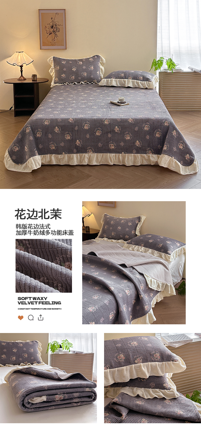 桃心家居 2025新款韩版花边法式花卉碎花加厚牛奶绒多功能床盖单件单床盖床盖三件套单品 绒床盖-花边微朵粉