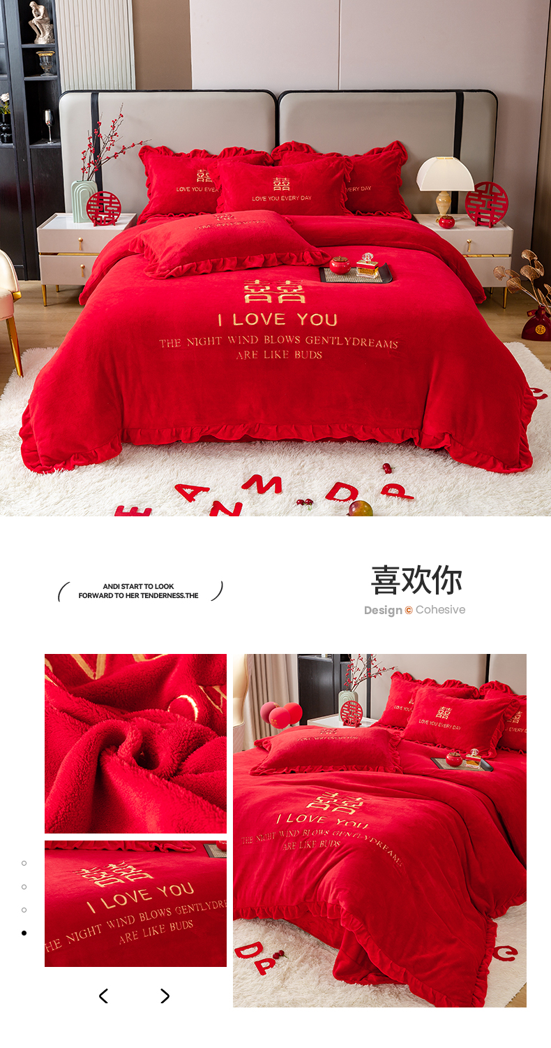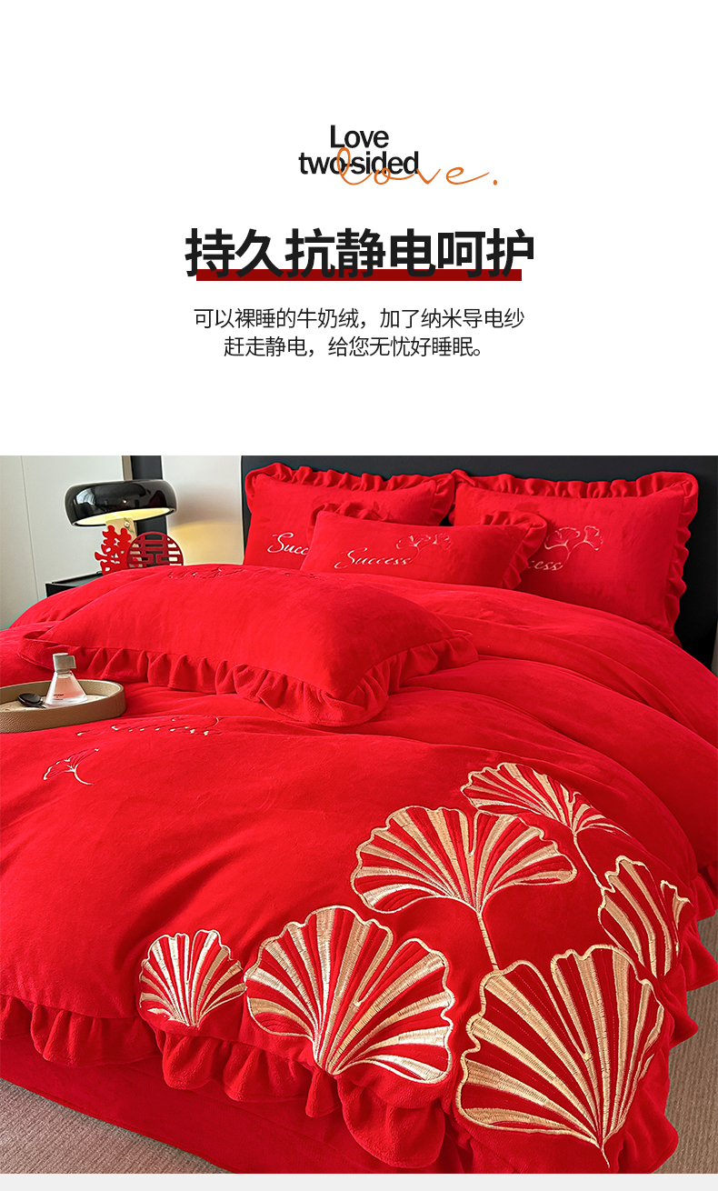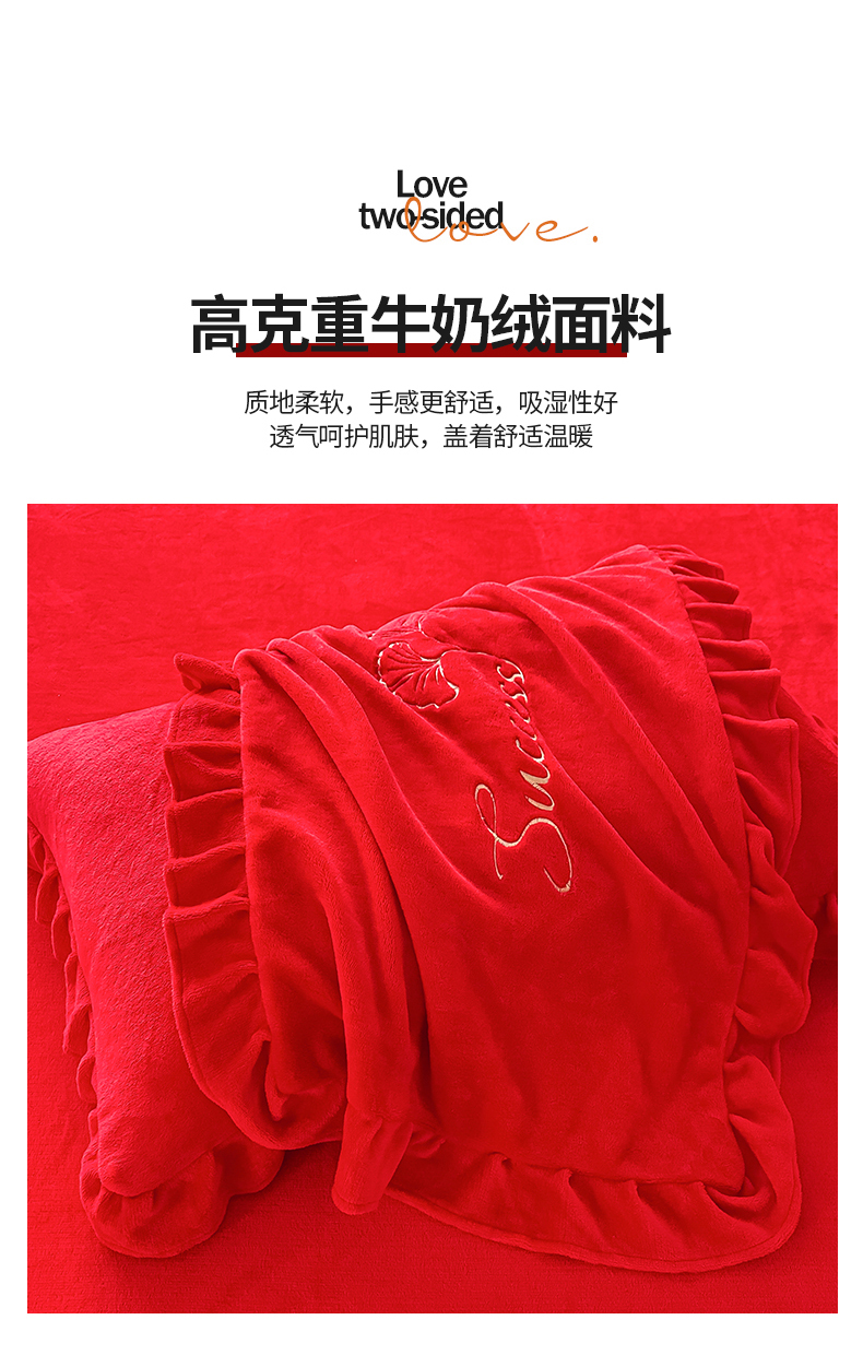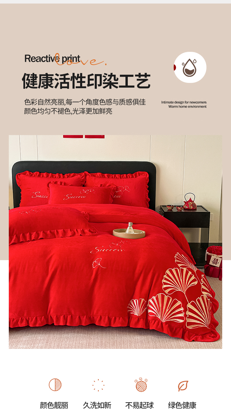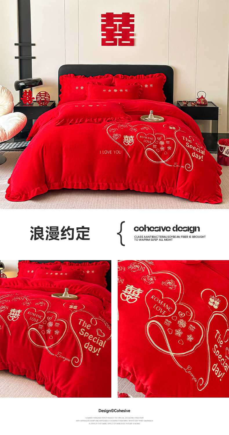 商品名称:银石 2025新款230克全消光牛奶绒婚庆大红高克重四件套 百年好合