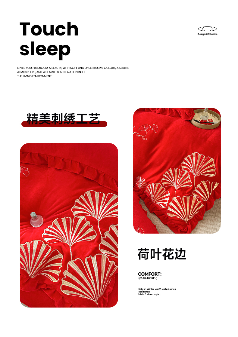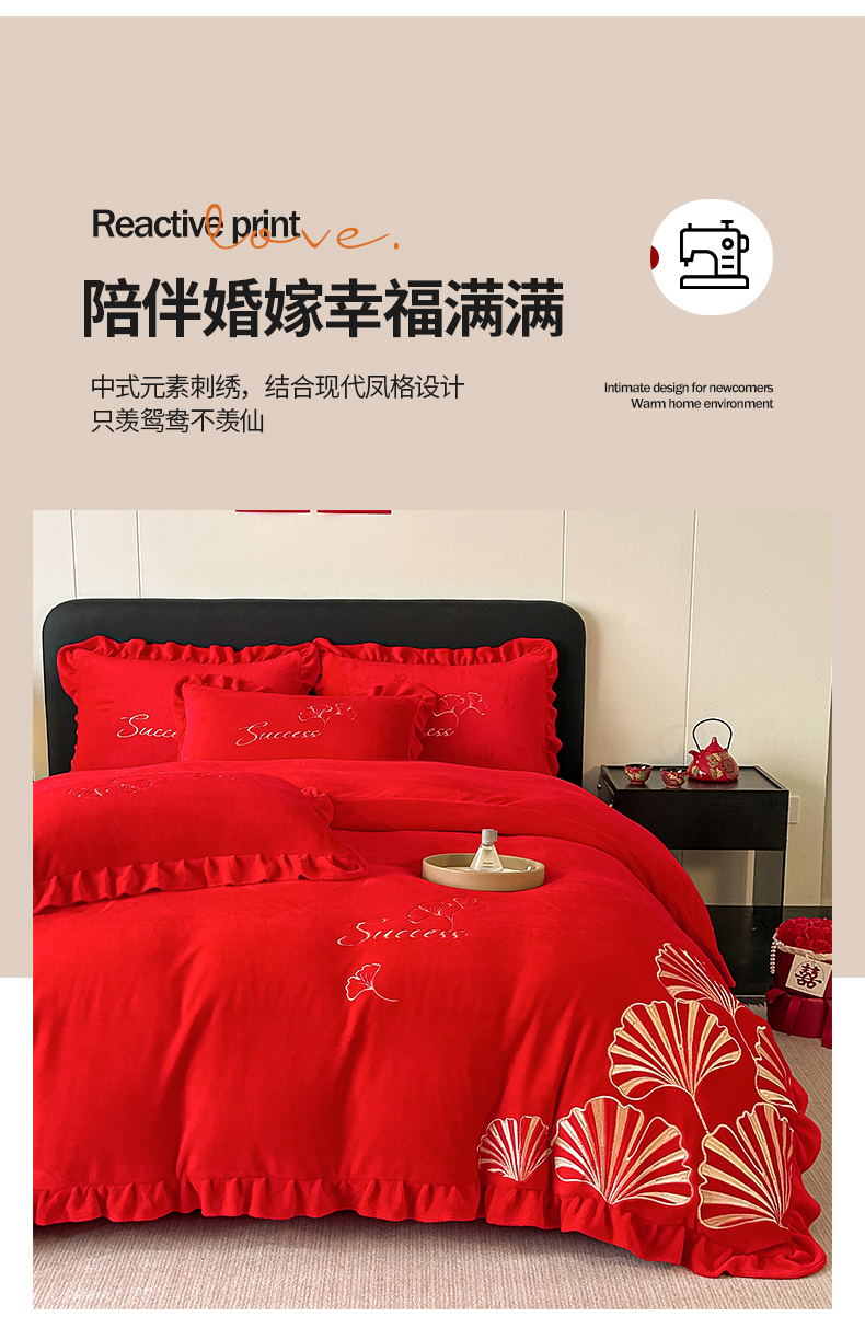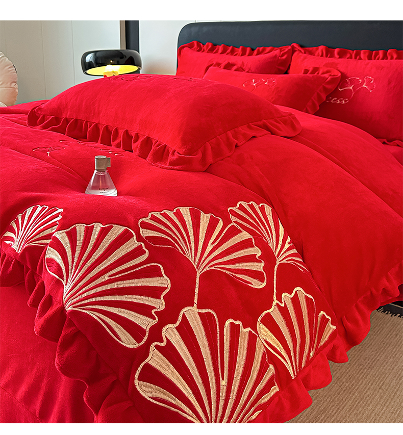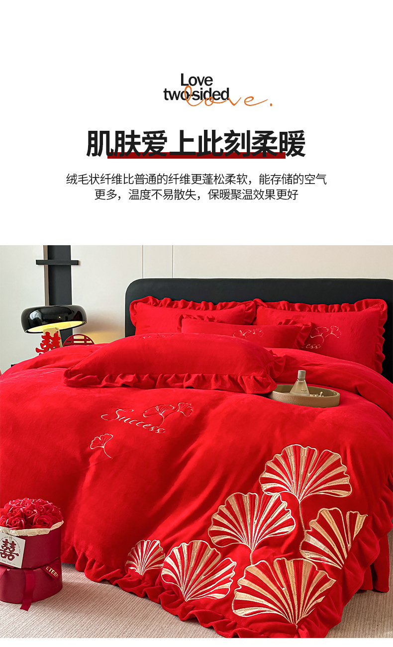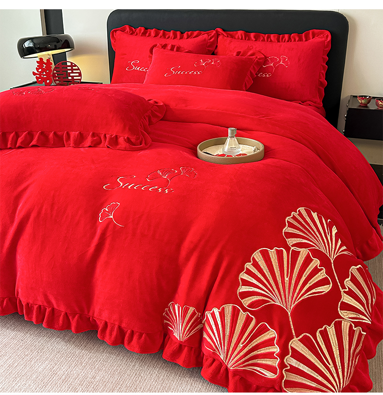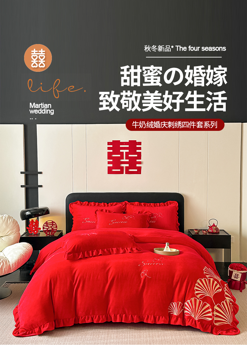 商品名称:银石 2025新款230克全消光牛奶绒婚庆大红高克重四件套 百年好合