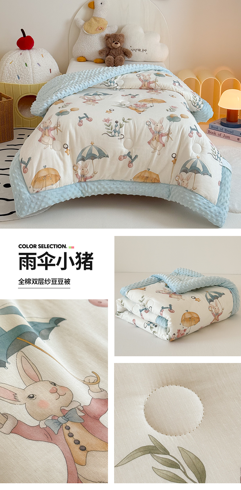 (总)嗨生活 2025新款全棉双层纱豆豆被 儿童被 春秋被 冬被 幼儿园被子,草莓兔兔,花丛小兔,米菲兔,汽车乐园,挖机恐龙,玩具屋,小海豚,熊猫盼盼