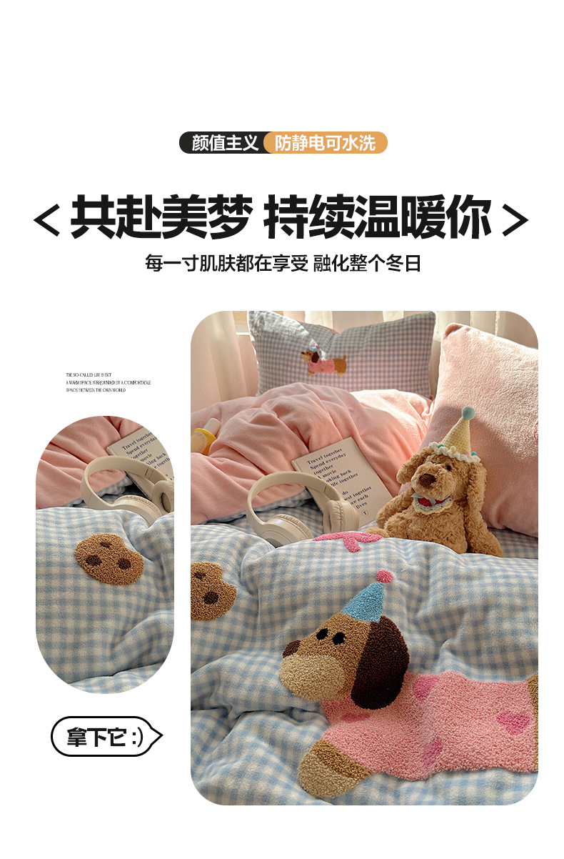 (总)顾里家纺 2024新款ins奶萌格子狗狗毛巾绣牛奶绒四件套,粉格小狗,黄格小狗,咖格小狗,蓝格小狗,绿格小狗