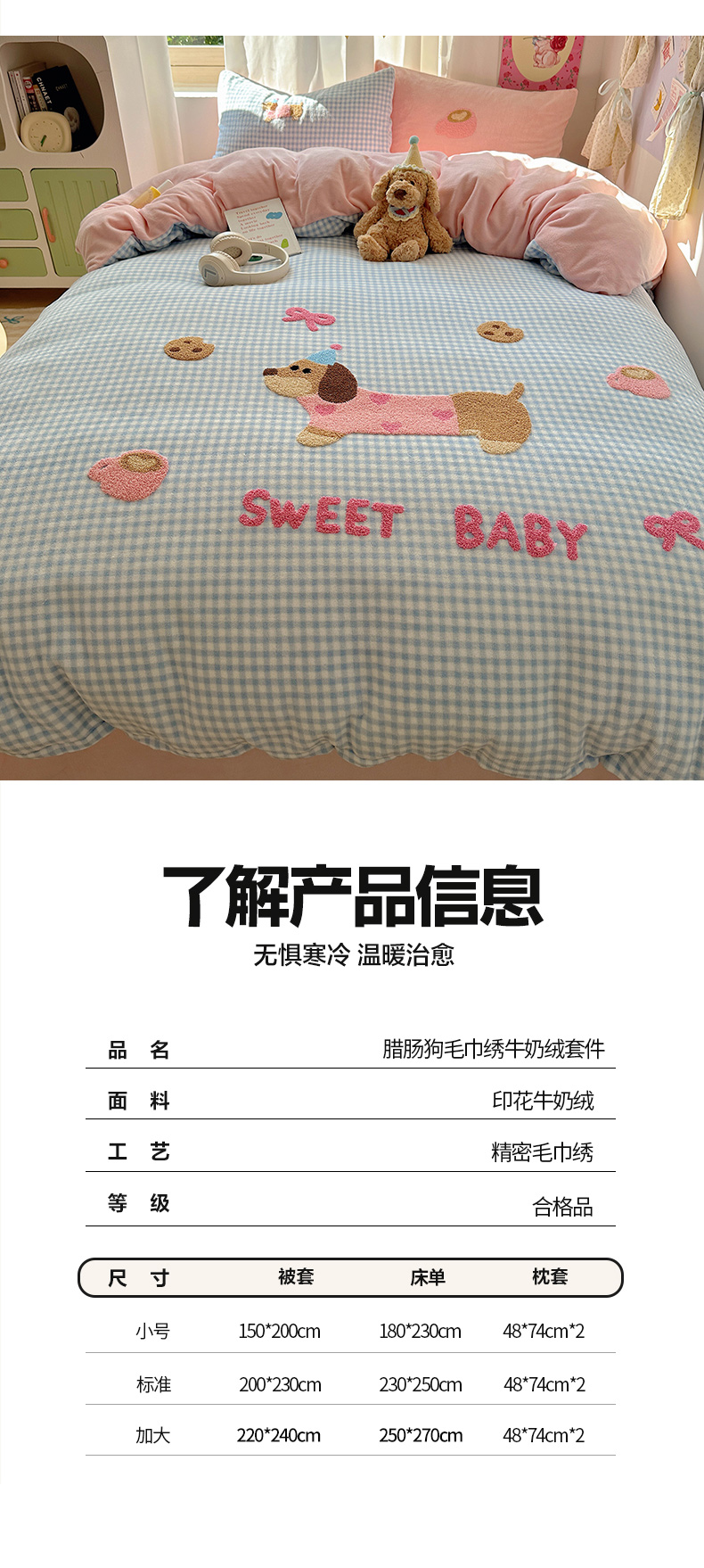 (总)顾里家纺 2024新款韩系腊肠狗毛巾绣牛奶绒四件套,粉格腊肠狗,黄格腊肠狗,咖格腊肠狗,蓝格腊肠狗,绿格腊肠狗