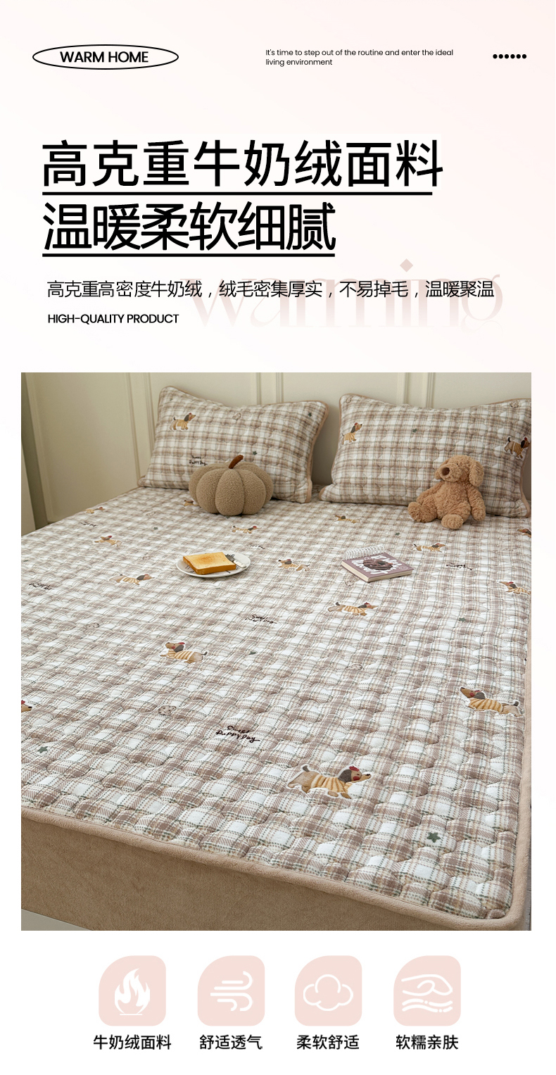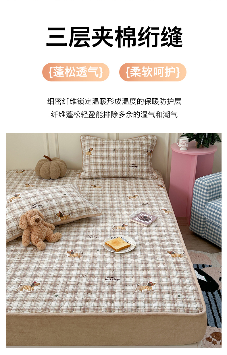 商品名称:Sweet dreams甜梦 2025新款高克重牛奶绒印花夹棉床笠 苹果腊肠狗